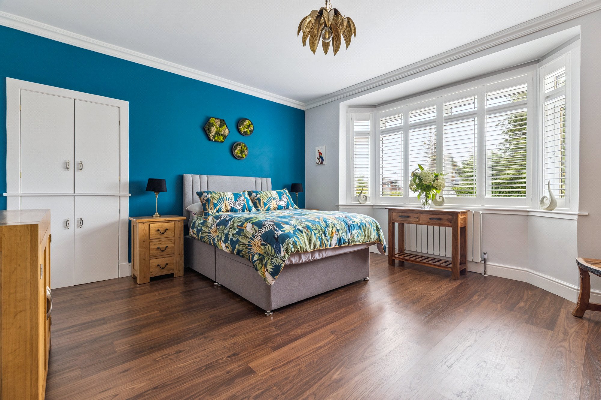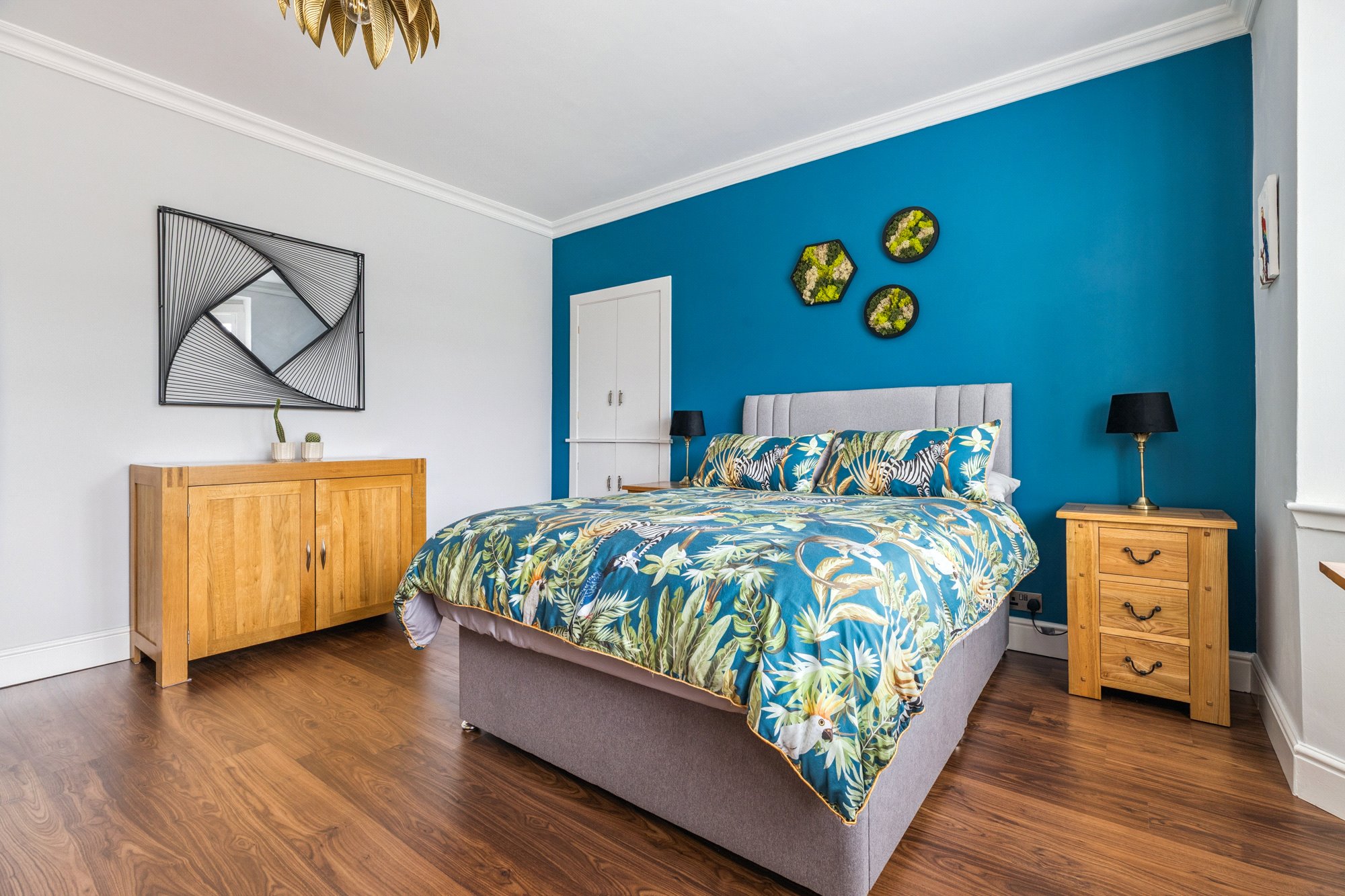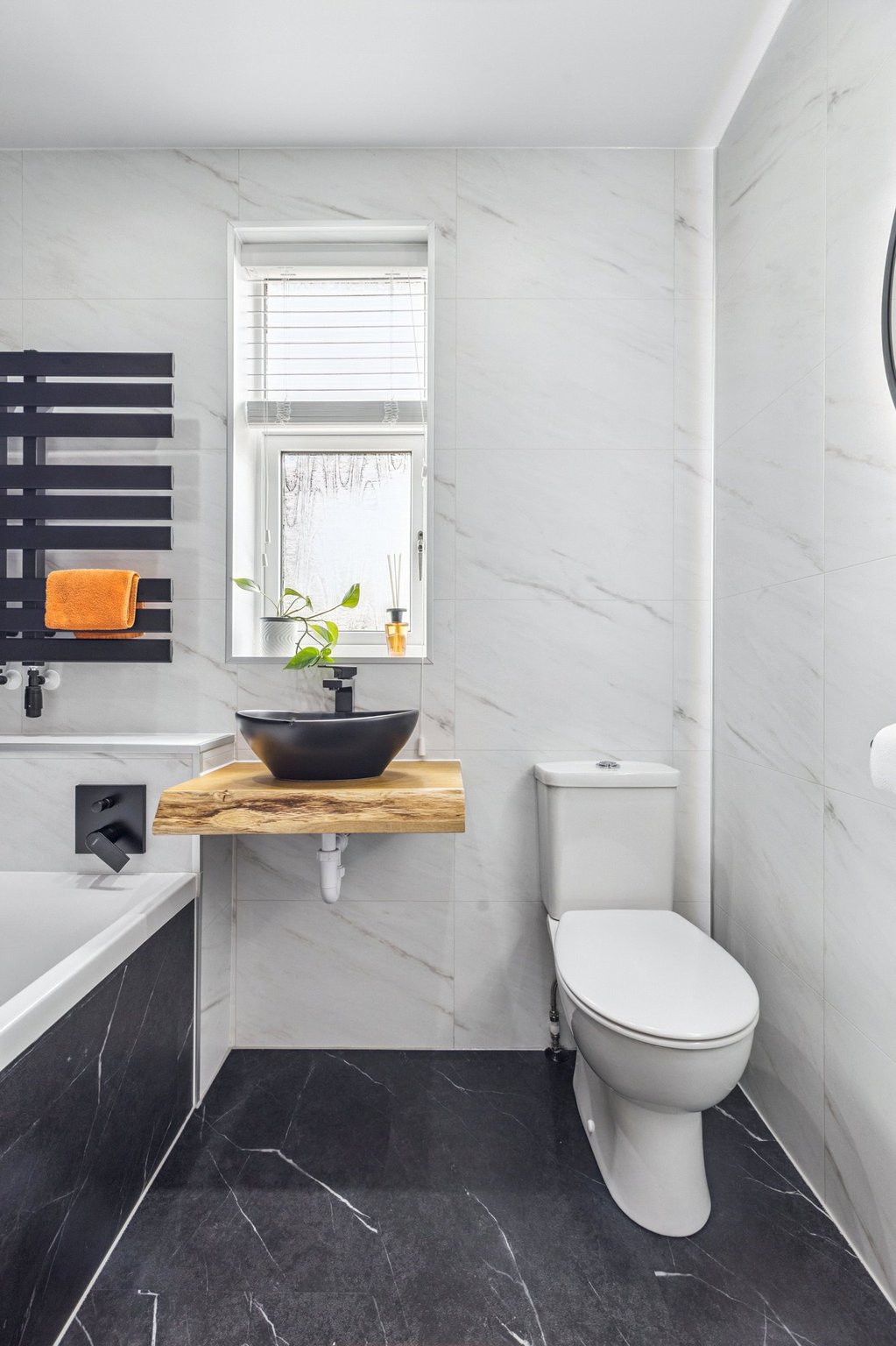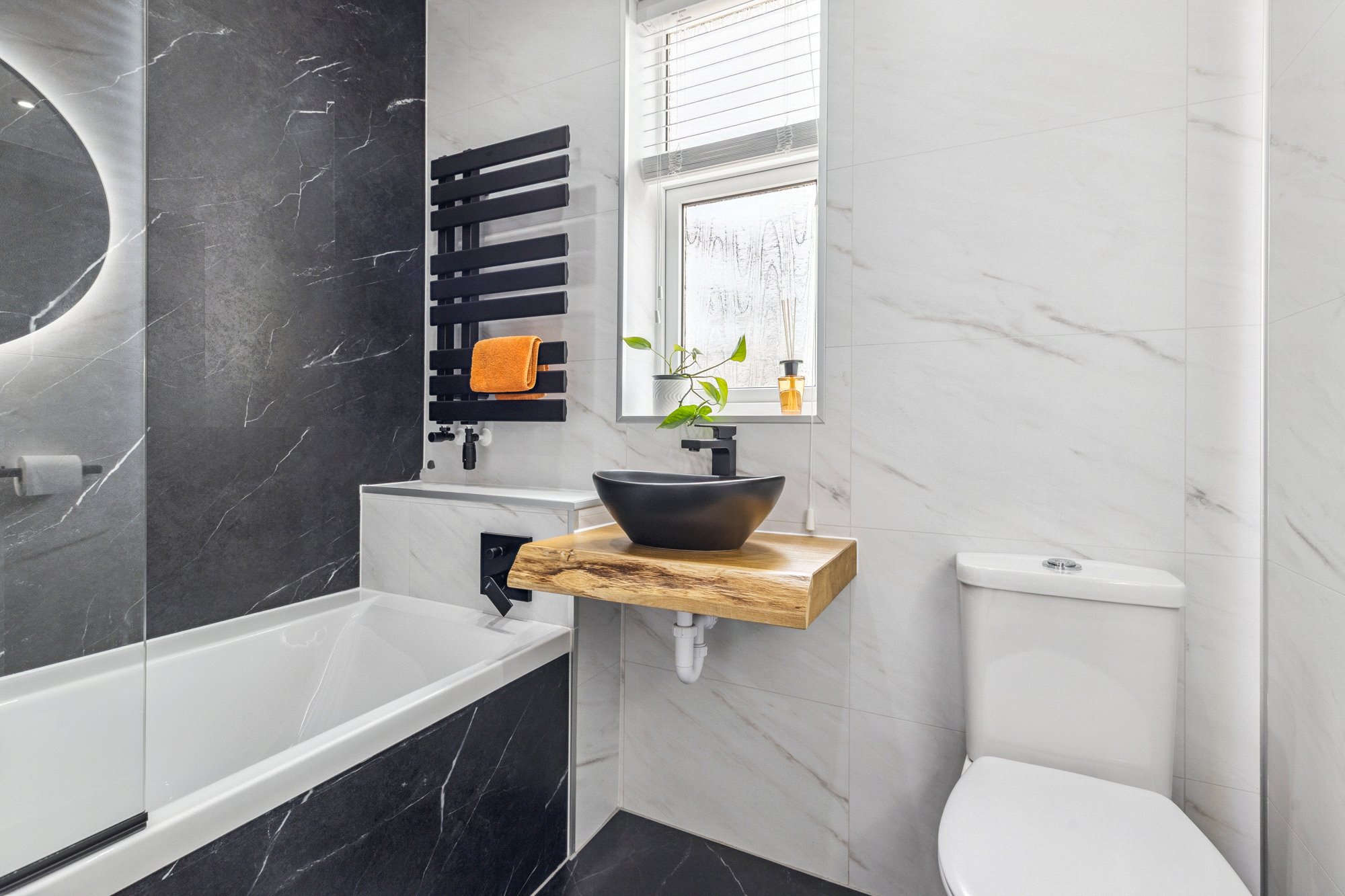 The primary bedroom is on the ground floor and broadly matches the lounge in scale and too features a wide bay window with shutter blinds. Bathroom - beautifully done with marble style wet-wall panelling in both black and white. The contemporary suite is offset by black Hansgrohe brassware and a really cool, circular, mirror with “halo” lighting (subtly changes colour). Over the bath is a powerful thermostatic shower.