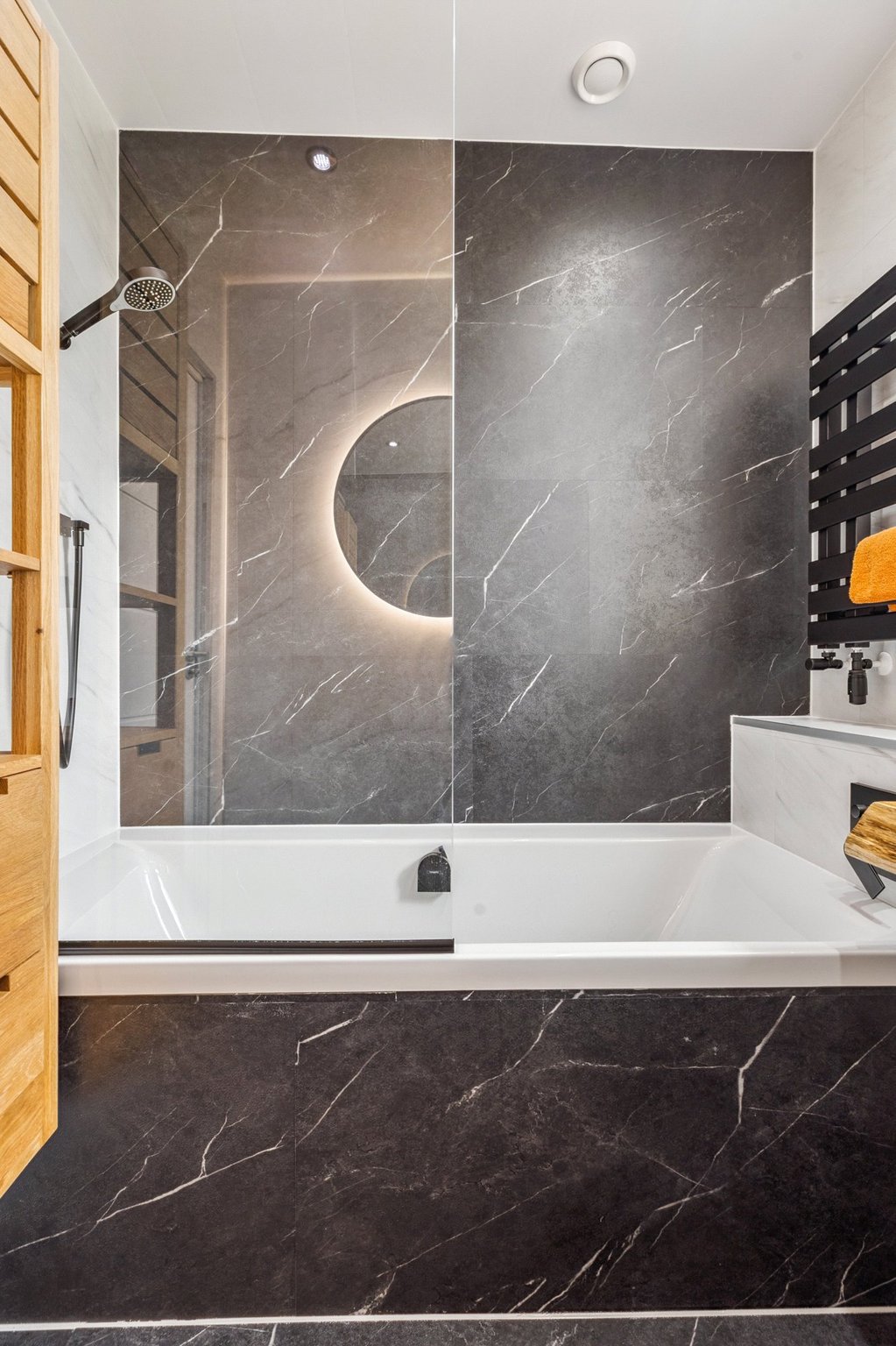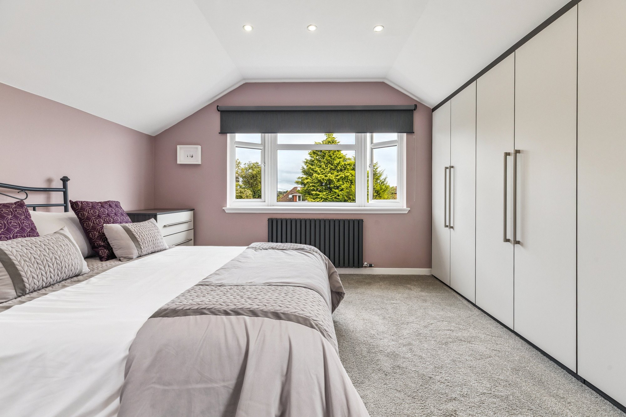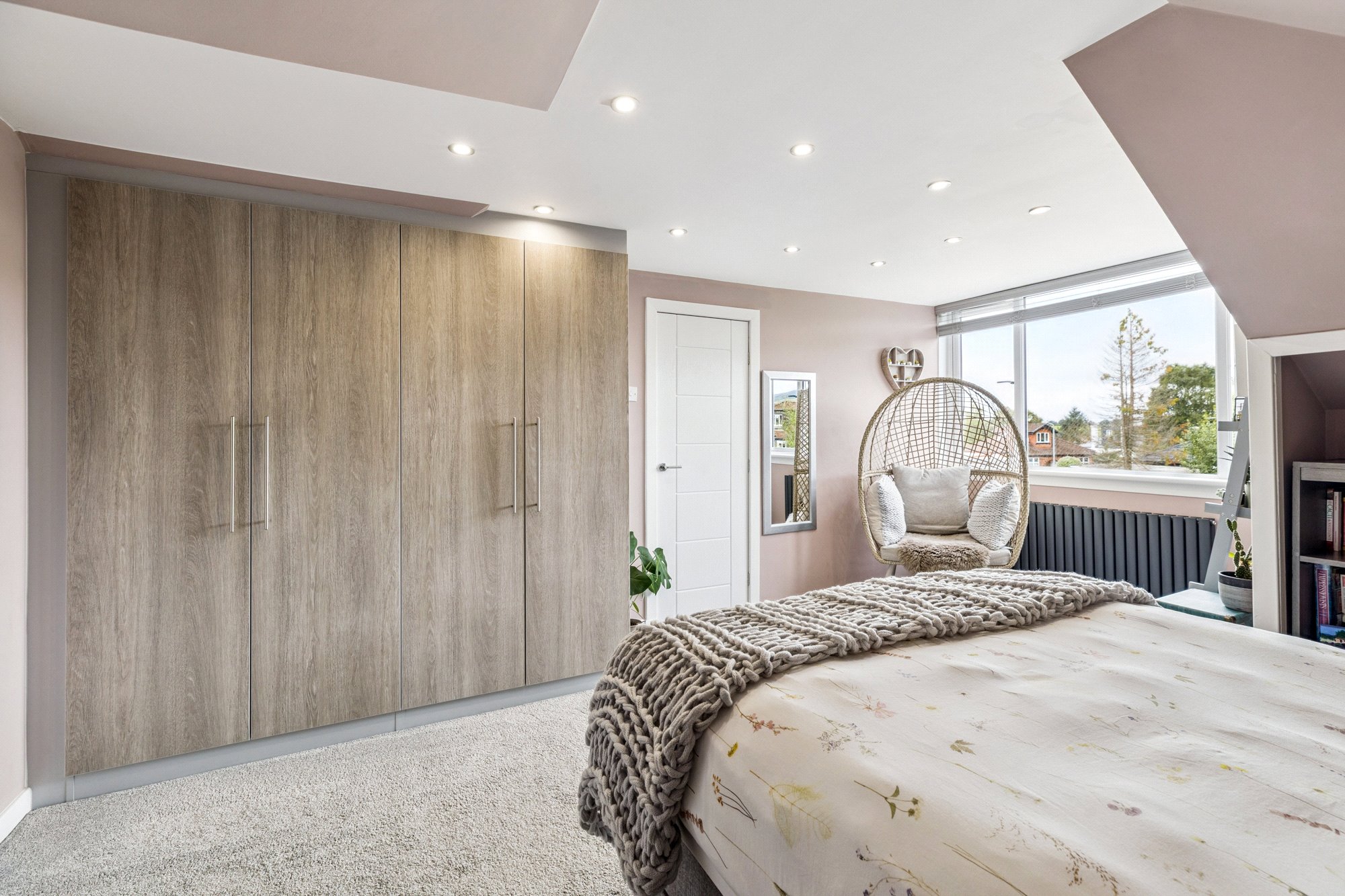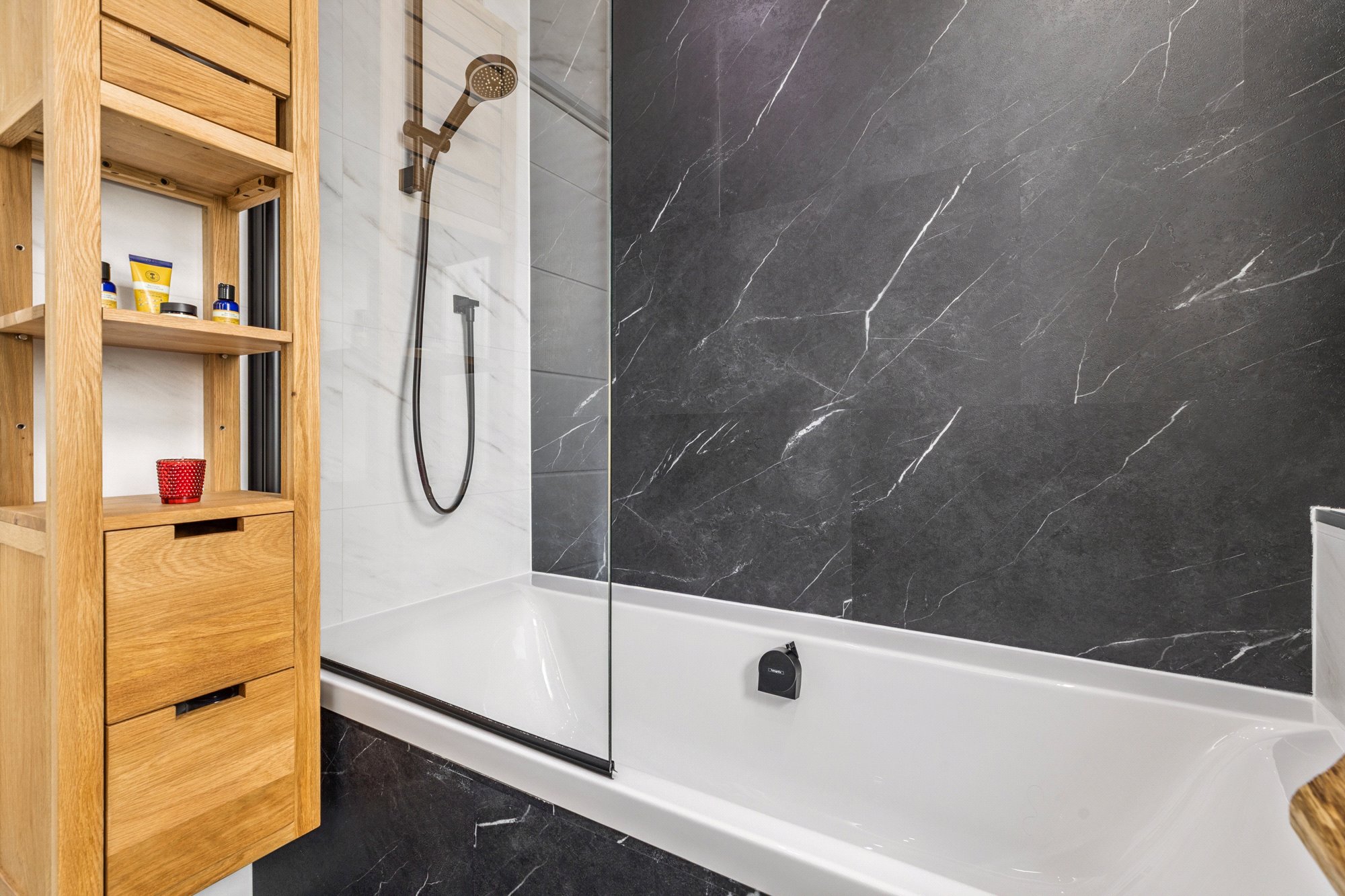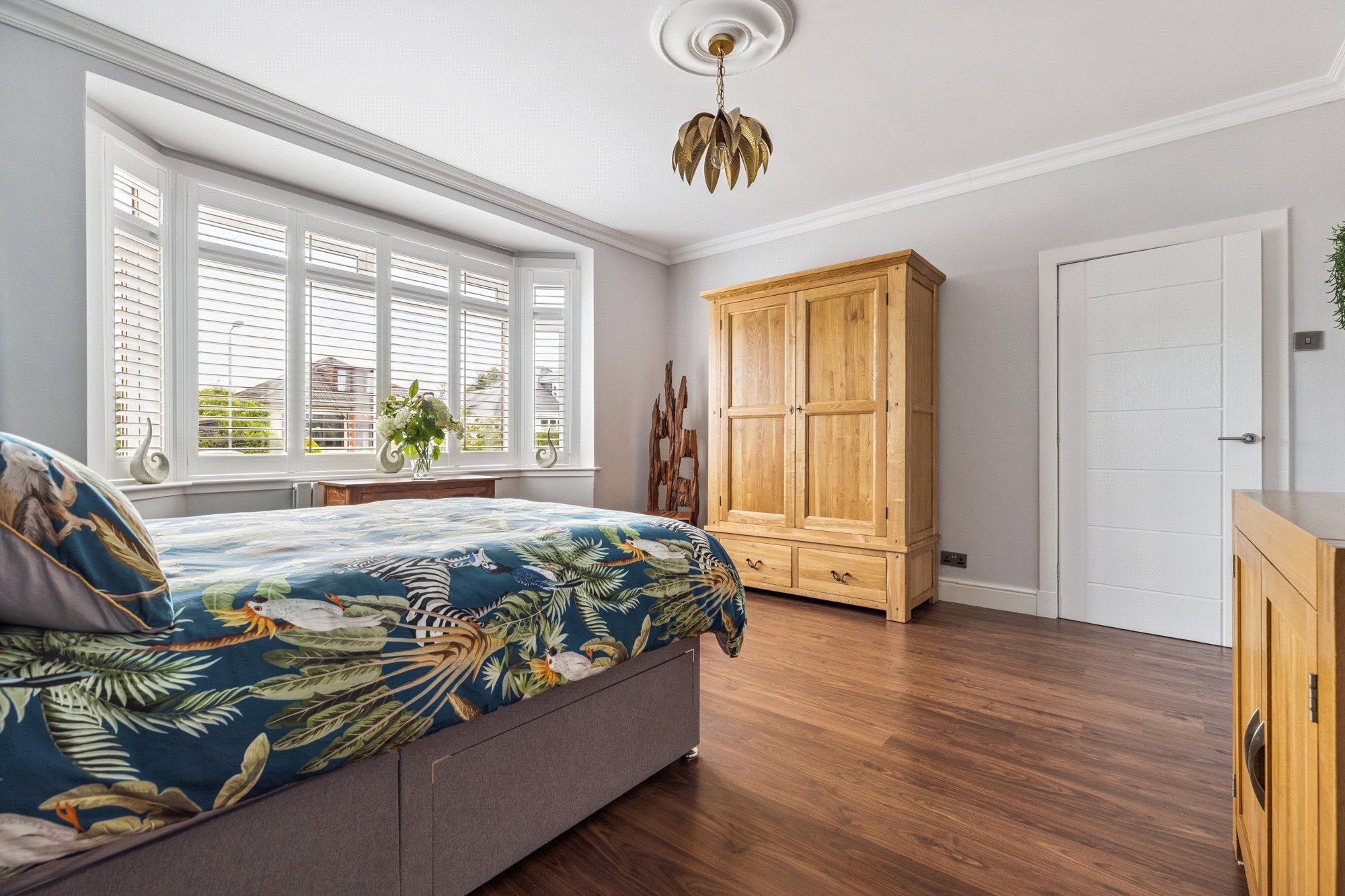 The primary bedroom is on the ground floor and broadly matches the lounge in scale and too features a wide bay window with shutter blinds. Bathroom - beautifully done with marble style wet-wall panelling in both black and white. The contemporary suite is offset by black Hansgrohe brassware and a really cool, circular, mirror with “halo” lighting (subtly changes colour). Over the bath is a powerful thermostatic shower.