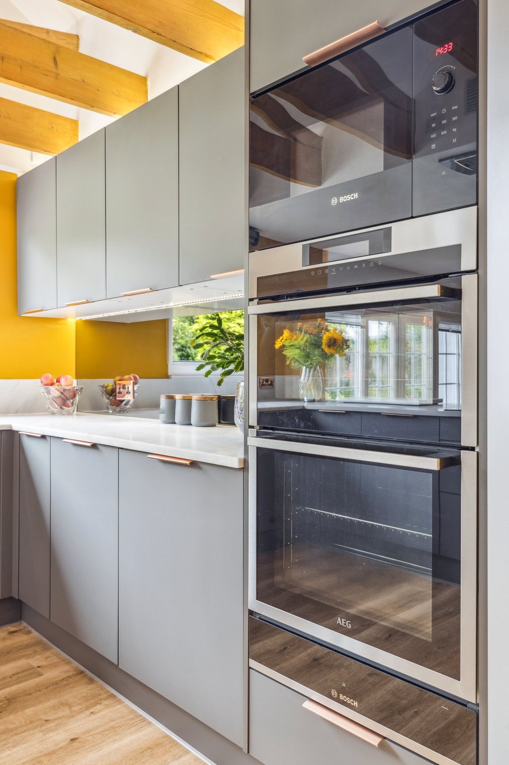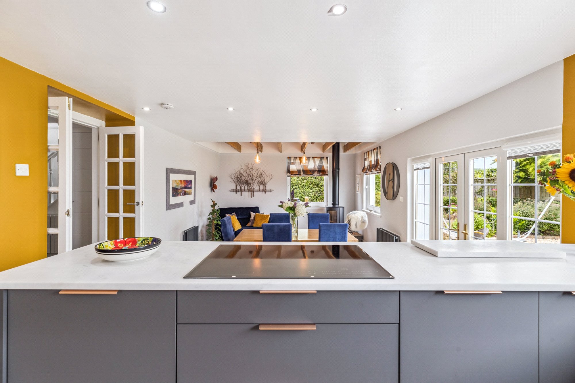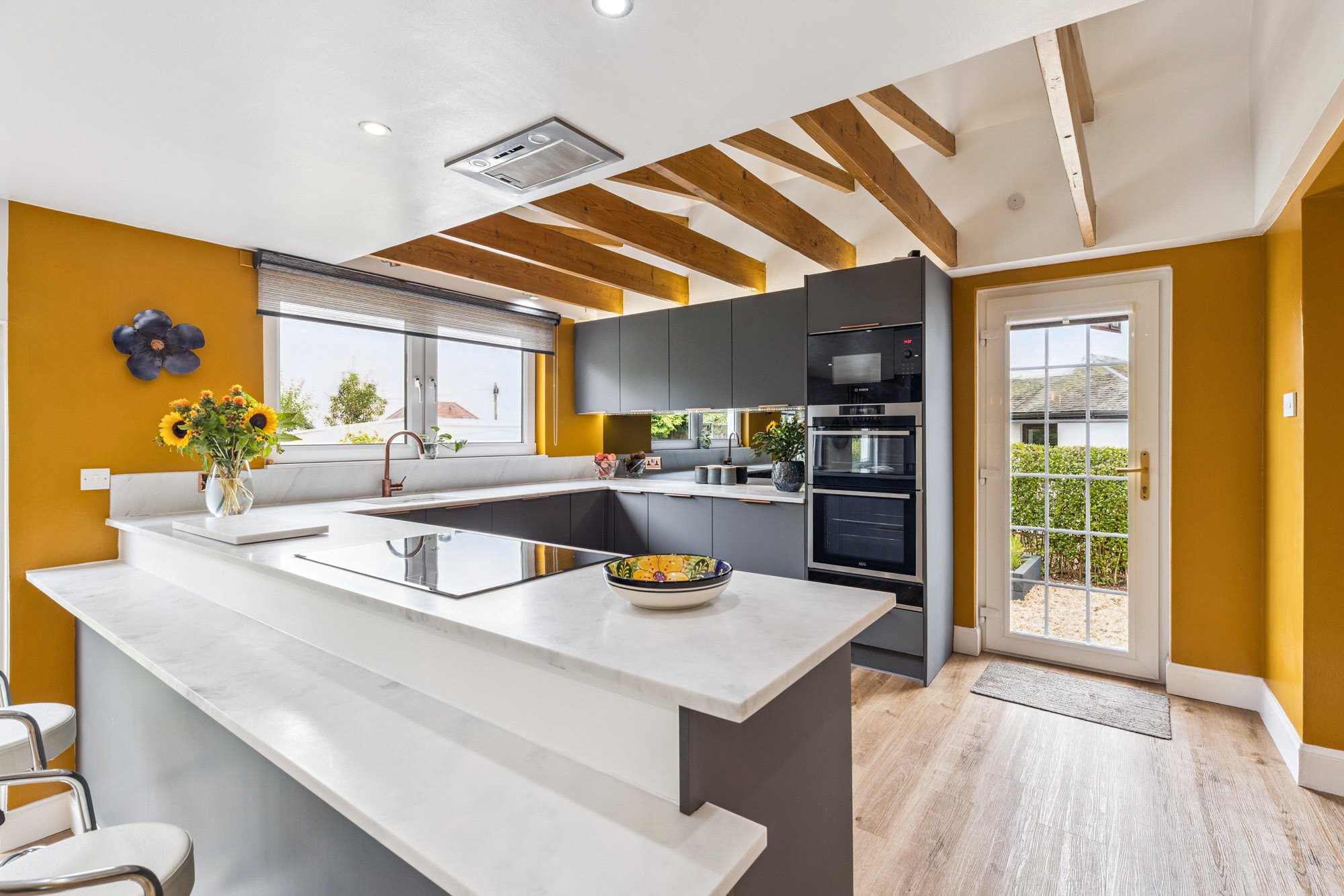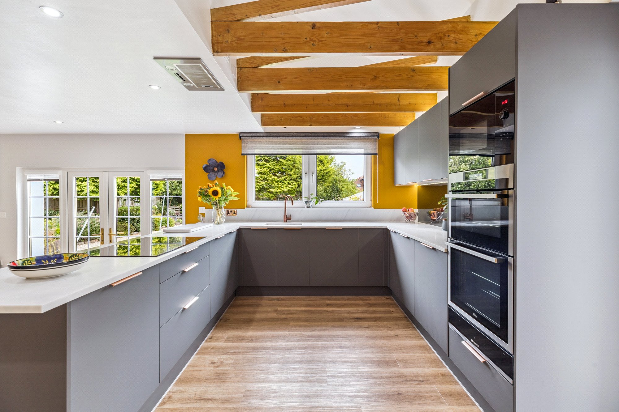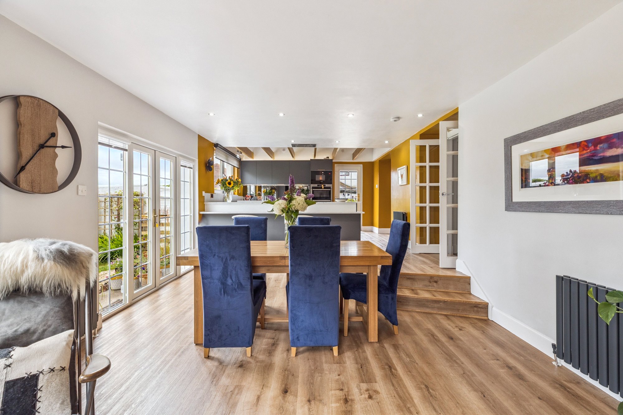 Our clients have invested significantly over recent years in a comprehensive programme of further upgrading to provide the superbly finished and appointed home seen here. A stunning kitchen, by Magnet, in a cool grey colour (Fleetwood Graphite), along with a matching utility room, makes a bold statement in the key living area of the open-plan kitchen/dining/living room.