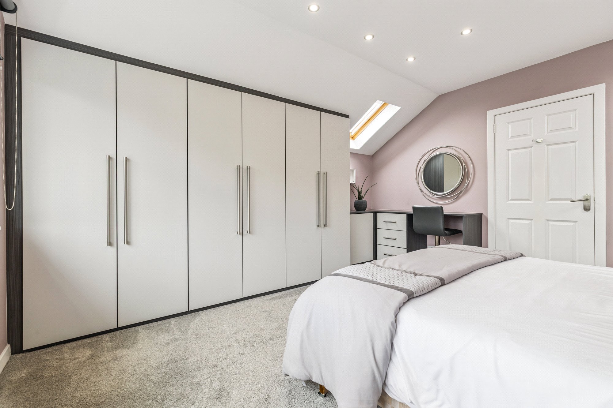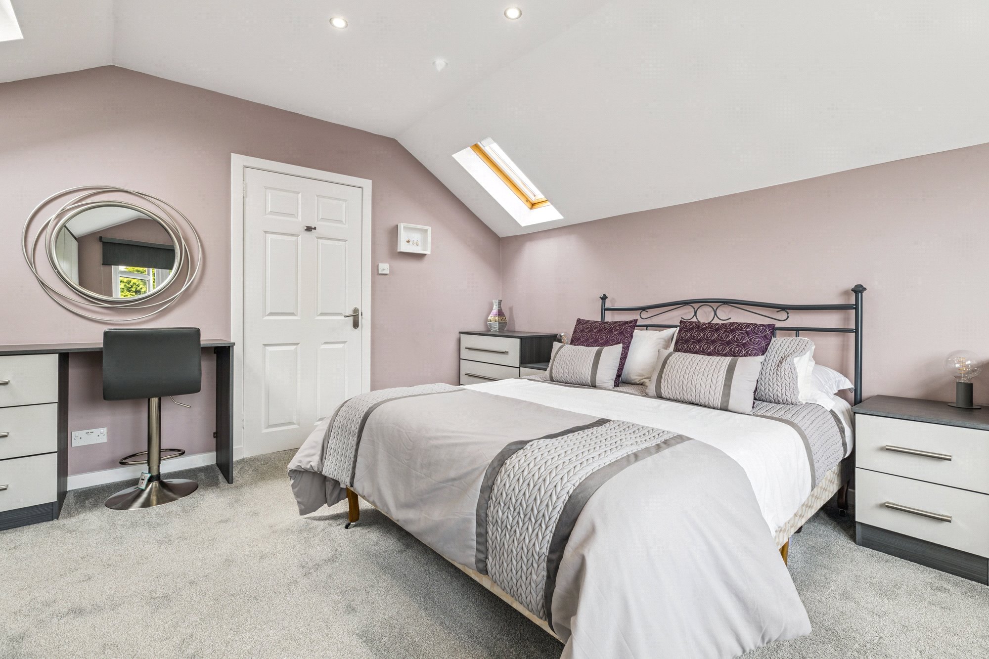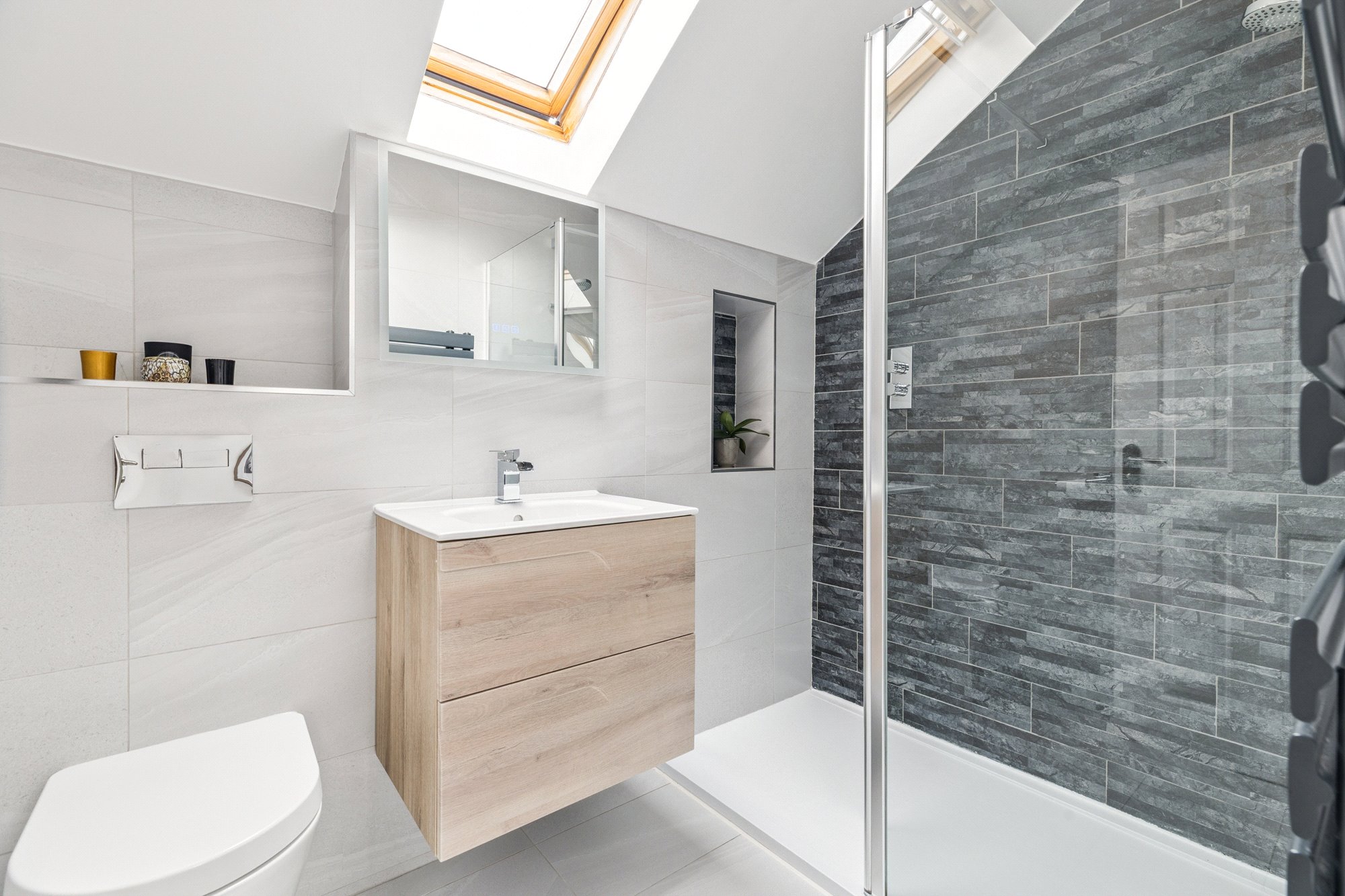 A dog-leg staircase ascends from the large entrance hall to an upper landing, illuminated by a modern Velux window. There are two fine double bedrooms here, both featuring quality modern bedroom furniture. Ensuite to bedroom 3 is a very useful boxroom, with skylight window, with fitted shelving unit that matches the fitted furniture of the bedroom. To service these two bedrooms is a fully tiled shower room, with Velux, featuring an oversized shower enclosure with a further powerful thermostatic shower and a “floating” whb/vanity unit.