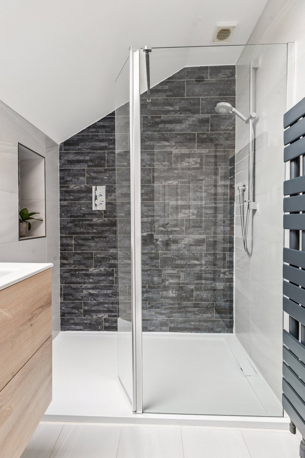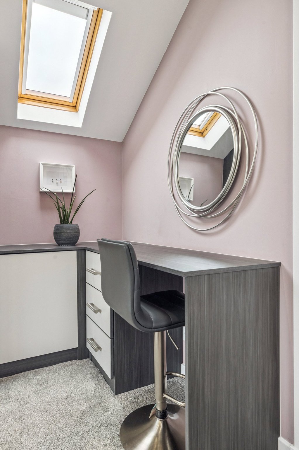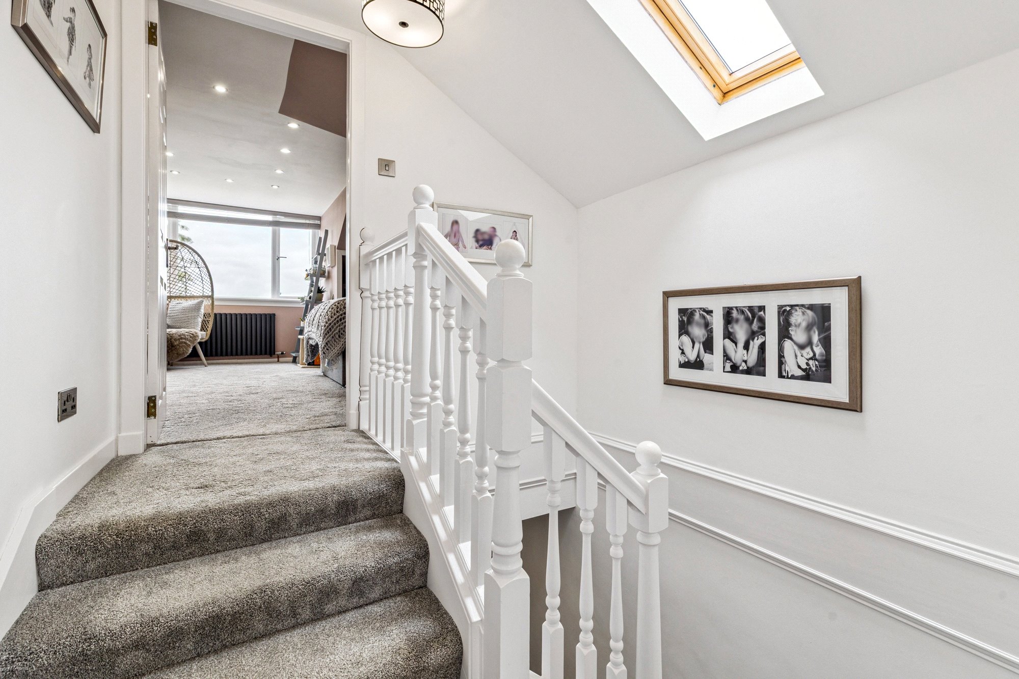 A dog-leg staircase ascends from the large entrance hall to an upper landing, illuminated by a modern Velux window. There are two fine double bedrooms here, both featuring quality modern bedroom furniture. Ensuite to bedroom 3 is a very useful boxroom, with skylight window, with fitted shelving unit that matches the fitted furniture of the bedroom. To service these two bedrooms is a fully tiled shower room, with Velux, featuring an oversized shower enclosure with a further powerful thermostatic shower and a “floating” whb/vanity unit.