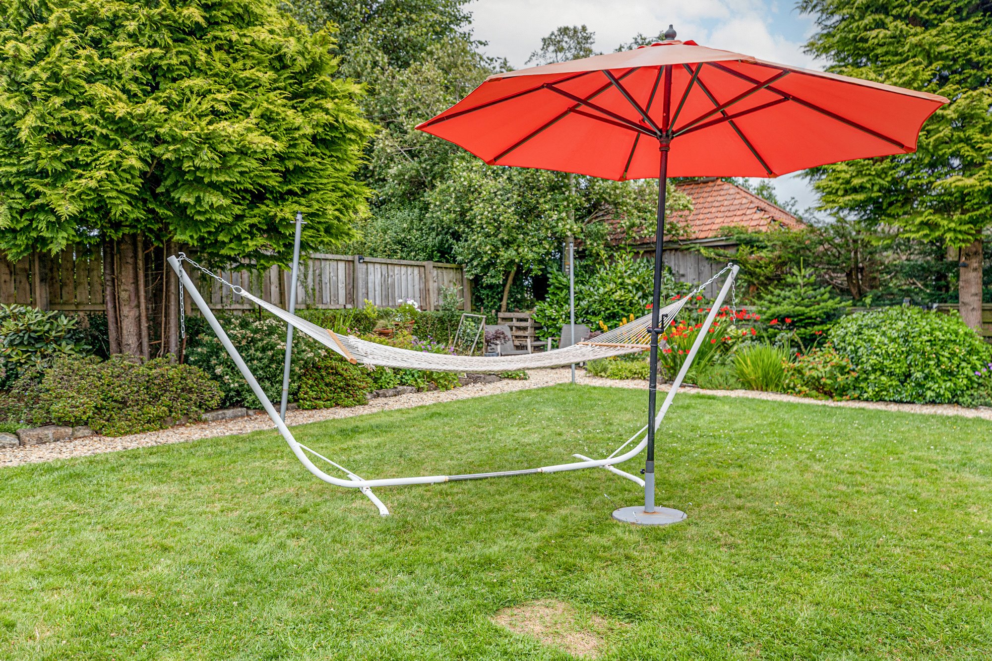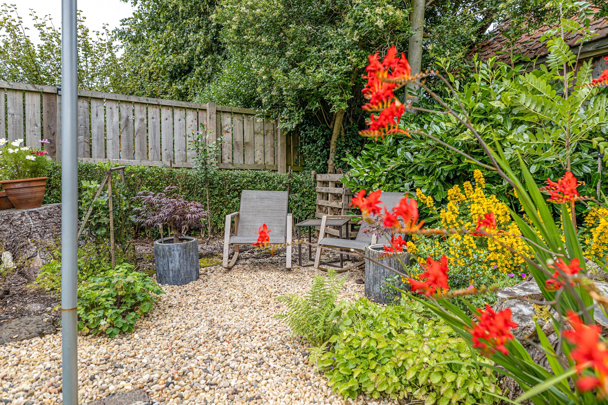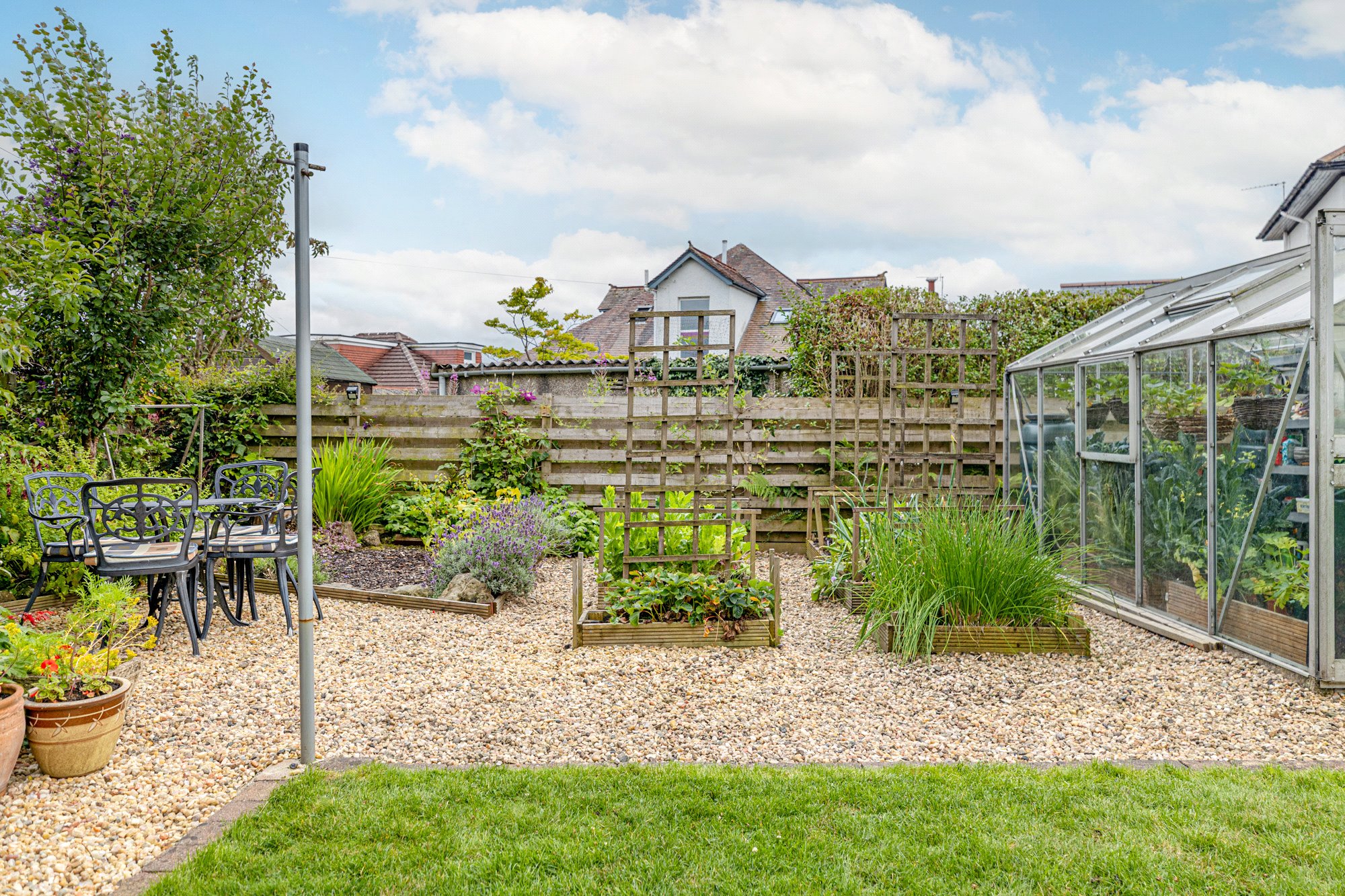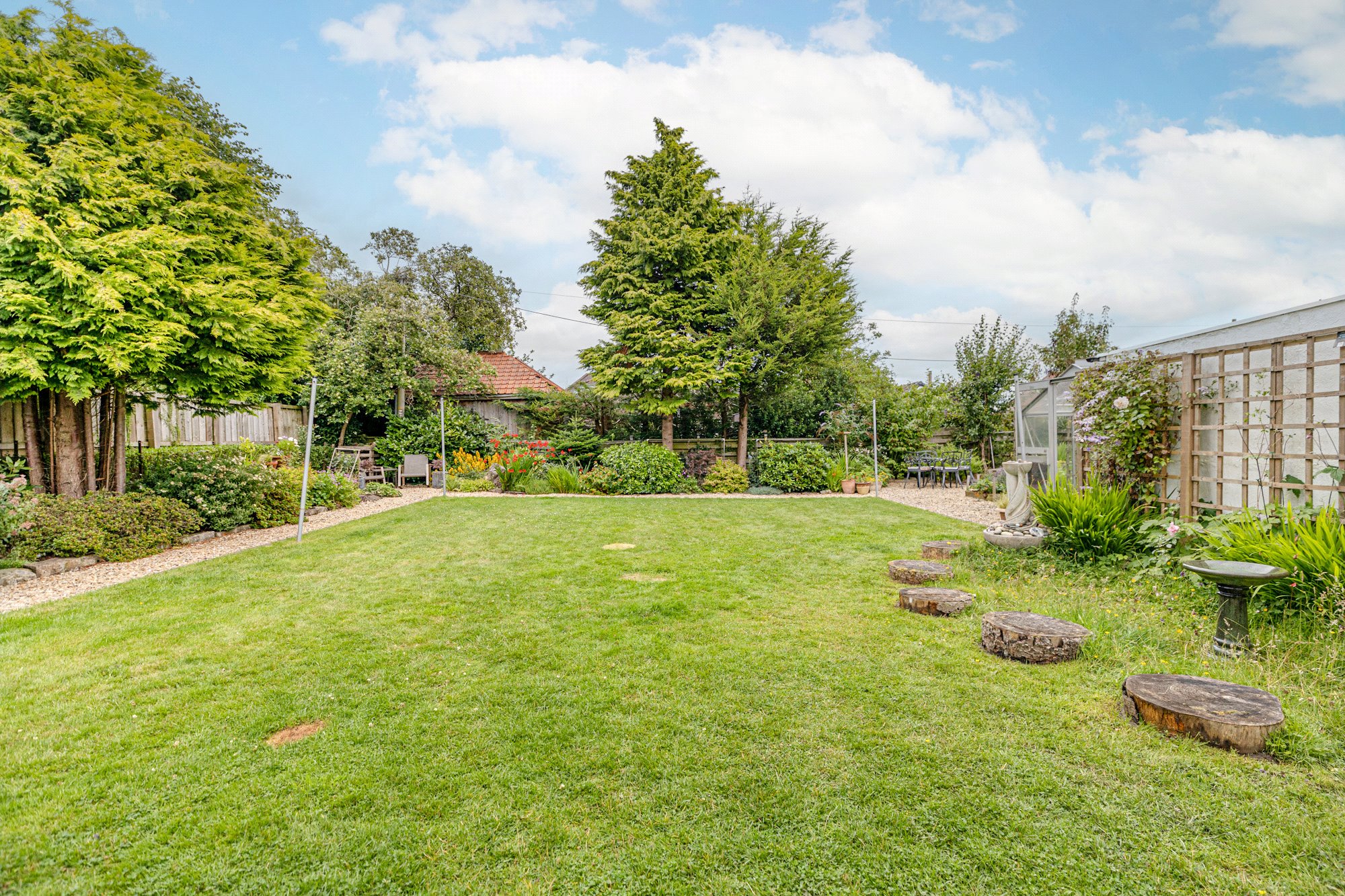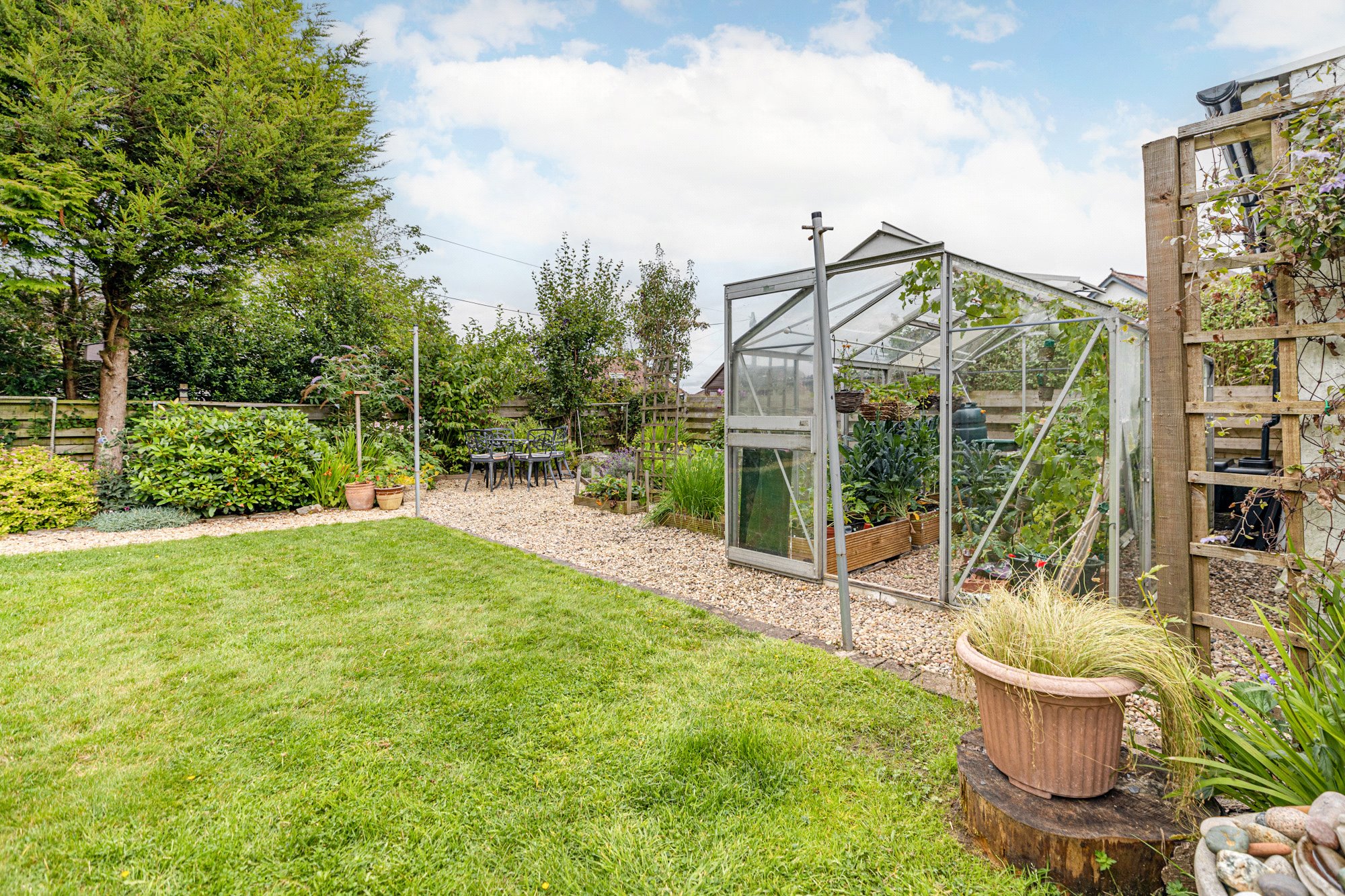 The house has a generous, level, plot. Most lies to the rear where a large central lawn is flanked by gravel paths and two well planted shrub beds. In the southeast corner, behind the double garage, is a productive garden and a greenhouse. All is enclosed by hedges/fences and is gated. The front garden has a low-level garden wall to the pavement behind which is a lawn with peripheral beds. The wide, and long, gravel driveway provides off street parking for several cars.