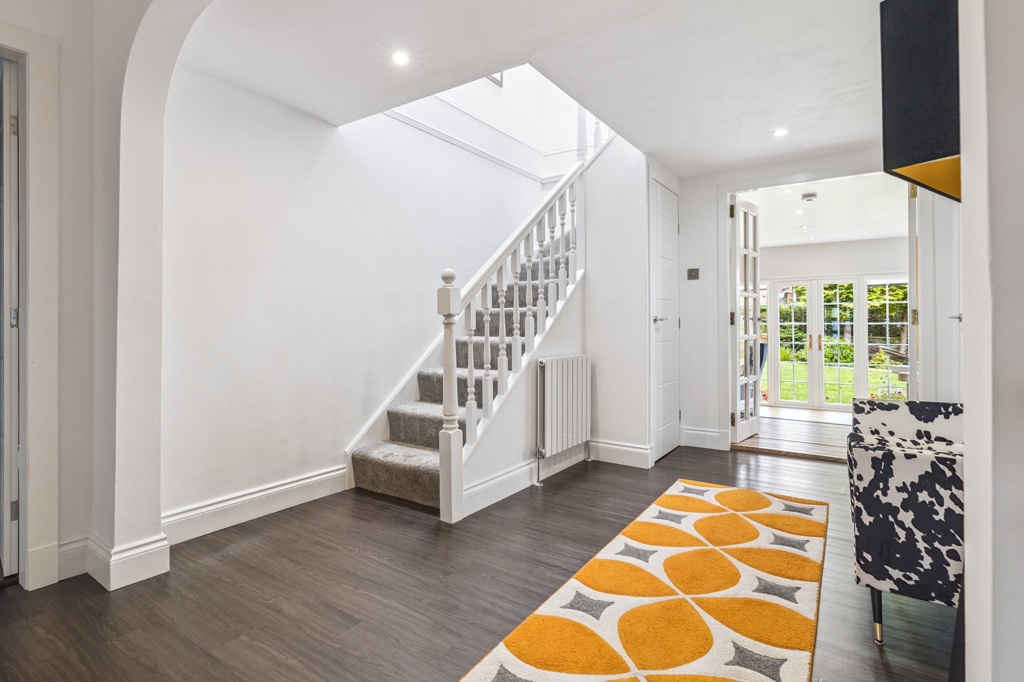 Entrance vestibule. A generous sized reception hall with three storage cupboards. Lounge with wide bay window featuring white, New England style, vinyl shutter blinds. Family TV room (or 4th bedroom if needed). The key living space - the open plan kitchen/dining/living room which features exposed roof beams and is arranged on a split-level basis, kitchen to the dining/living room. The colour of the Magnet units is offset by lovely marble solid resin worktops and a striking black mirrored glass wall splashback. Integrated appliances include - induction hob with a ceiling mounted extractor hood above, two ovens, microwave, warming drawer, dishwasher. An adjacent utility room is identically finished to the kitchen and includes a fitted, double-width, larder cupboard.
