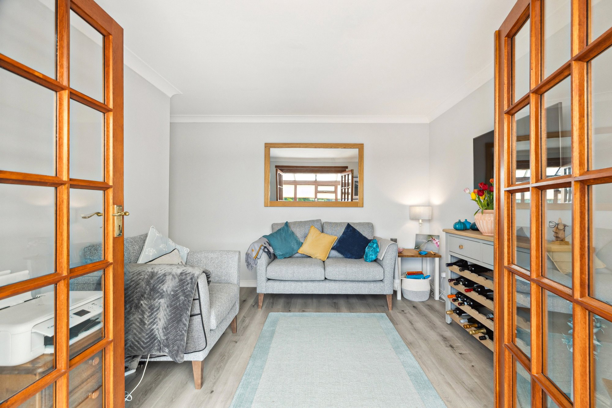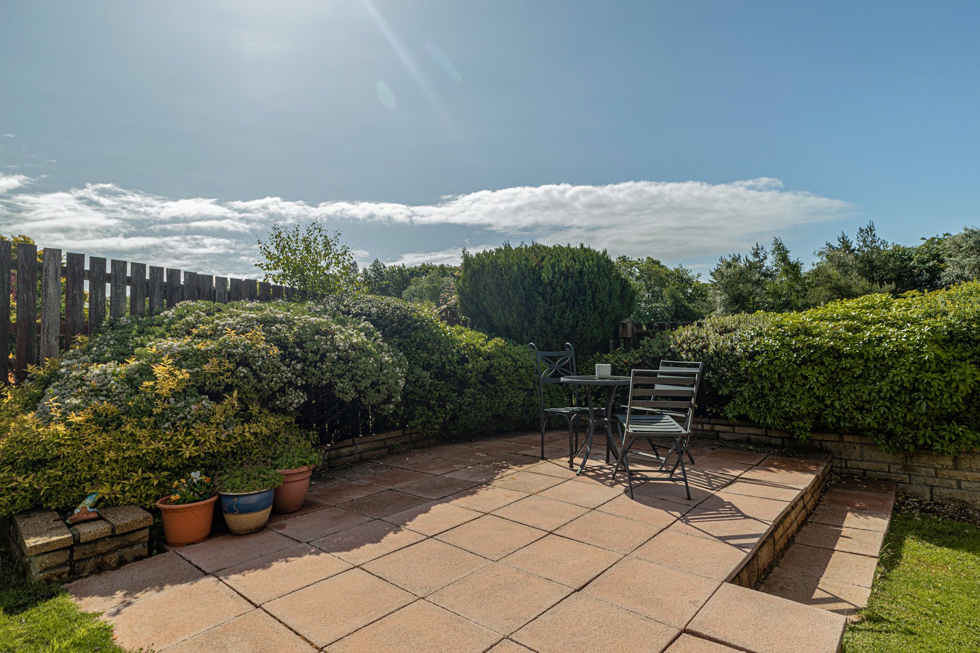 Gardens to the front include an area of grass and a double width monobloc driveway leading to the property’s garage (power & light). To the easterly side of the house is a timber garden shed.