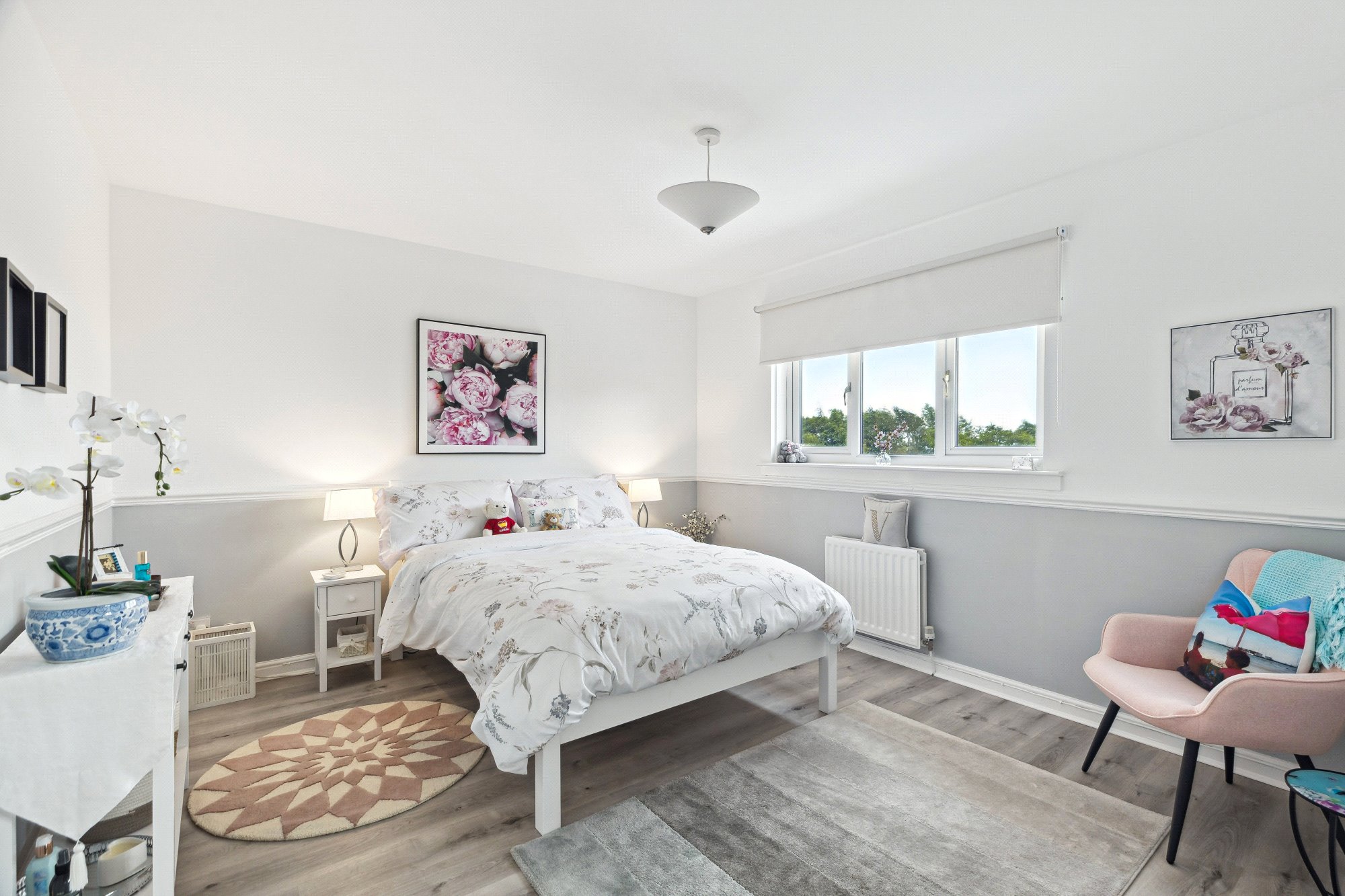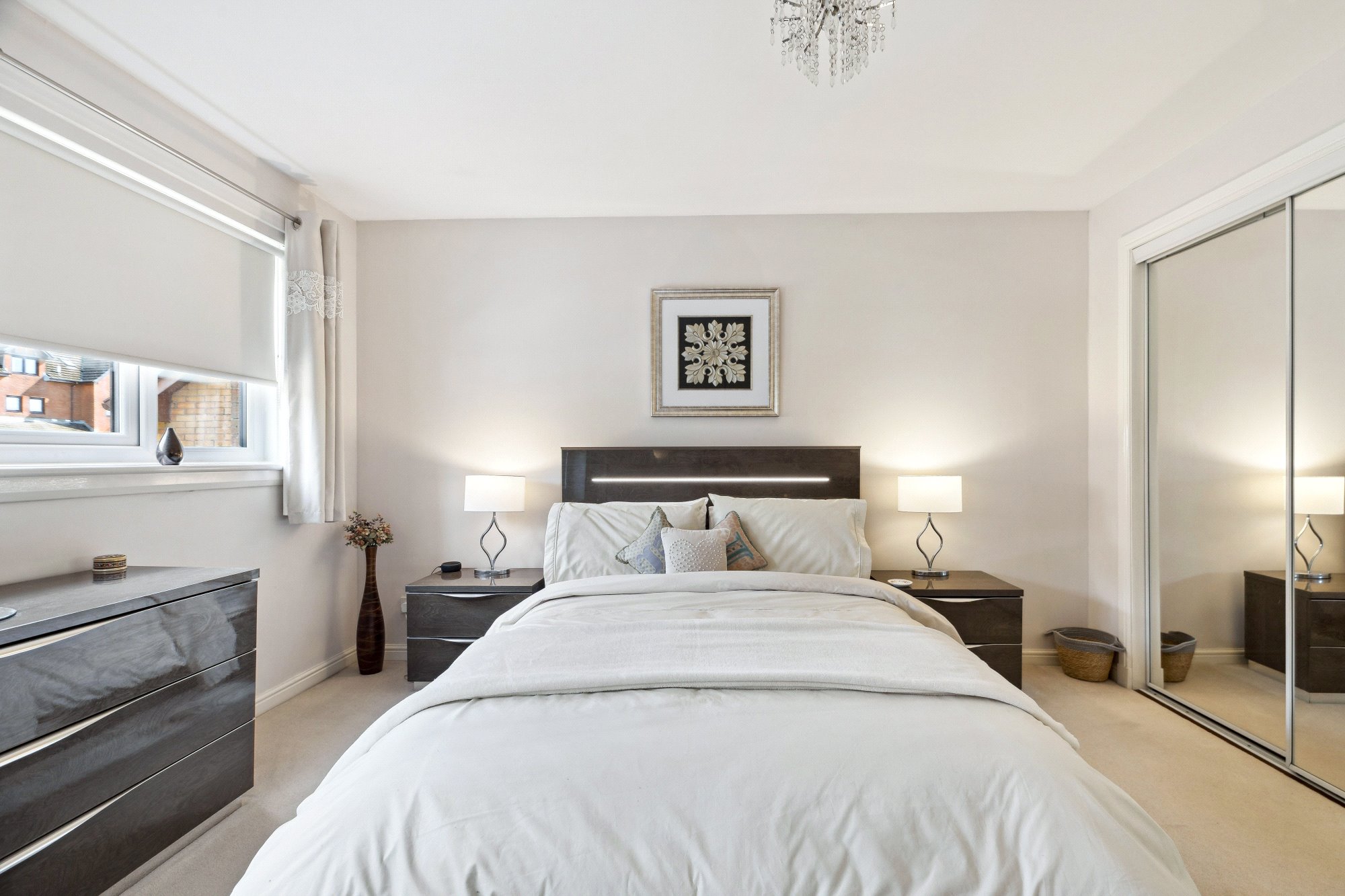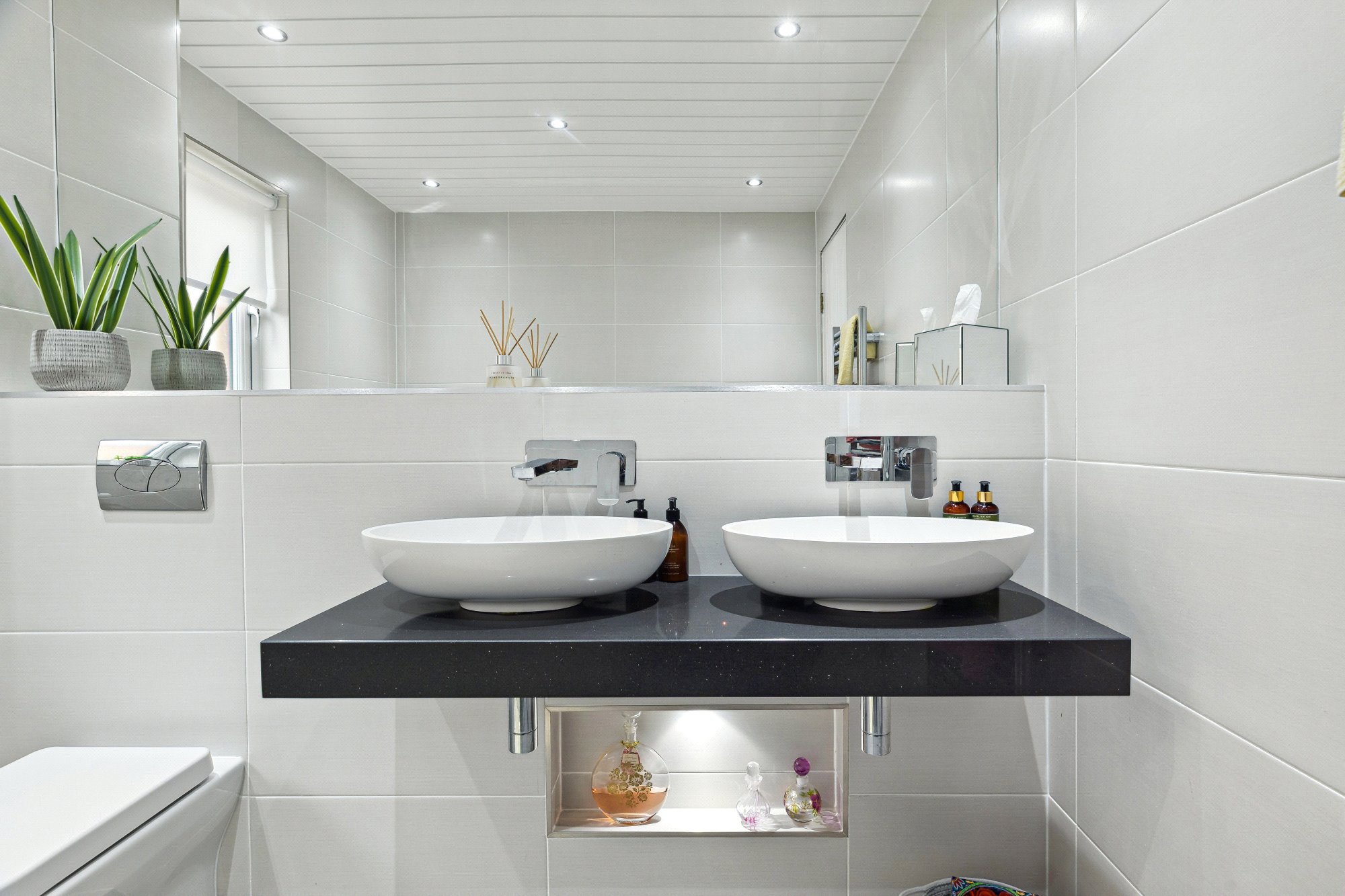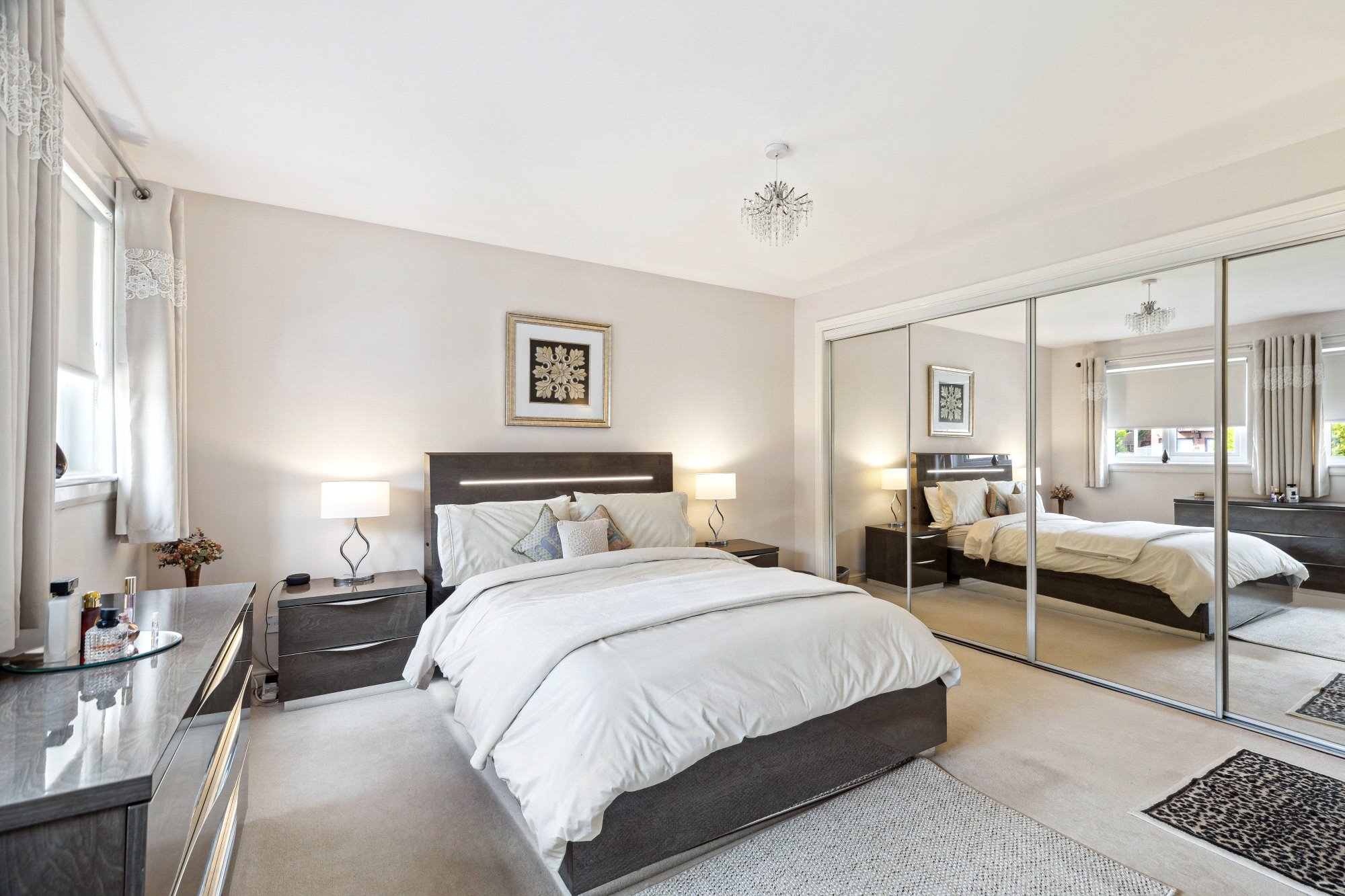 The upper level of the house provides the accommodation for the property’s four bedrooms, the bathroom and the en-suite. Firstly, there is the primary bedroom, a large bedroom with two twin-framed windows to the front and a full wall of mirrored wardrobes. Ensuite shower room with a large corner shower enclosure with thermostatic shower with both deluge and handheld showerheads. Bedrooms two and three are both doubles, with bedroom two a particularly generous room, and both bedrooms provide an outstanding, southerly, outlook to the rear across Glasgow. Both have wardrobe provision. Completing the accommodation is bedroom four which would ordinarily be a single room but has been made into a dressing room with a run of fitted wardrobes with sliding doors along a wall. Bathroom - superbly done and including an oval shaped, free standing, bath, a floating vanity surface on which is both his and her basins.