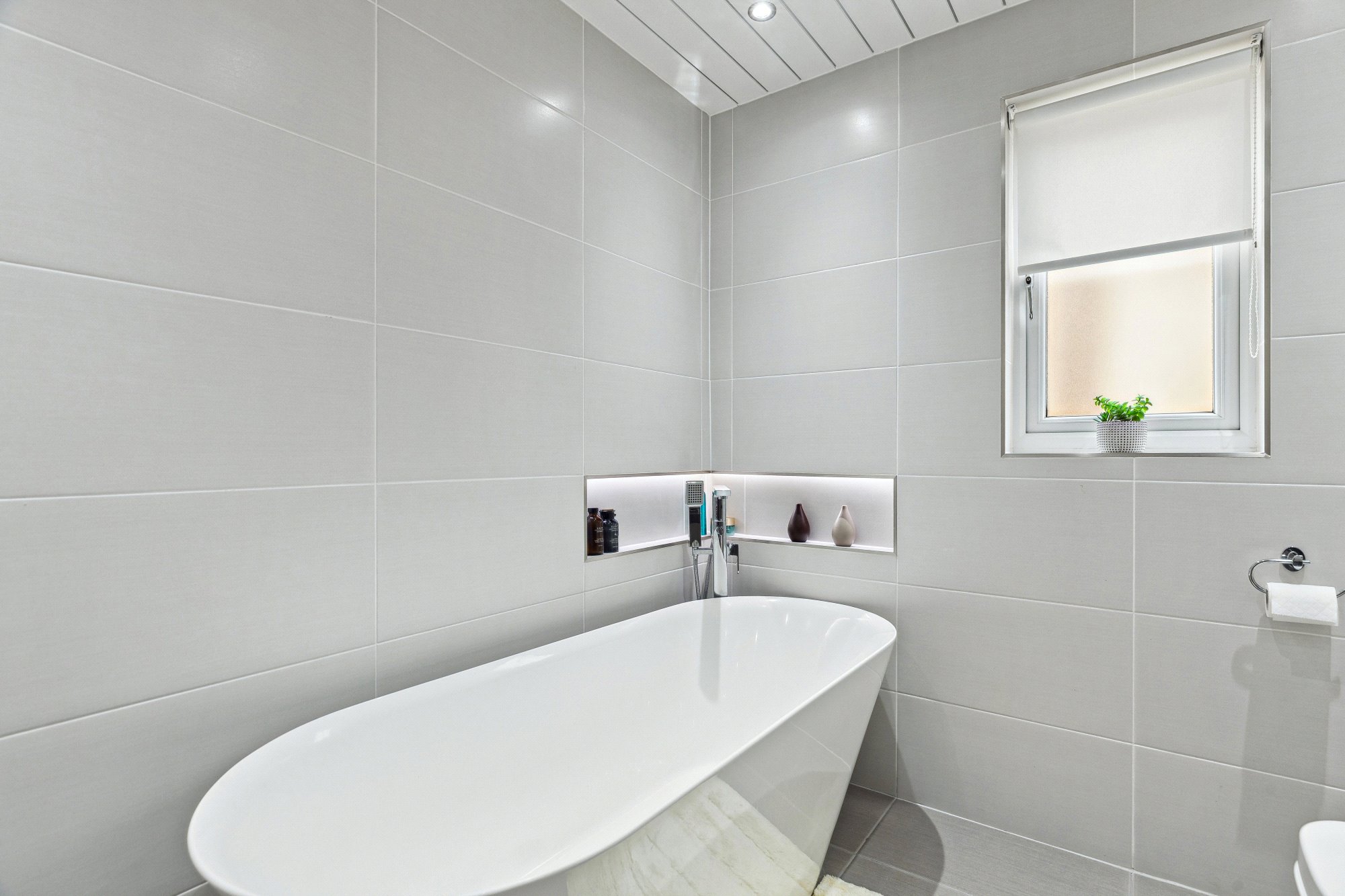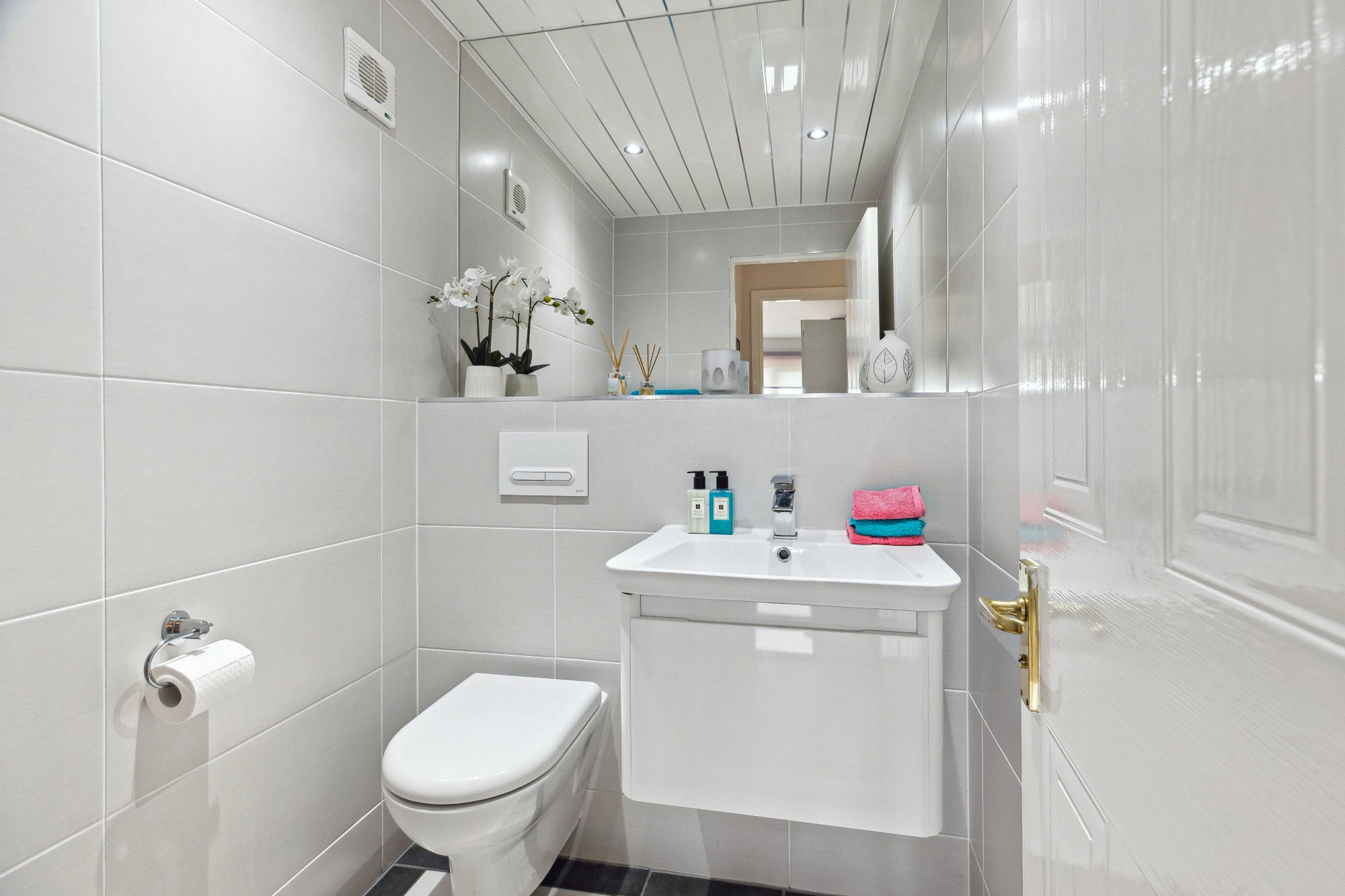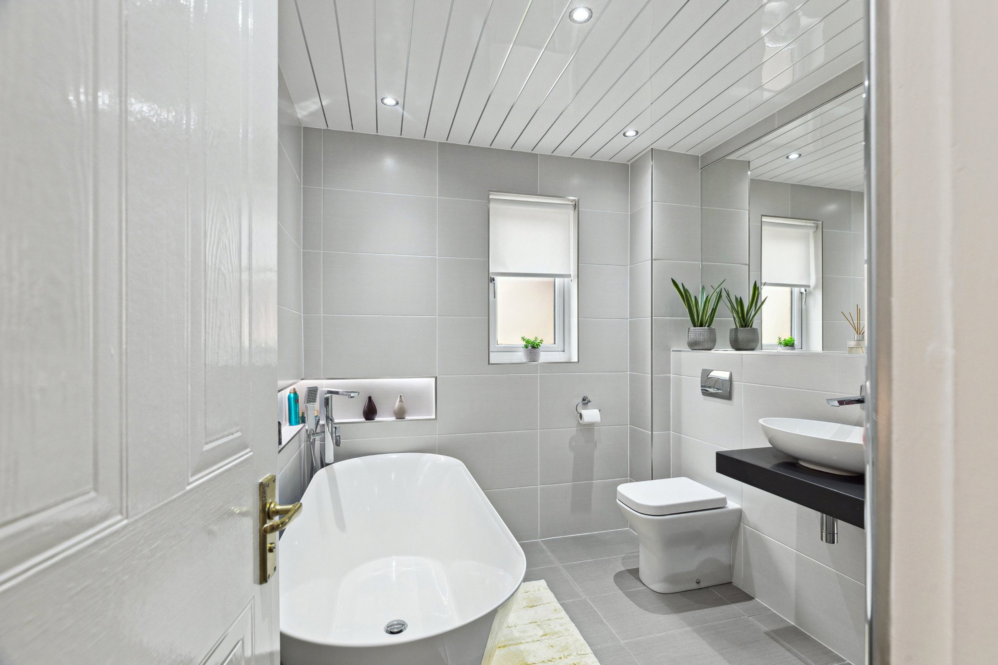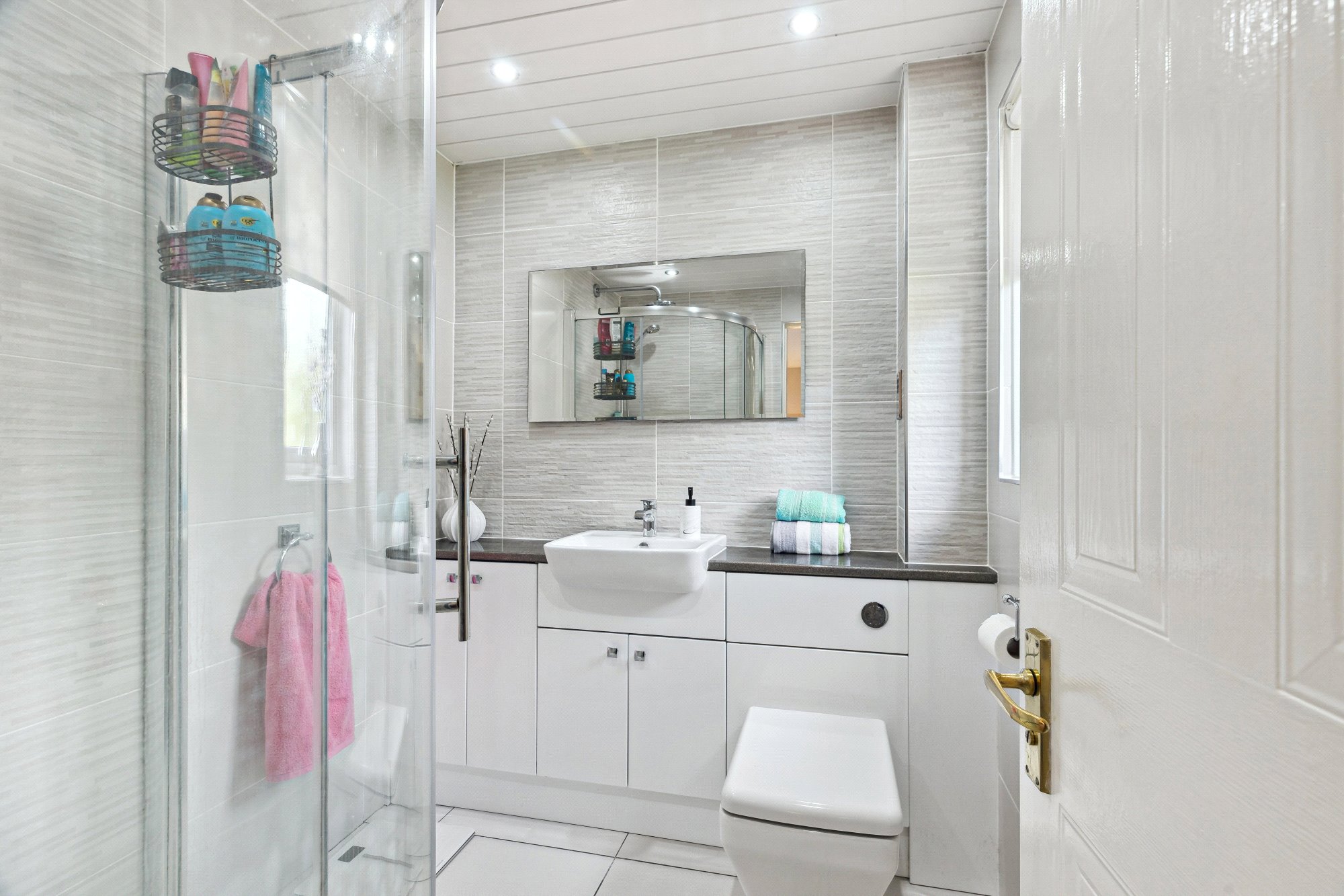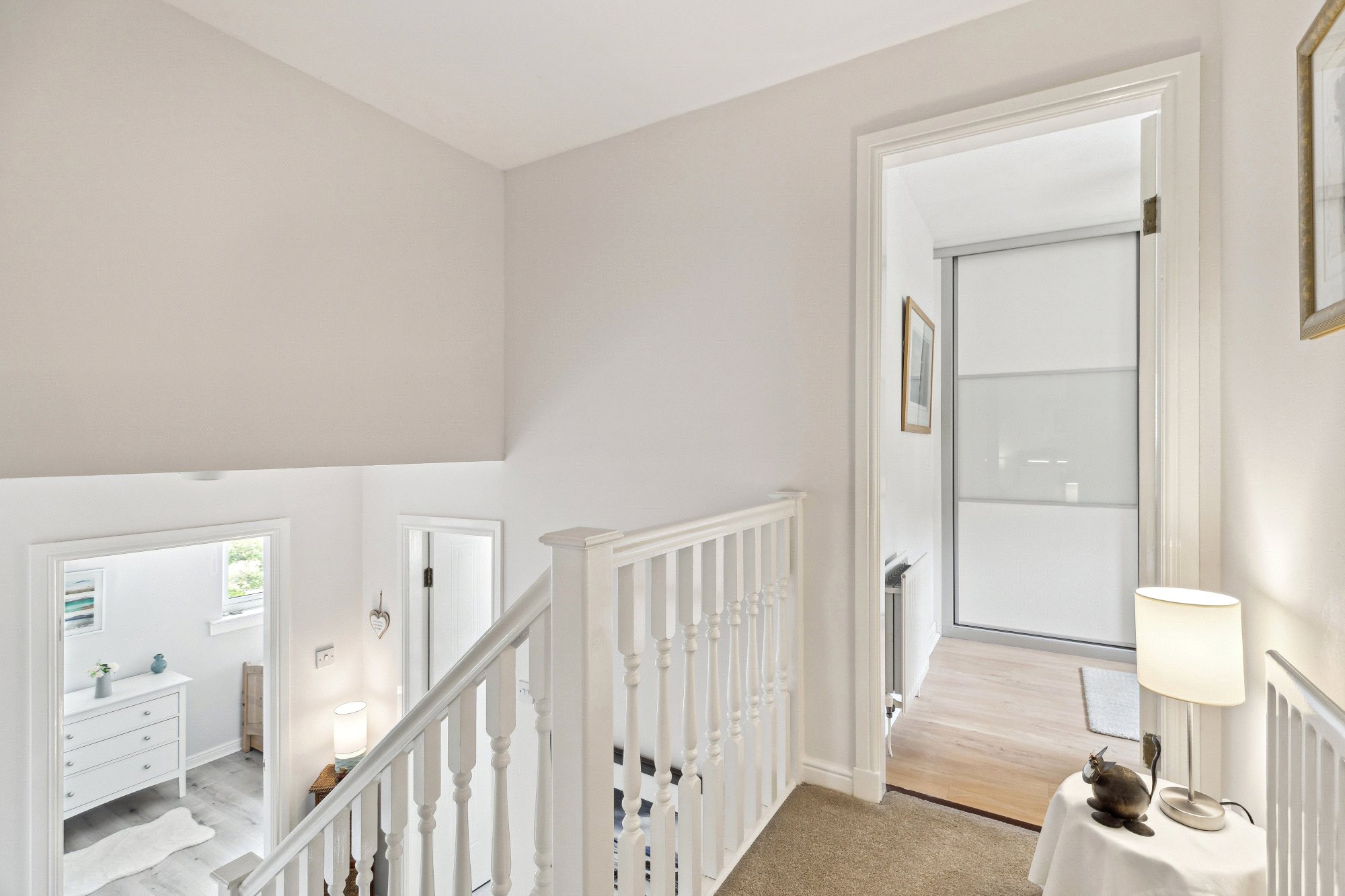 The upper level of the house provides the accommodation for the property’s four bedrooms, the bathroom and the en-suite. Firstly, there is the primary bedroom, a large bedroom with two twin-framed windows to the front and a full wall of mirrored wardrobes. Ensuite shower room with a large corner shower enclosure with thermostatic shower with both deluge and handheld showerheads. Bedrooms two and three are both doubles, with bedroom two a particularly generous room, and both bedrooms provide an outstanding, southerly, outlook to the rear across Glasgow. Both have wardrobe provision. Completing the accommodation is bedroom four which would ordinarily be a single room but has been made into a dressing room with a run of fitted wardrobes with sliding doors along a wall. Bathroom - superbly done and including an oval shaped, free standing, bath, a floating vanity surface on which is both his and her basins.