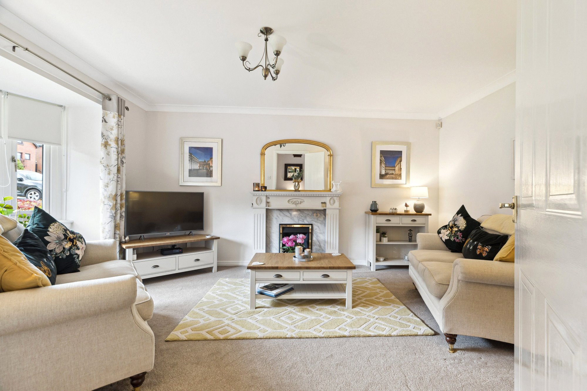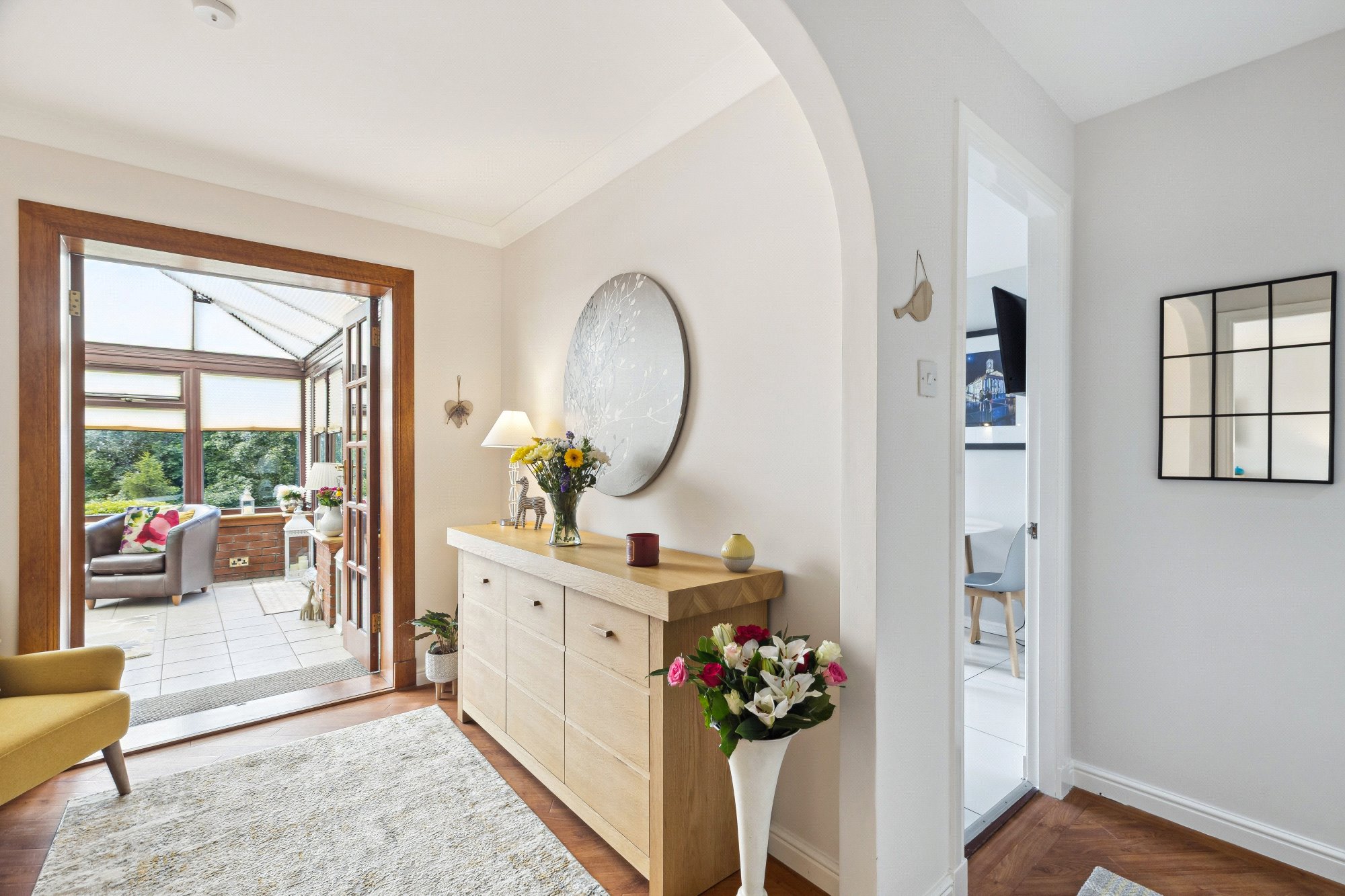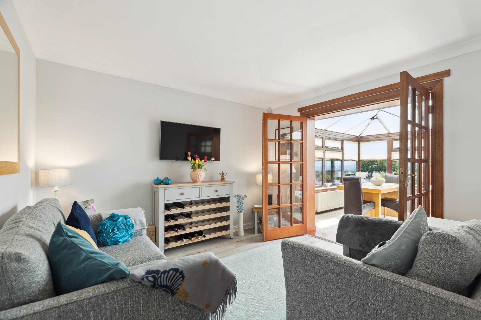 Covered entranceway. Reception hall where a split-level staircase leads to the lower and upper levels. Lounge, a fine public room with window to the front and a fireplace with marble inlay and hearth and a Living Flame coal effect gas fire. On the lower level, a hallway with store cupboard. Snug – a useful little reading area or perhaps study (inner hall) which, in turn, has double doors to the conservatory. Family sitting room, also with double doors to conservatory. Conservatory - a very generous space with double glazed windows around three sides and a set of French doors, west, to the property’s sun terrace (Sanderson window blinds). Kitchen, supplied by Glasgow Kitchens & Bathrooms, in white high gloss with contrasting charcoal-coloured worktops, above which is a white “metro” wall tile and concealed under-unit lighting. Integrated appliances include a four-burner gas hob, oven, a stainless-steel and glass cooker hood and, concealed, a fridge freezer and a slimline dishwasher. Off the kitchen is a utility space, with back door, in which there is plumbing for a washing machine and space for a tumble dryer. Guest WC.