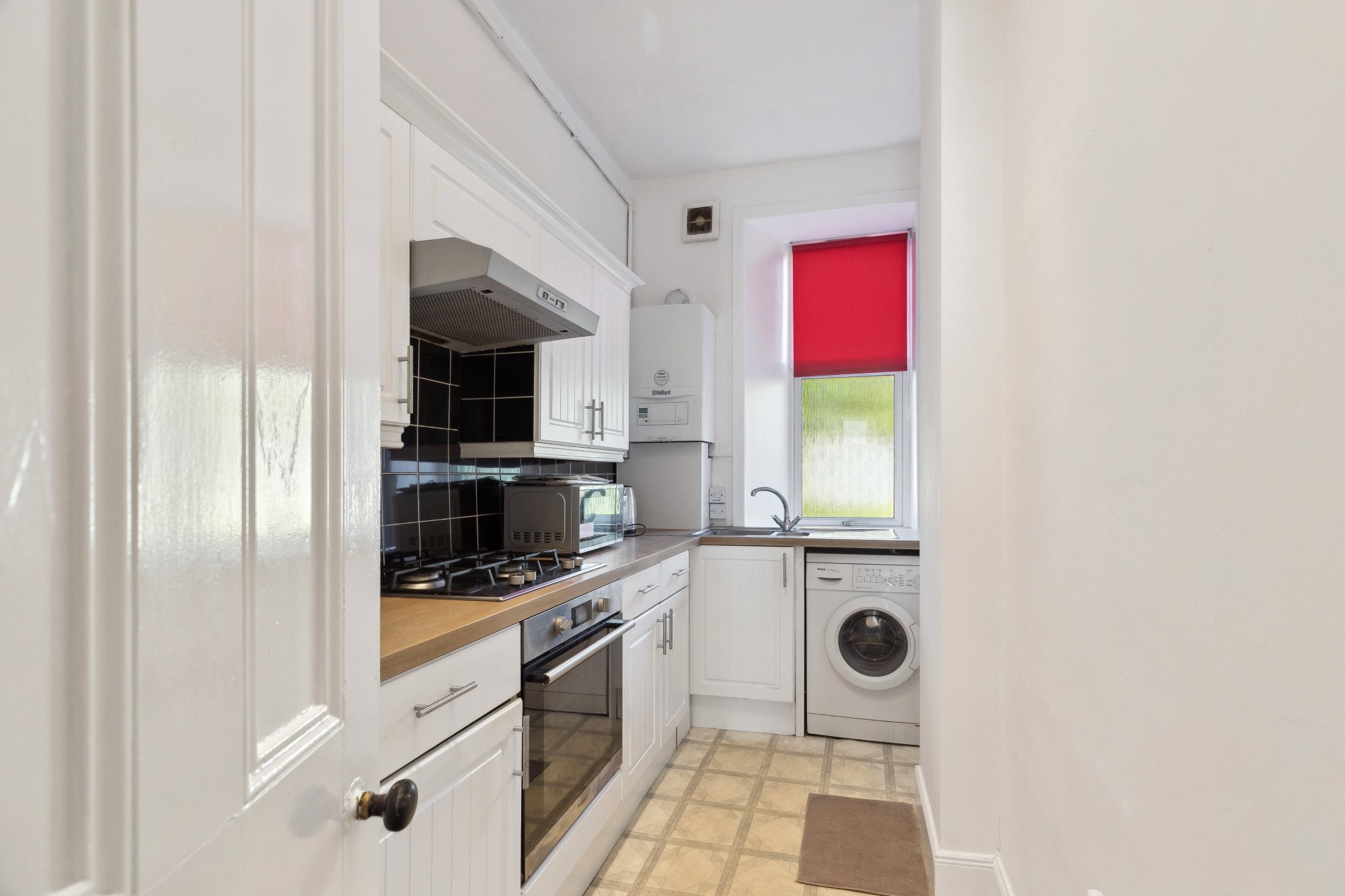 - Well appointed kitchen – sharp white cabinetry, contrast worktops, integrated four burner gas hob and oven