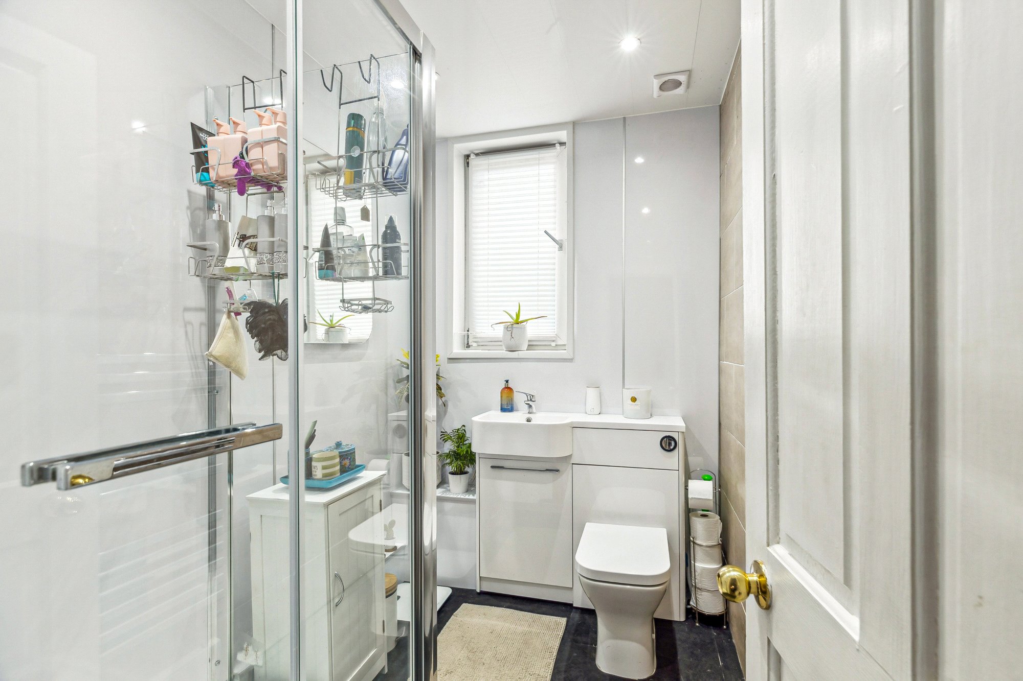 - Modern shower room with walk in enclosure, chrome heated towel rail