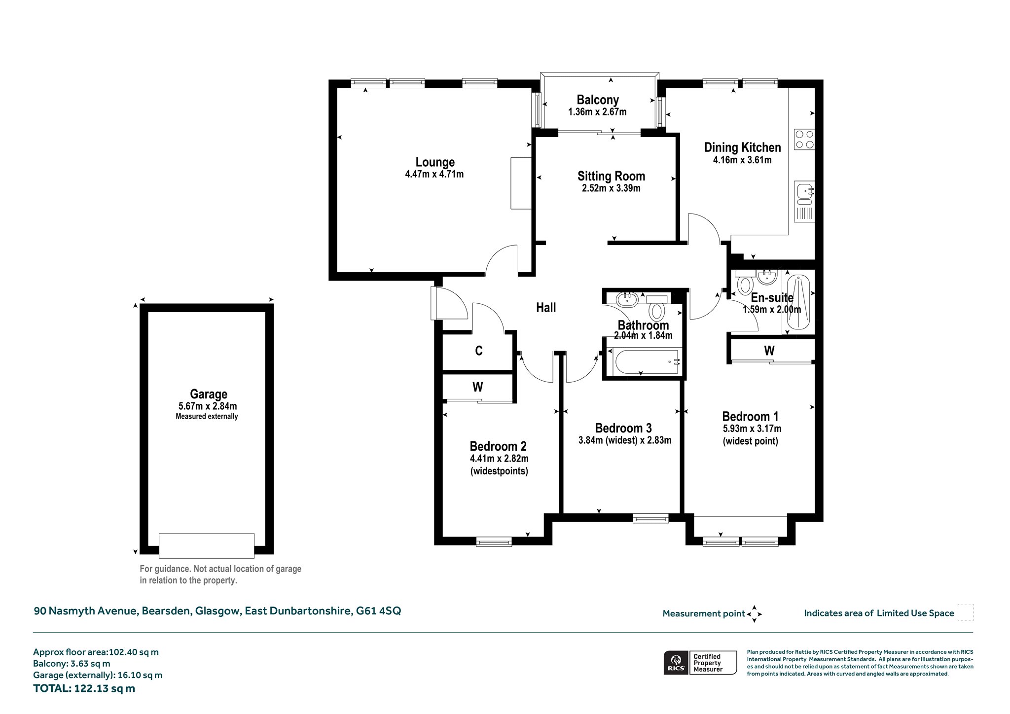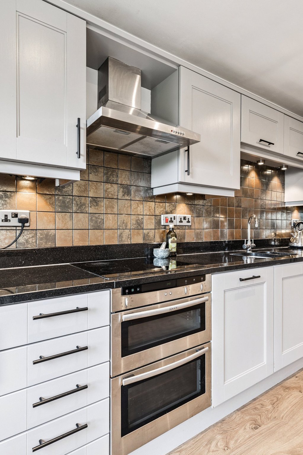 Private reception hall with deep storage cupboard. Large lounge with limestone fireplace, separate dining room with patio doors onto sun balcony, breakfasting size kitchen with contemporary units, solid granite work surfaces and a range of quality integrated appliances. Three double bedrooms (two with fitted mirrored wardrobes), with the master bedroom having a contemporary, tiled en-suite shower room and with bedrooms two and three serviced by a fully tiled bathroom. The shower room has a thermostatic shower, the bathroom an electric shower. Double glazed windows.