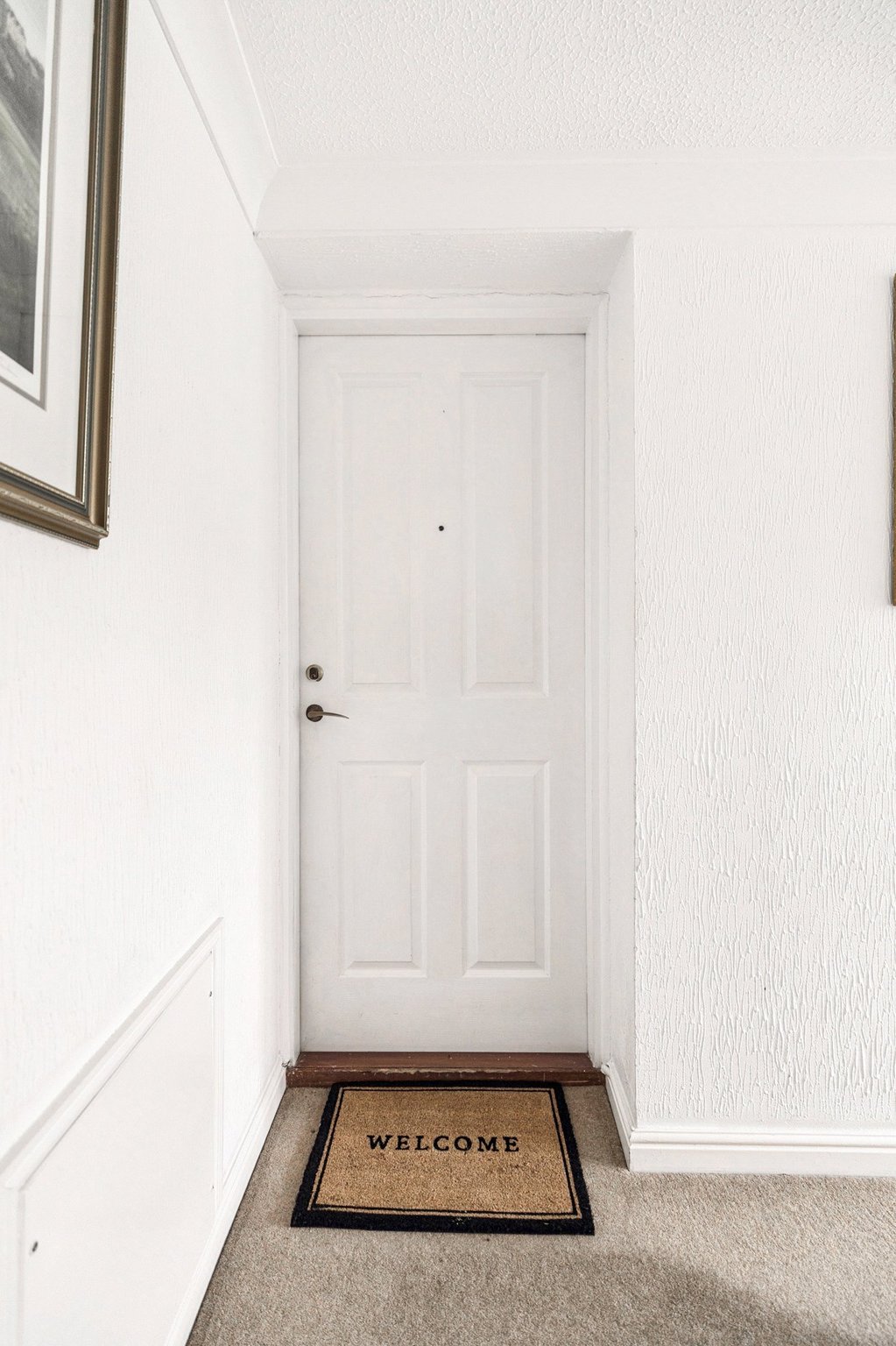 The building is accessed via a security-controlled entry system which leads to a carpeted hallway and staircase.