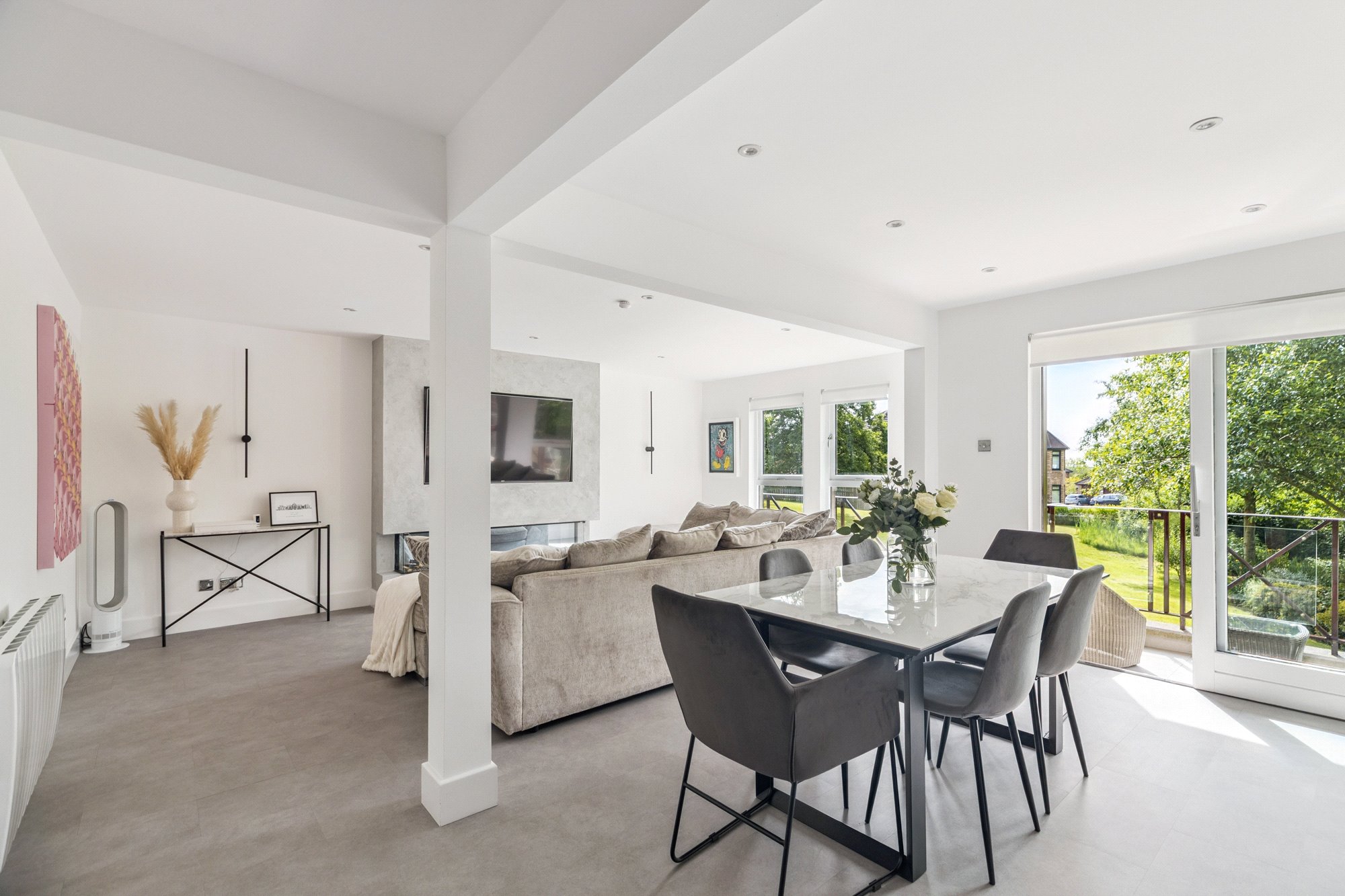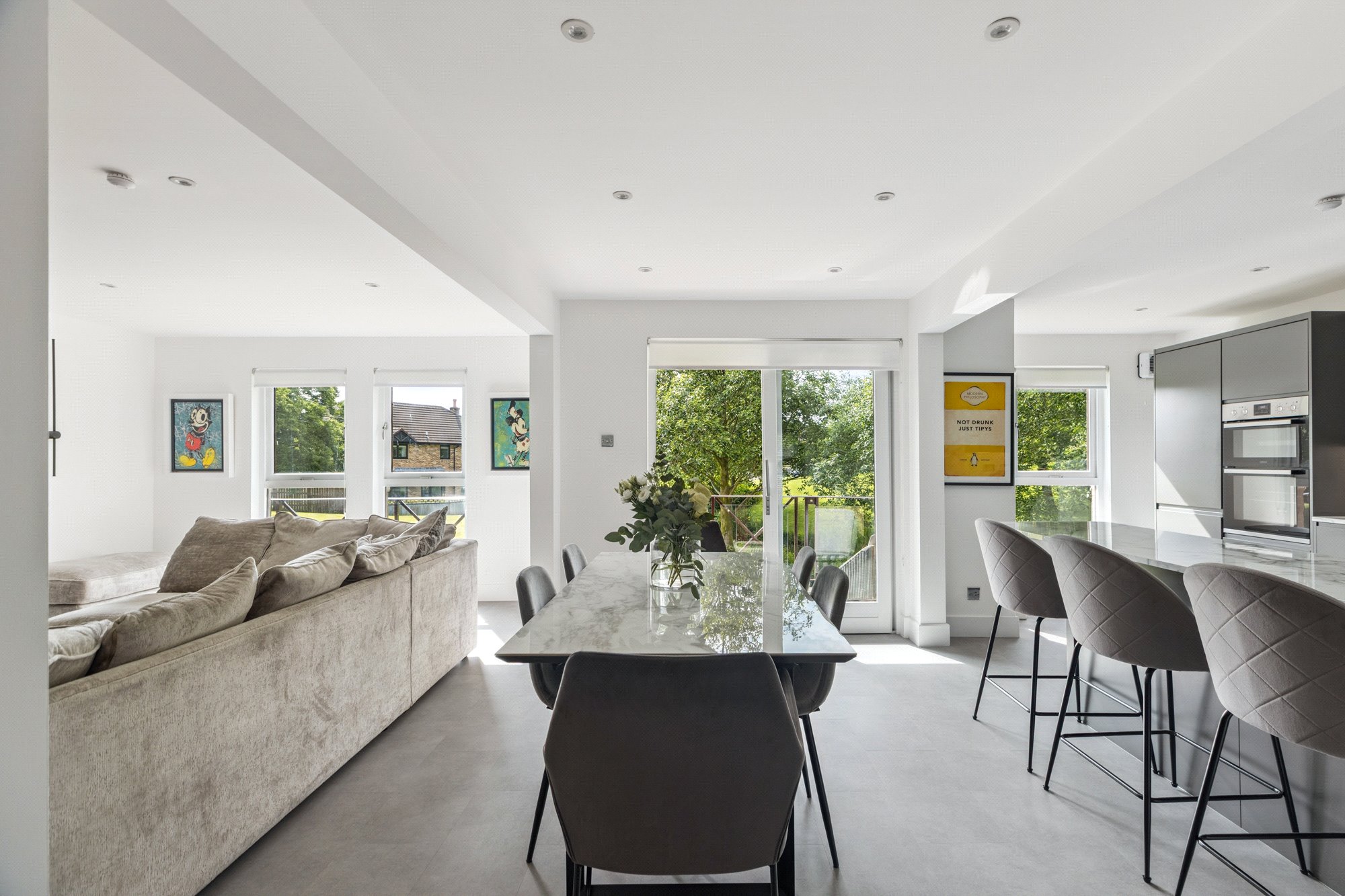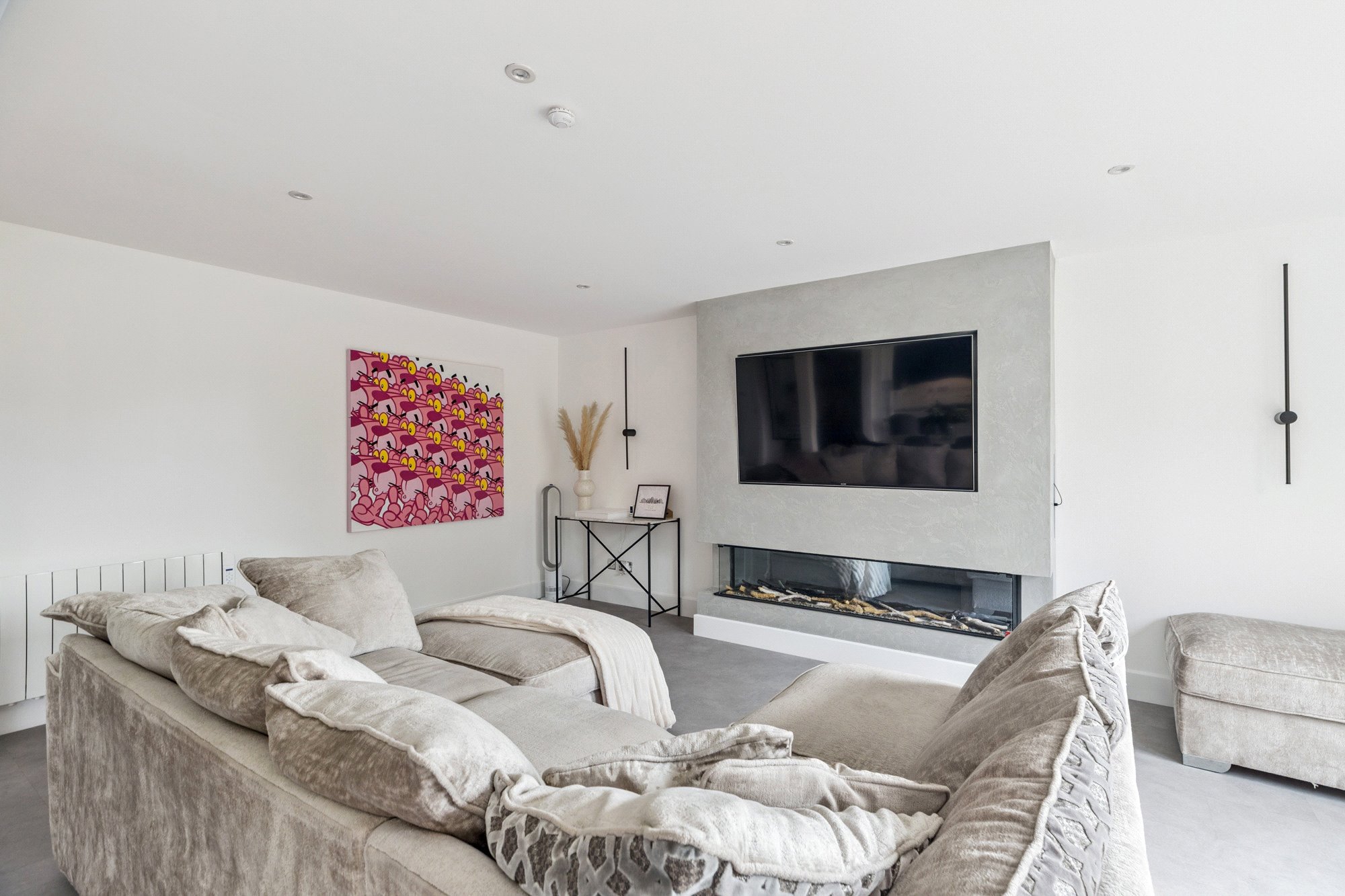 Entrance porch/vestibule, reception hallway with storage off, lounge with feature fireplace/integrated media wall, dining area, breakfast bar area, kitchen with handless units/contrast worktops and range of quality integrated appliances, shower room, two double bedrooms (principal bedroom with ensuite shower room)