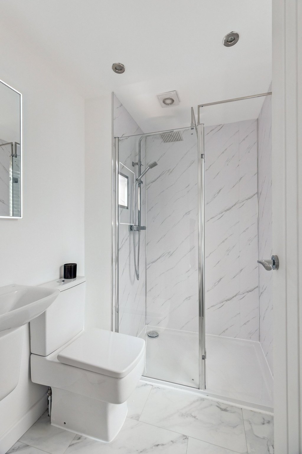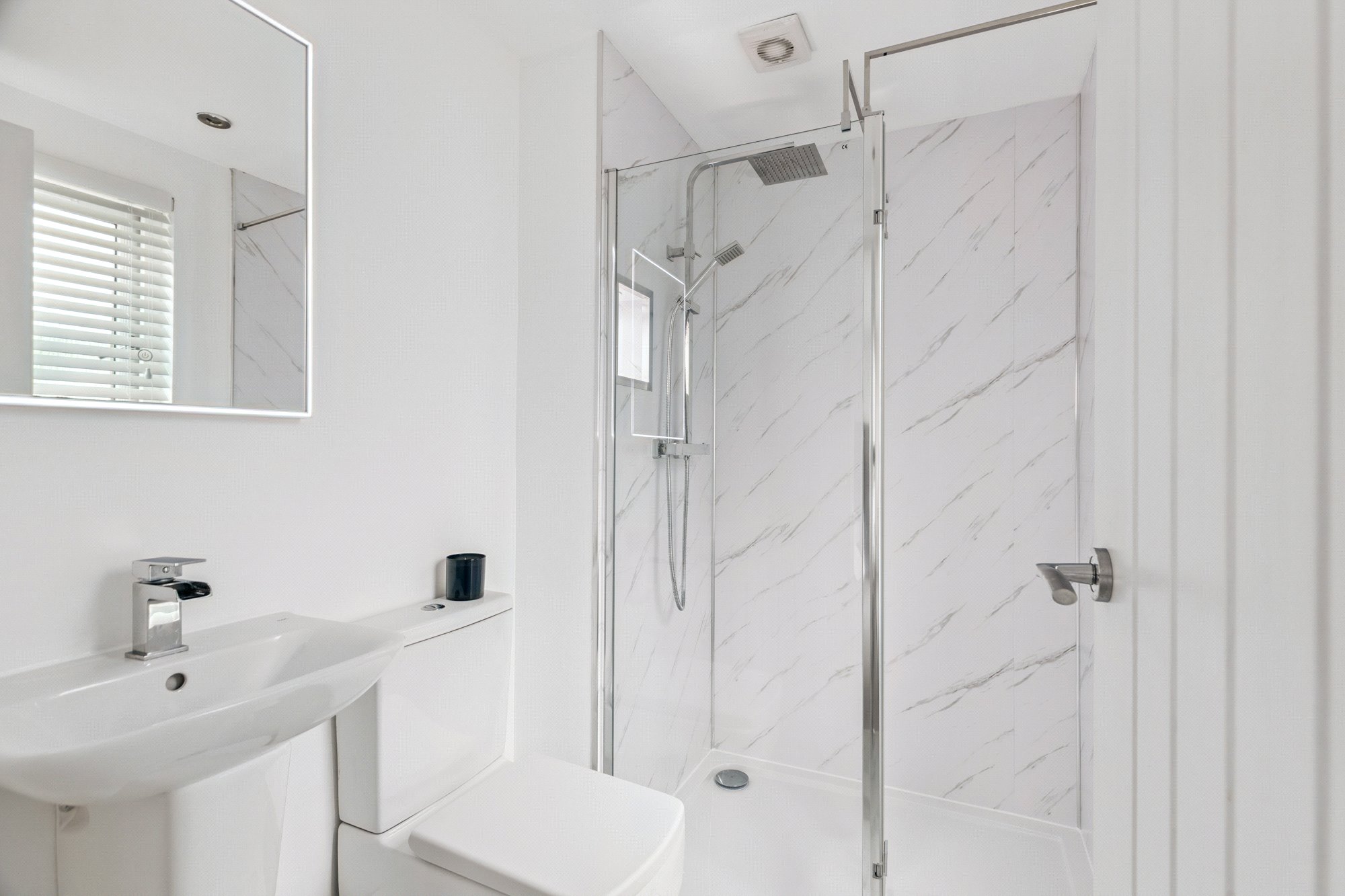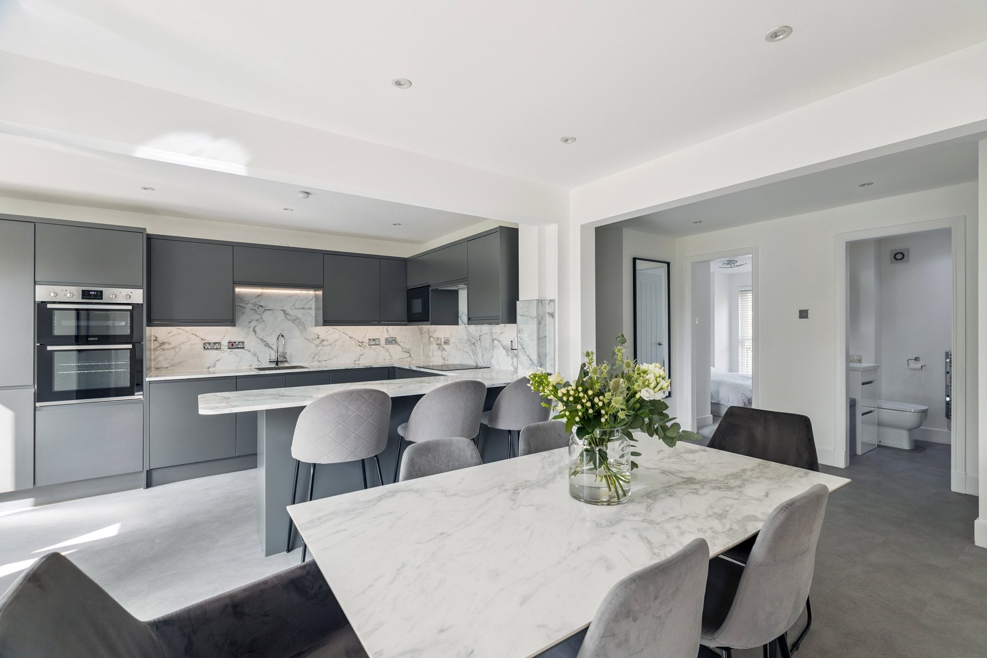 Entrance porch/vestibule, reception hallway with storage off, lounge with feature fireplace/integrated media wall, dining area, breakfast bar area, kitchen with handless units/contrast worktops and range of quality integrated appliances, shower room, two double bedrooms (principal bedroom with ensuite shower room)