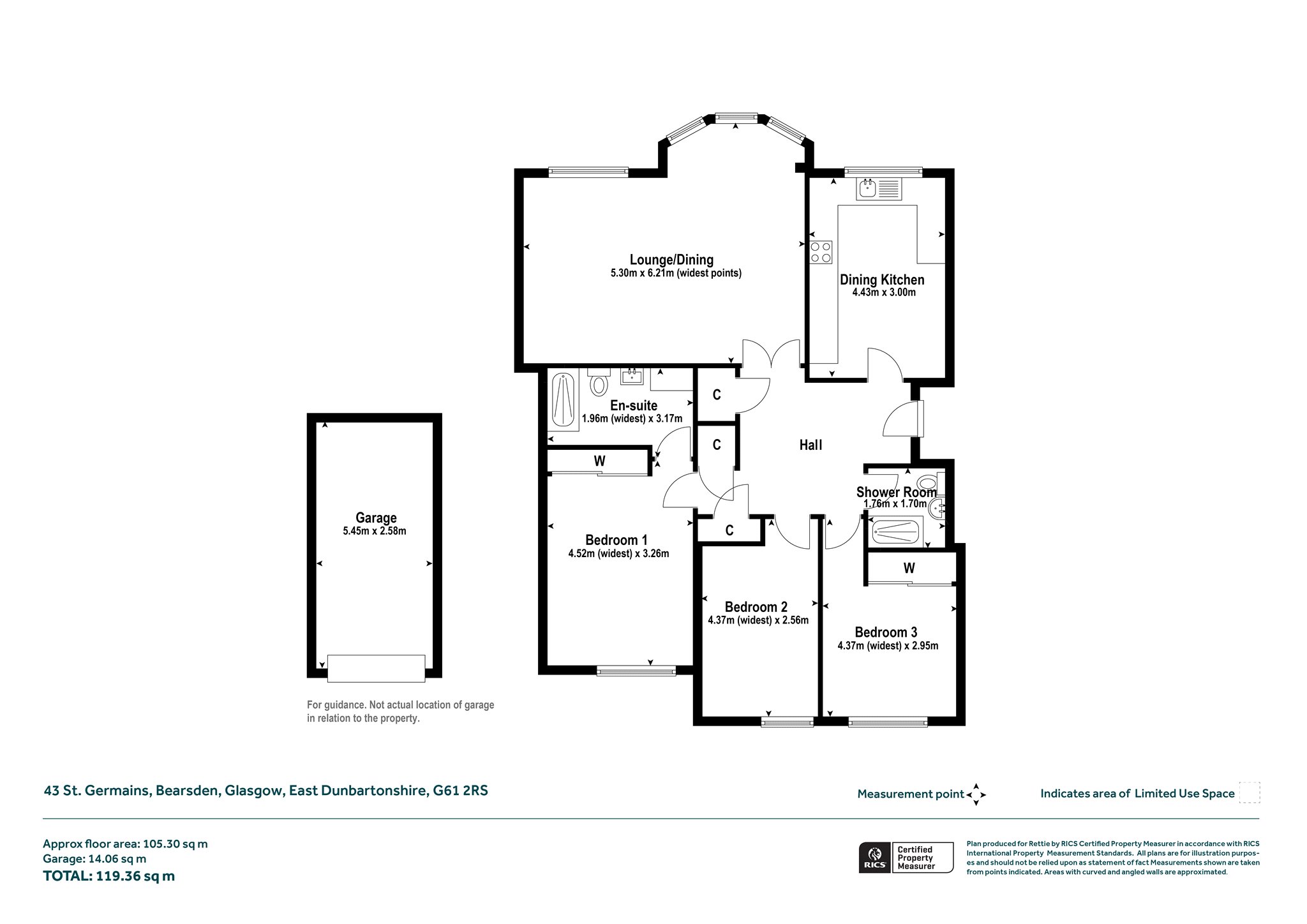 No. 43 is one of the three-bedroom flats and is on the ground floor - perfect for those not wishing to climb stairs(there is no lift) and is tucked away in the northwest corner of the development with windows looking westwards (lounge/dining room, kitchen) and eastwards (the bedrooms). It is a very spacious apartment of some 1100 sq ft, immediately noticeable by the large reception hall as one enters.