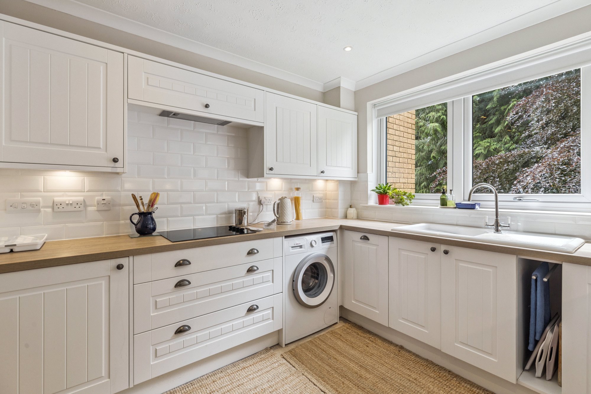 Security controlled door entry system to residents entrance vestibule and carpeted entrance hall. The apartment’s private reception hall with three storage cupboards - a surprisingly generous space. A lovely lounge/dining room with two sets of windows, including a bay window, to the west overlooking the garden grounds. The kitchen is white and in a New England style with oak laminate worktops into which is set a Belfast style sink. Above the worksurfaces is is white “metro” wall tiles. Appliances include - halogen hob, cooker hood, oven, microwave, fridge-freezer, slimline dishwasher. Spaces for washing machine and tumble dryer . There is space for a breakfast table and chairs. 3 bedrooms (two doubles, one good size single - two with fitted wardrobe provision with modern sliding and mirror door). A fine sized ensuite shower room to the primary bedroom - featuring an Edwardian style white suite and a large modern shower enclosure, tiled in white “metro” tiles, with a powerful thermostatic shower. Chrome towel radiator here. There is a second house shower room again with white suite, designed essentially as a “wet room” with shower base featuring a floor drain. Wet wall panelling on all walls. Heated towel rail (white).