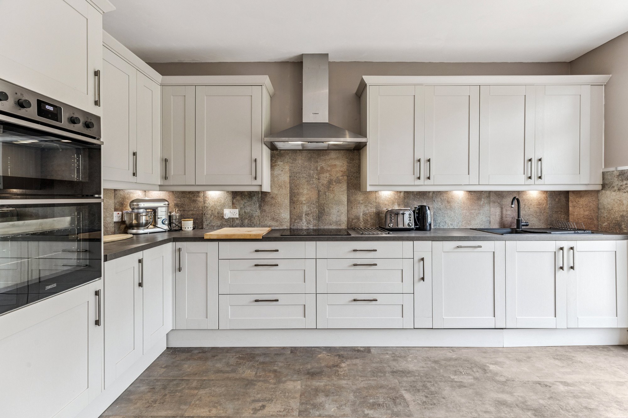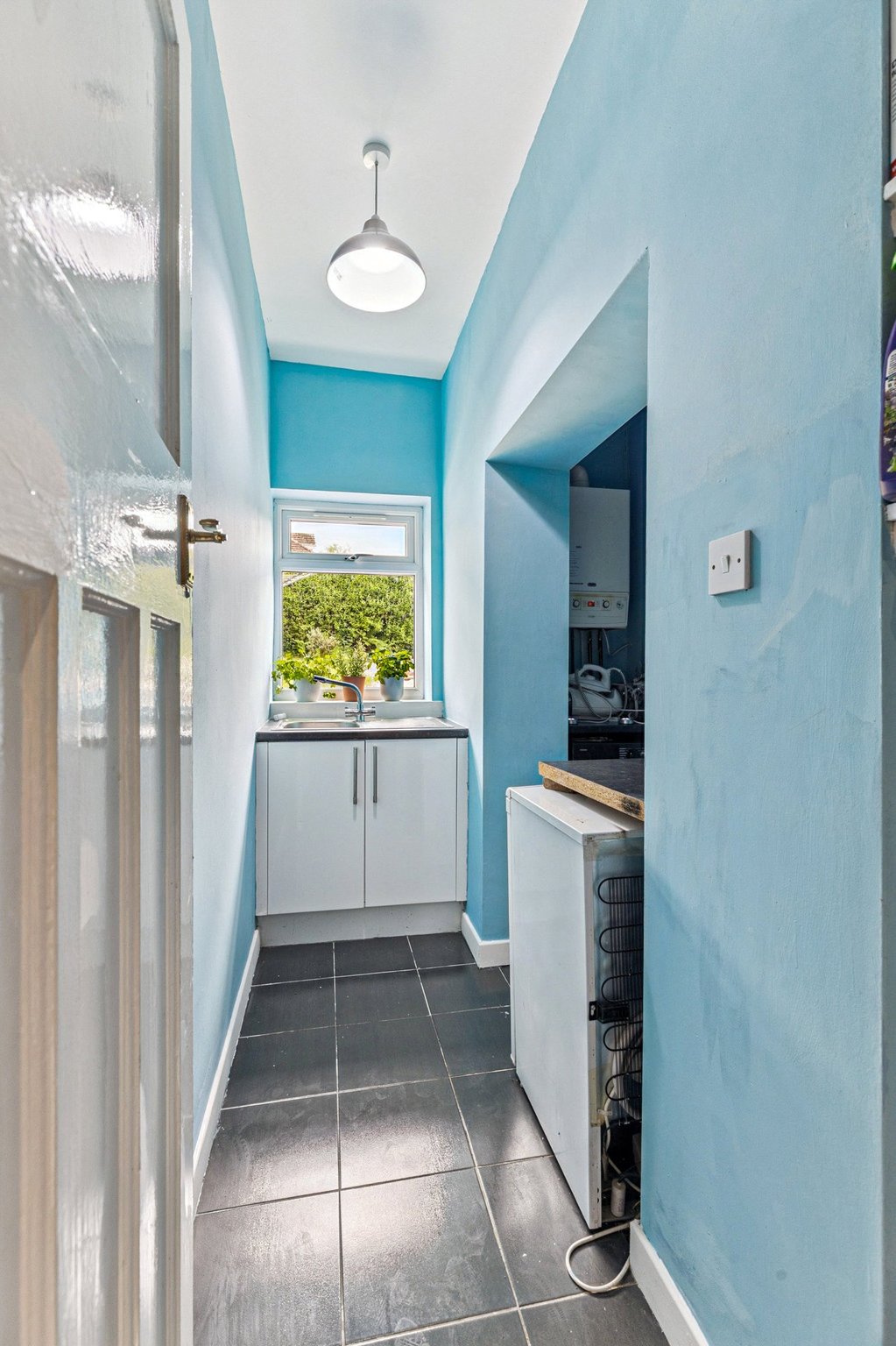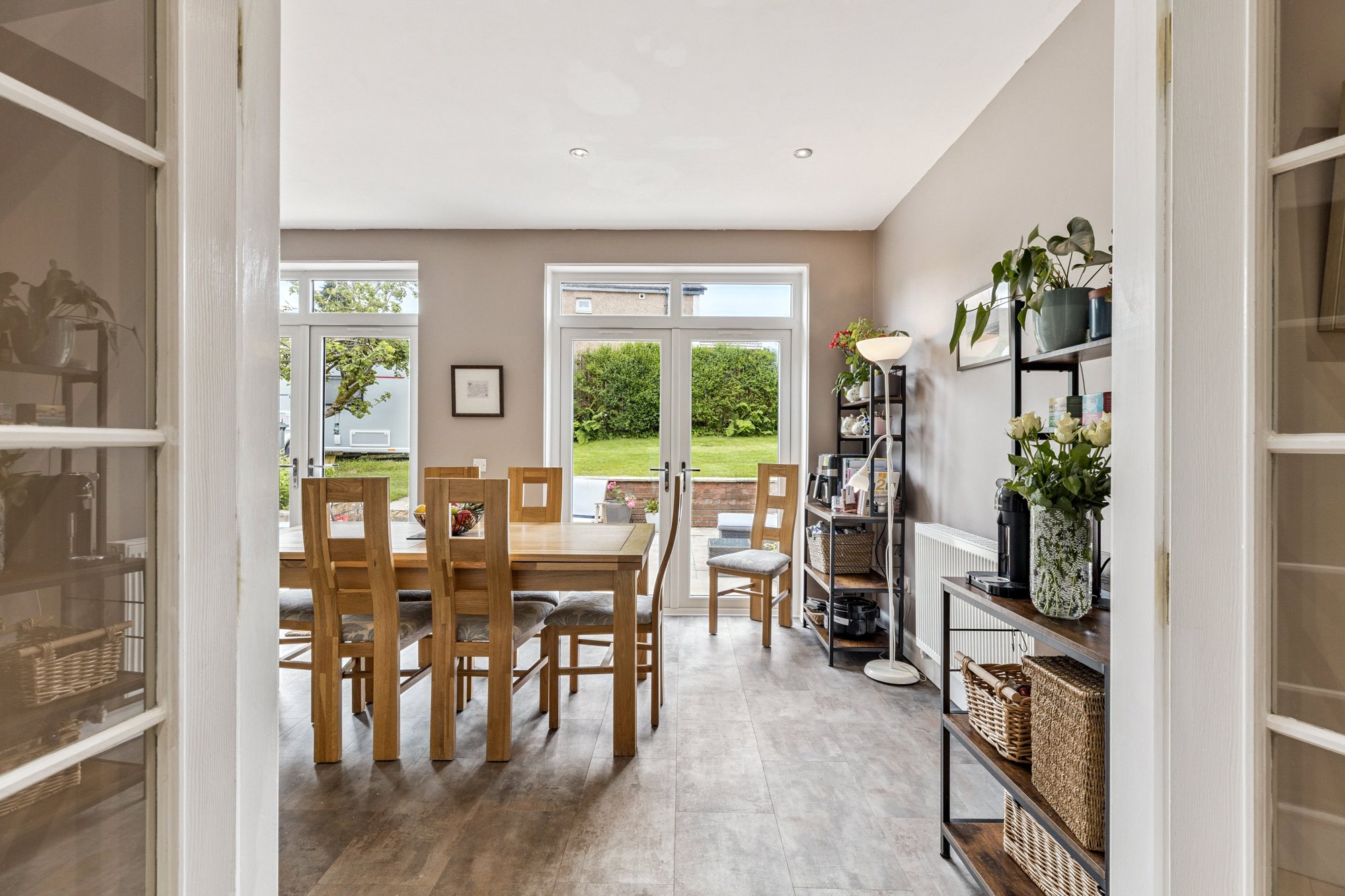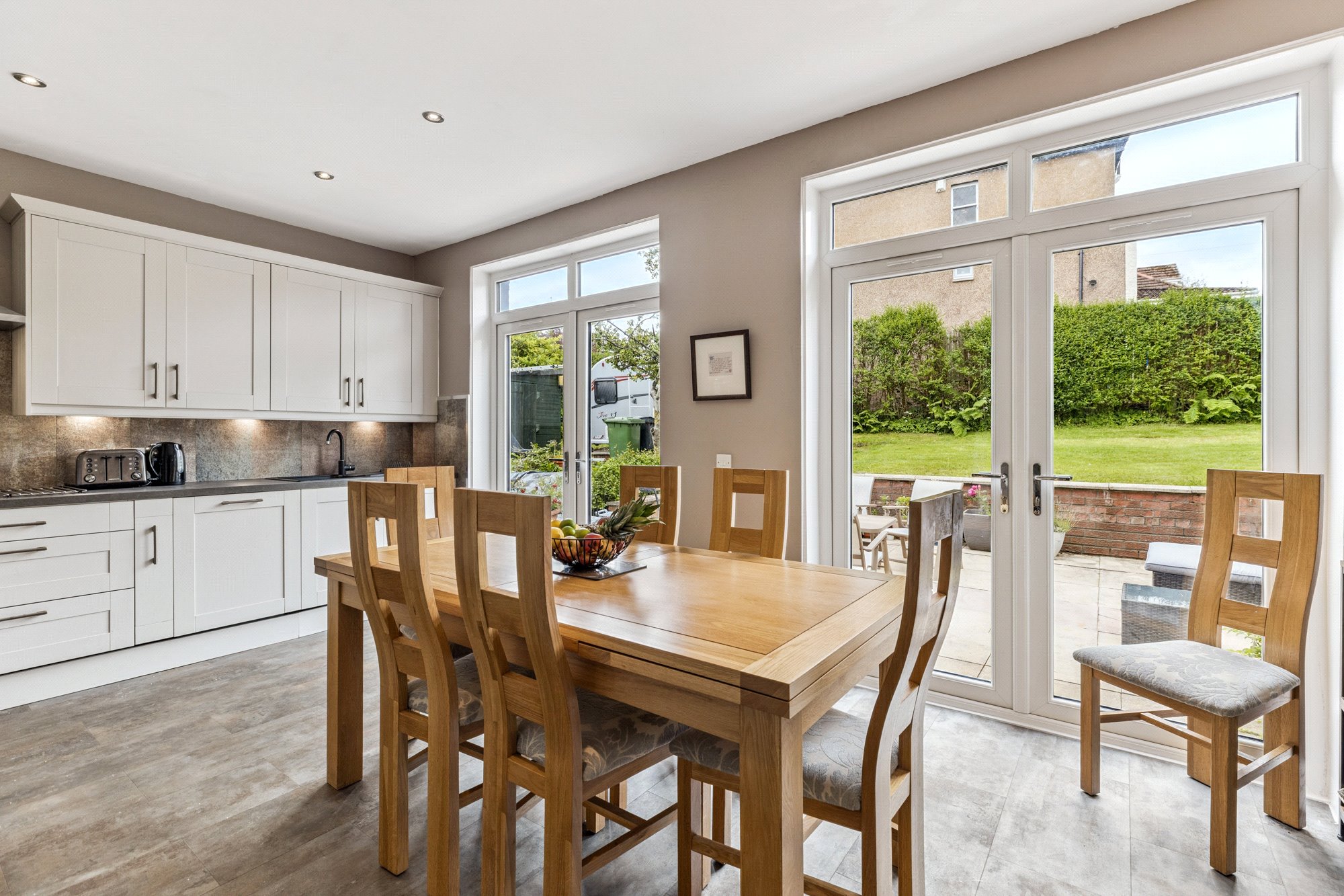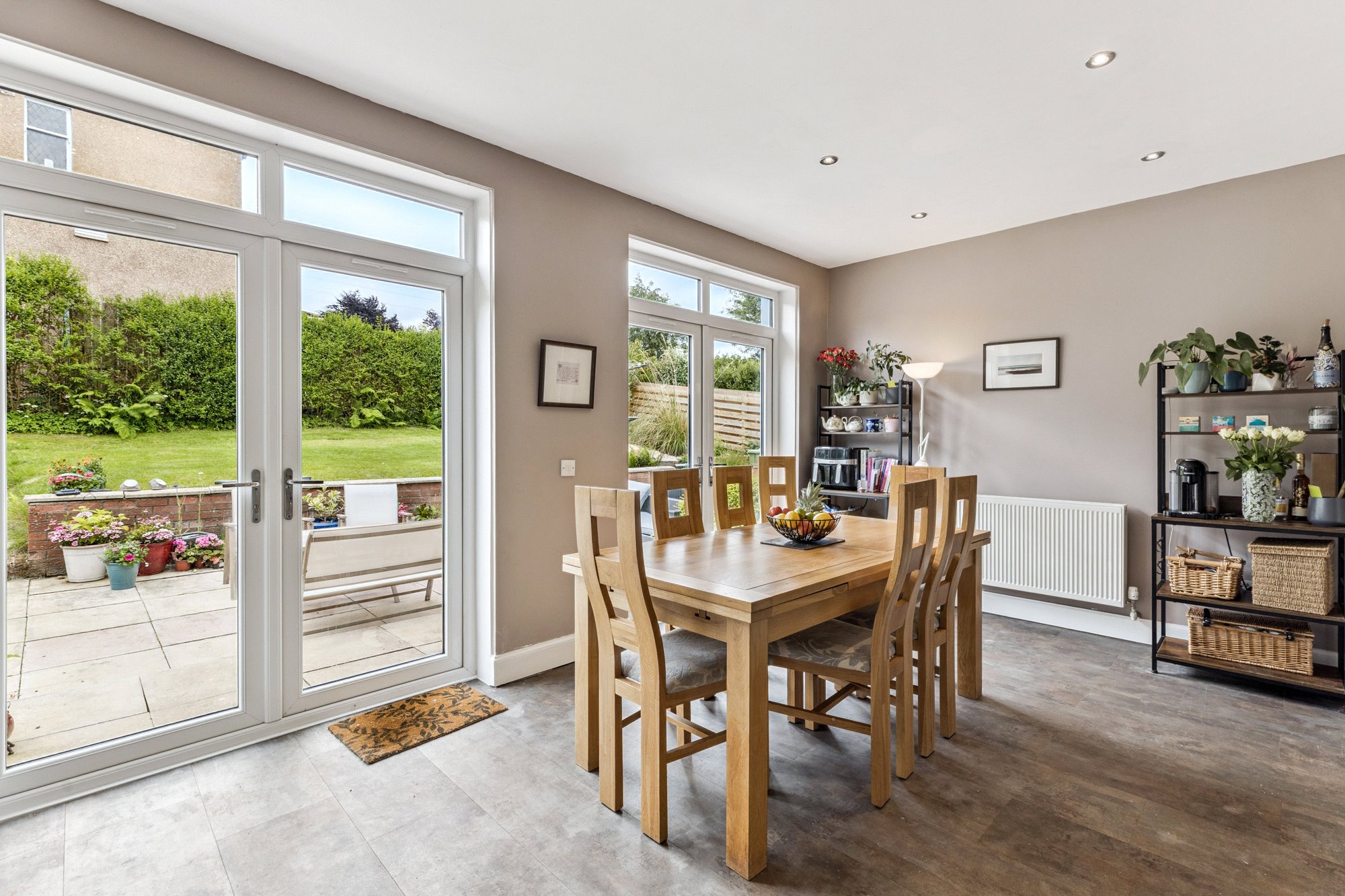 Entrance vestibule with storm doors. Hall. Formal lounge with bay window to the front plus additional east window for morning sun. Composite marble fireplace here. Family/TV room - used as a Home Office but could be fifth bedroom if needed. The very impressive dining kitchen has the feature of the two French doors and boasts a very smart, 5-year-old, Shaker kitchen range, in matte cashmere colour, by Wren Kitchens. A dark grey, concrete style, worktop with a quality composite sink, by Blanco, in black, provides an appealing contrast as does the wet-wall back panels. Appliances include - induction hob, stainless-steel cooker hood, double oven (fan) with grill, integrated dishwasher and fridge. 2 double bedrooms, both with bay windows. Bathroom (installed about 3 years ago) with wet-wall panelling, tiled floor, thermostatic shower over the bath, and a matte grey towel radiator. Utility room, with window, stainless-steel sink, plumbing for washing machine, and space for other appliances.
