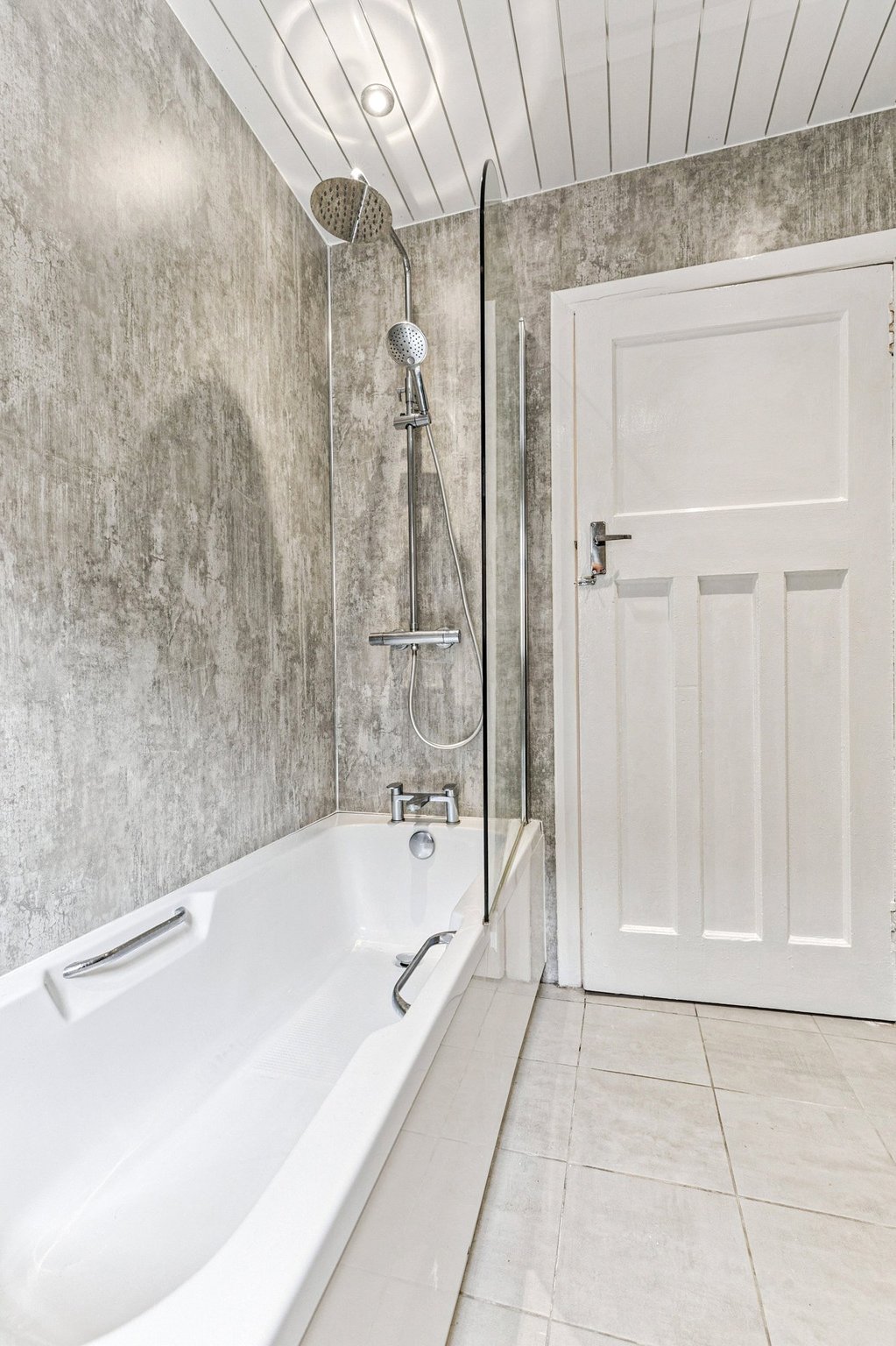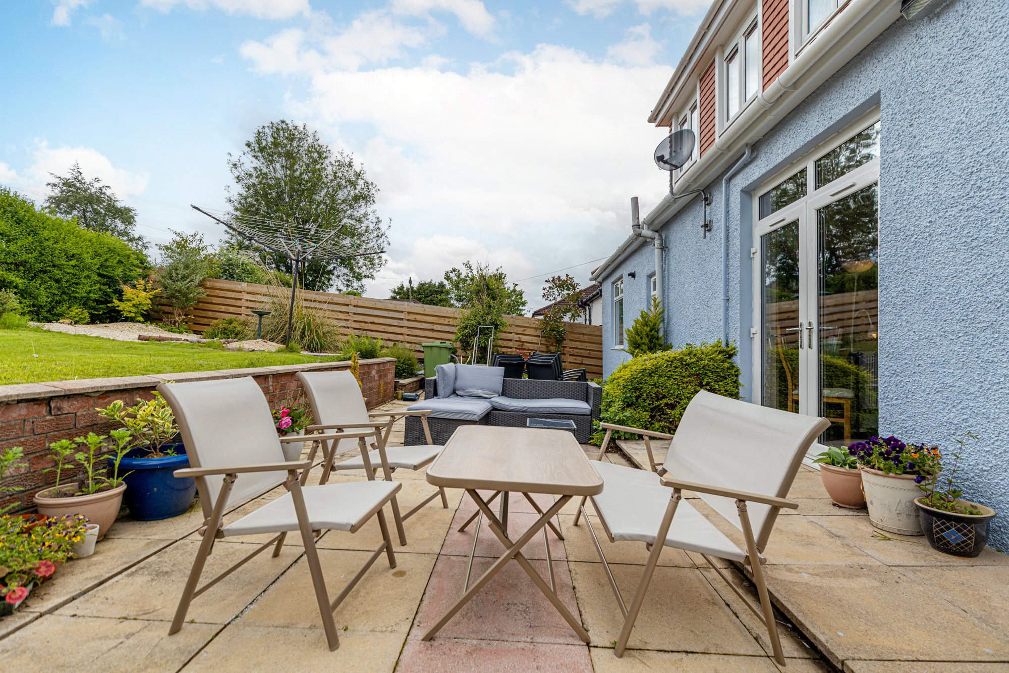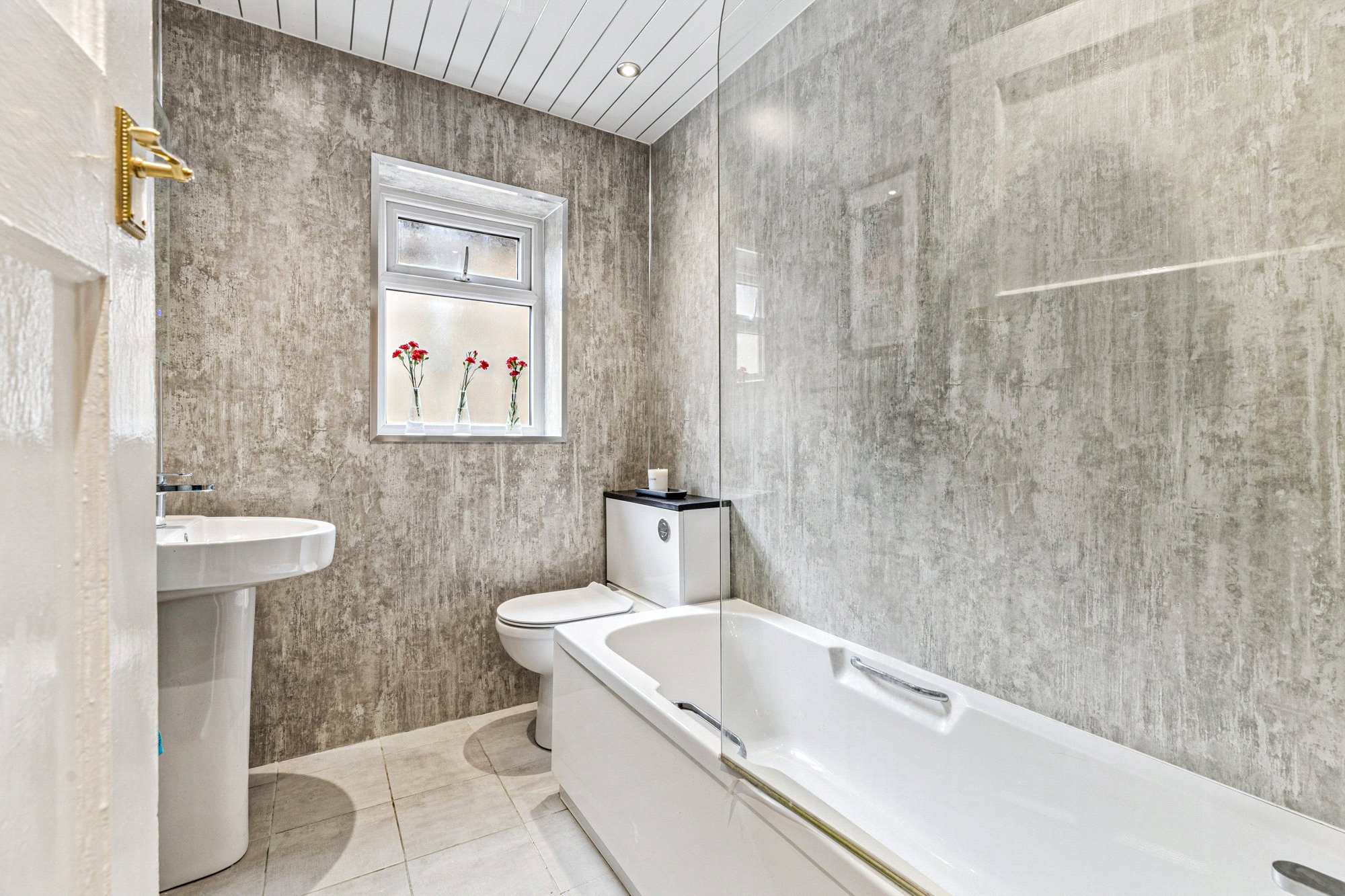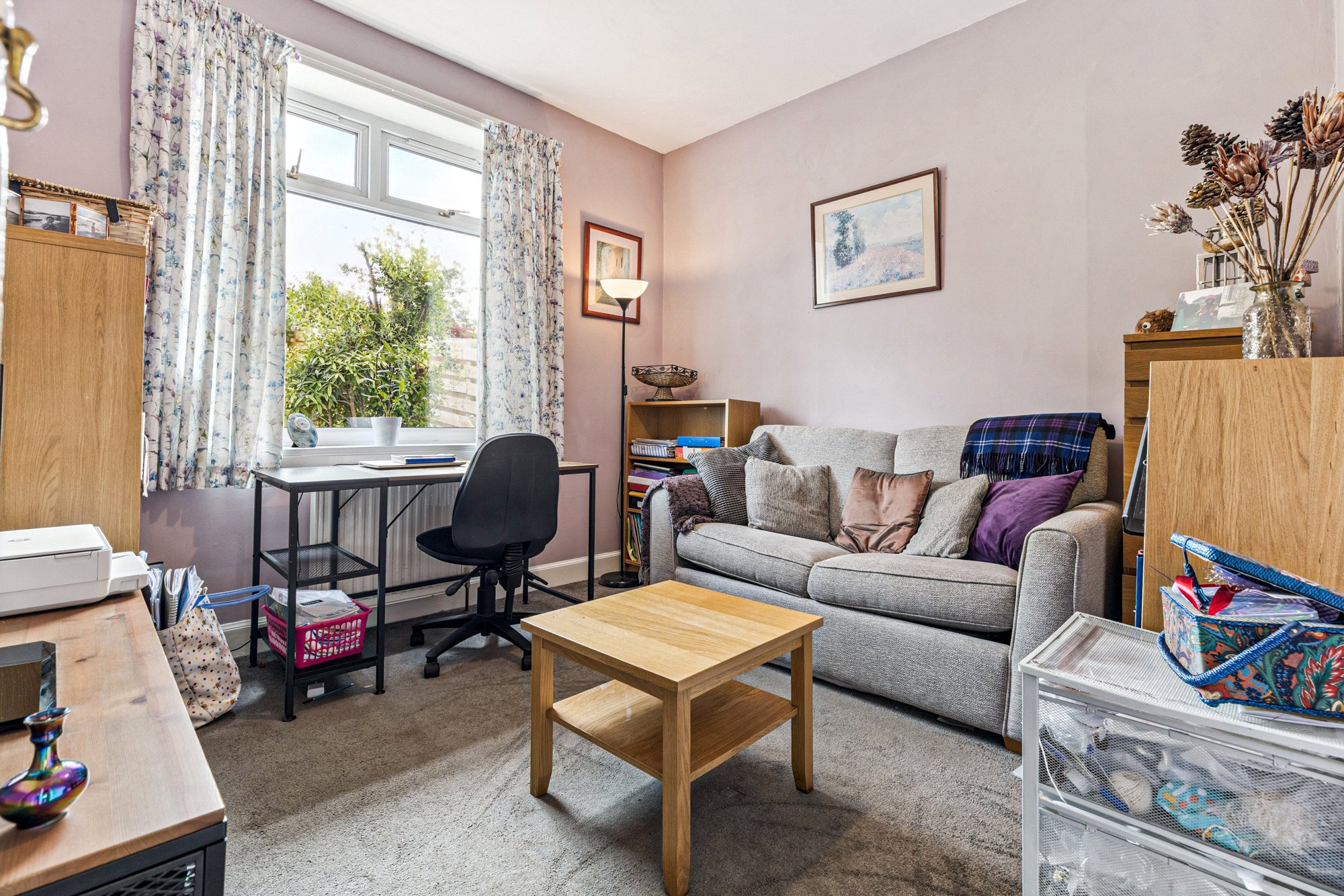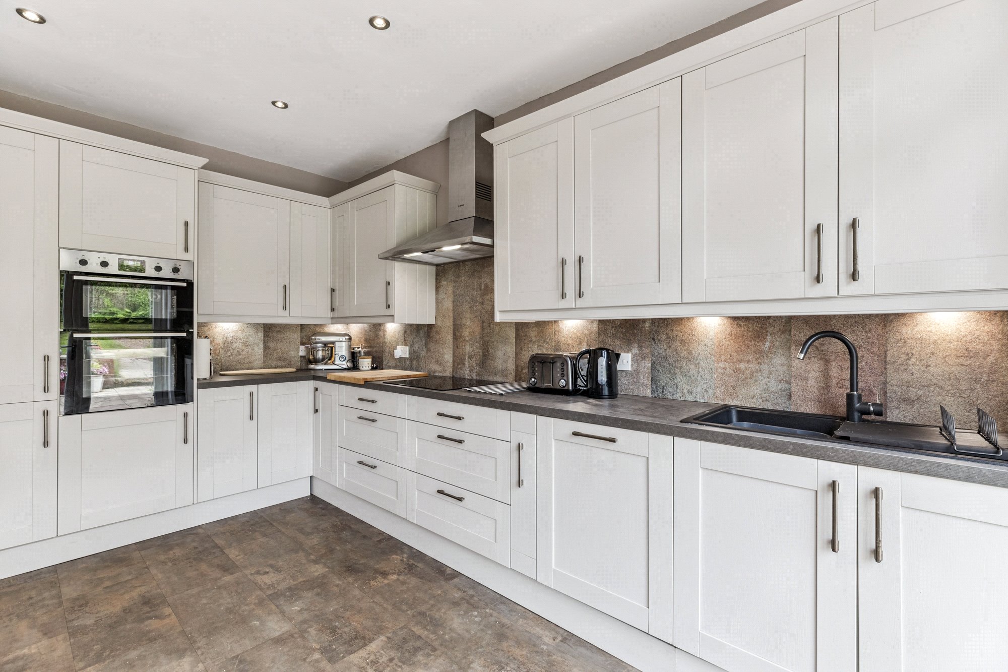 Entrance vestibule with storm doors. Hall. Formal lounge with bay window to the front plus additional east window for morning sun. Composite marble fireplace here. Family/TV room - used as a Home Office but could be fifth bedroom if needed. The very impressive dining kitchen has the feature of the two French doors and boasts a very smart, 5-year-old, Shaker kitchen range, in matte cashmere colour, by Wren Kitchens. A dark grey, concrete style, worktop with a quality composite sink, by Blanco, in black, provides an appealing contrast as does the wet-wall back panels. Appliances include - induction hob, stainless-steel cooker hood, double oven (fan) with grill, integrated dishwasher and fridge. 2 double bedrooms, both with bay windows. Bathroom (installed about 3 years ago) with wet-wall panelling, tiled floor, thermostatic shower over the bath, and a matte grey towel radiator. Utility room, with window, stainless-steel sink, plumbing for washing machine, and space for other appliances.