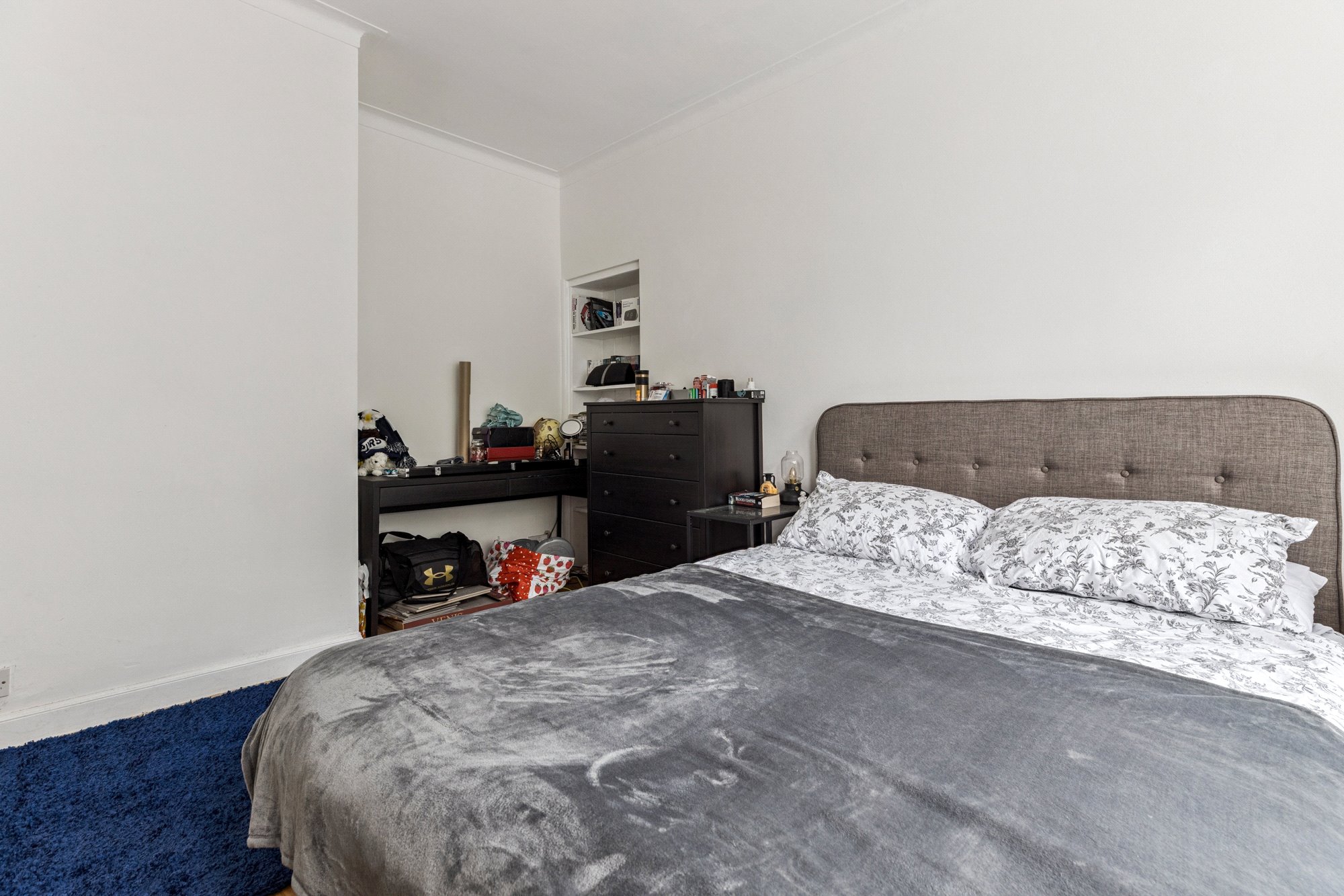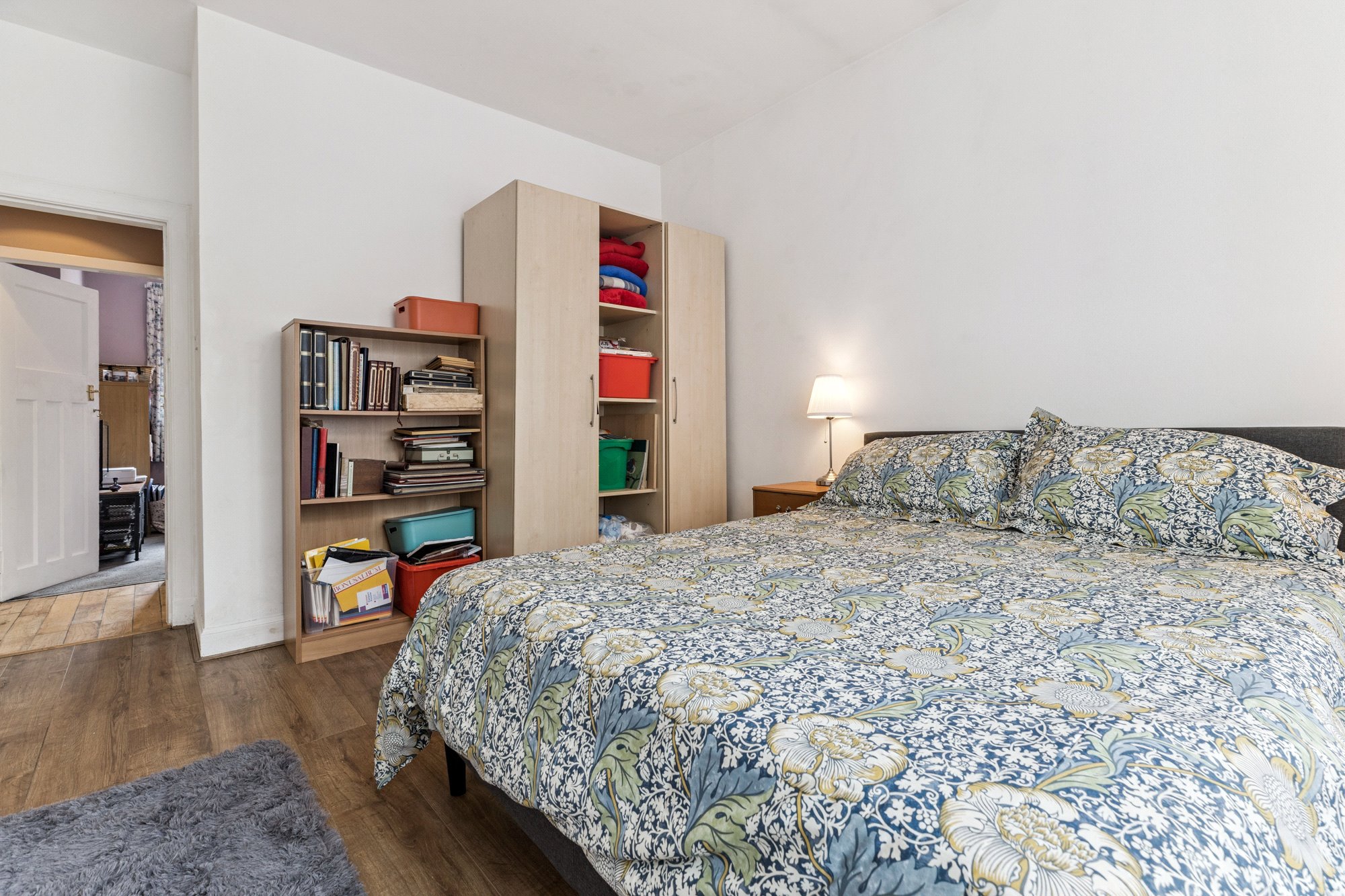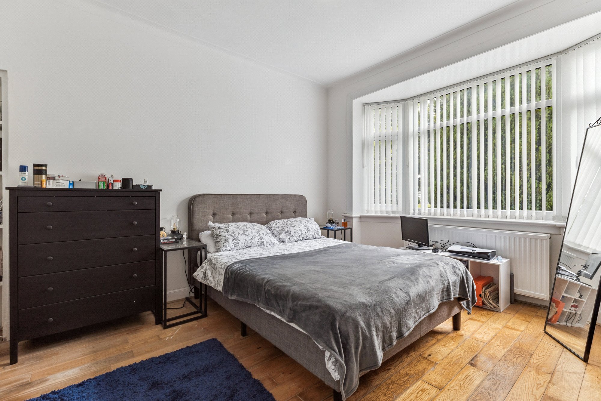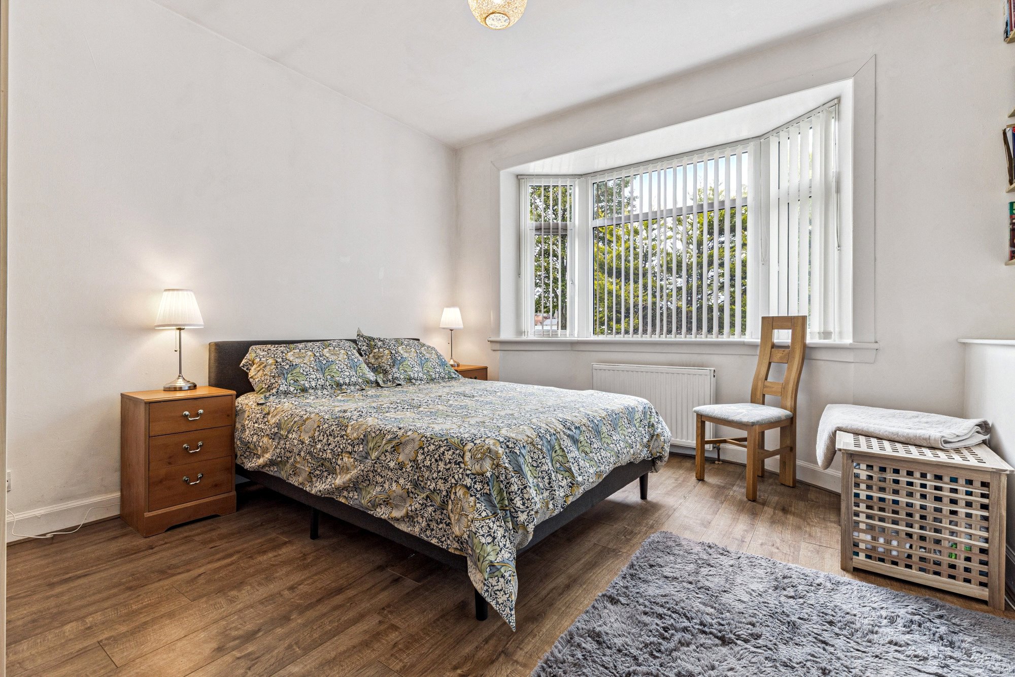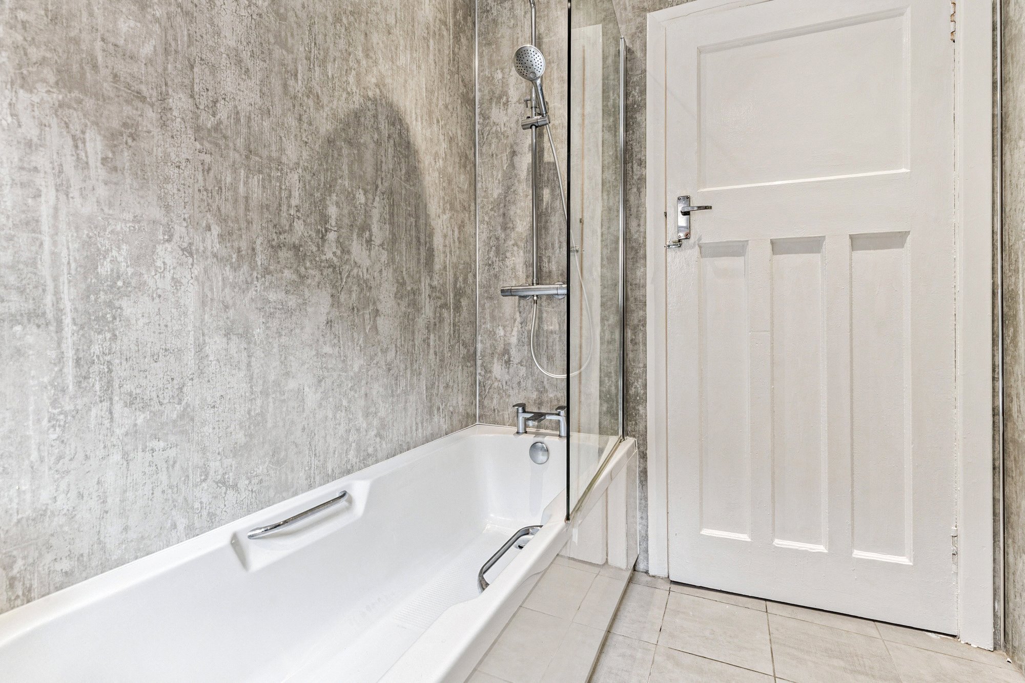 Entrance vestibule with storm doors. Hall. Formal lounge with bay window to the front plus additional east window for morning sun. Composite marble fireplace here. Family/TV room - used as a Home Office but could be fifth bedroom if needed. The very impressive dining kitchen has the feature of the two French doors and boasts a very smart, 5-year-old, Shaker kitchen range, in matte cashmere colour, by Wren Kitchens. A dark grey, concrete style, worktop with a quality composite sink, by Blanco, in black, provides an appealing contrast as does the wet-wall back panels. Appliances include - induction hob, stainless-steel cooker hood, double oven (fan) with grill, integrated dishwasher and fridge. 2 double bedrooms, both with bay windows. Bathroom (installed about 3 years ago) with wet-wall panelling, tiled floor, thermostatic shower over the bath, and a matte grey towel radiator. Utility room, with window, stainless-steel sink, plumbing for washing machine, and space for other appliances.