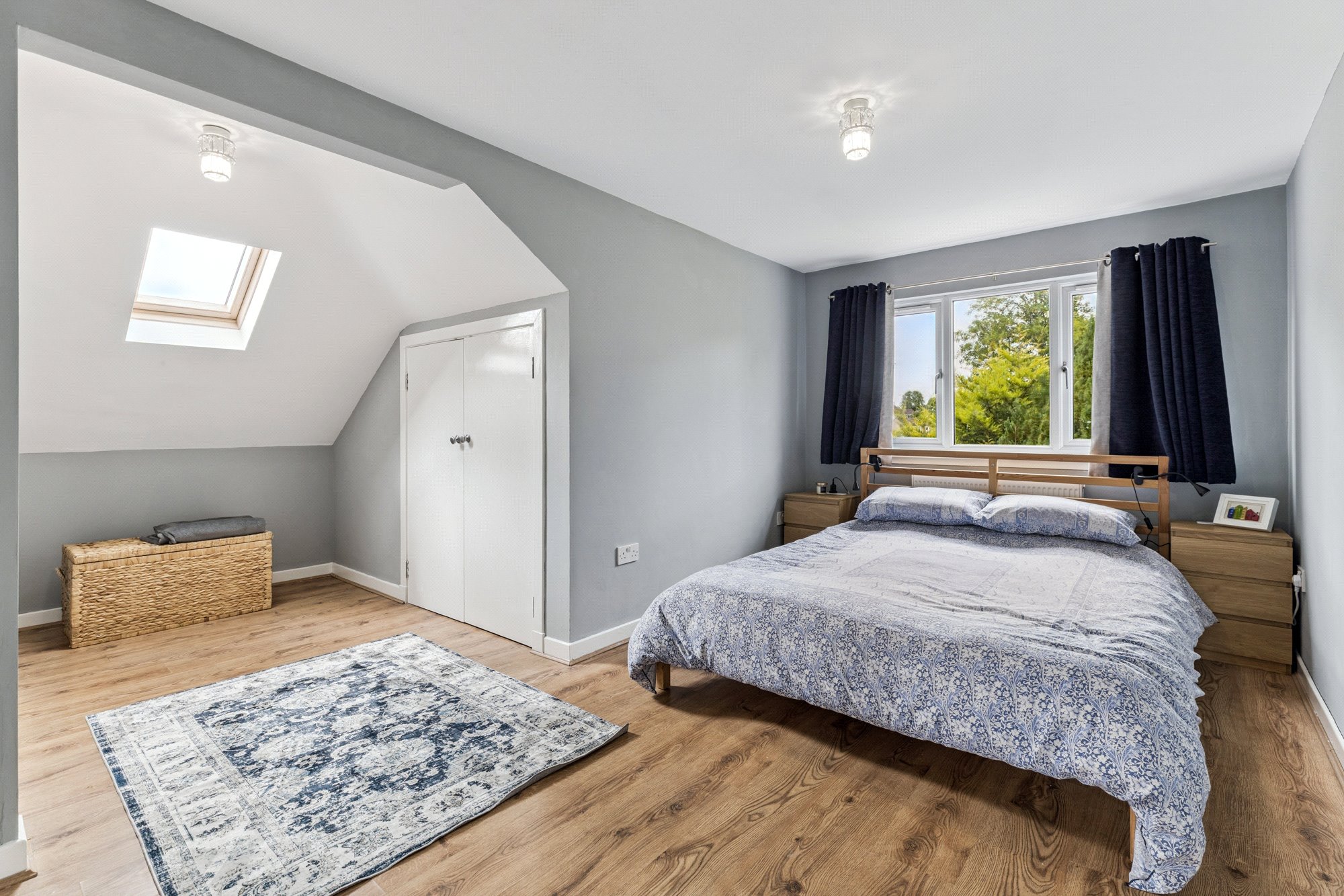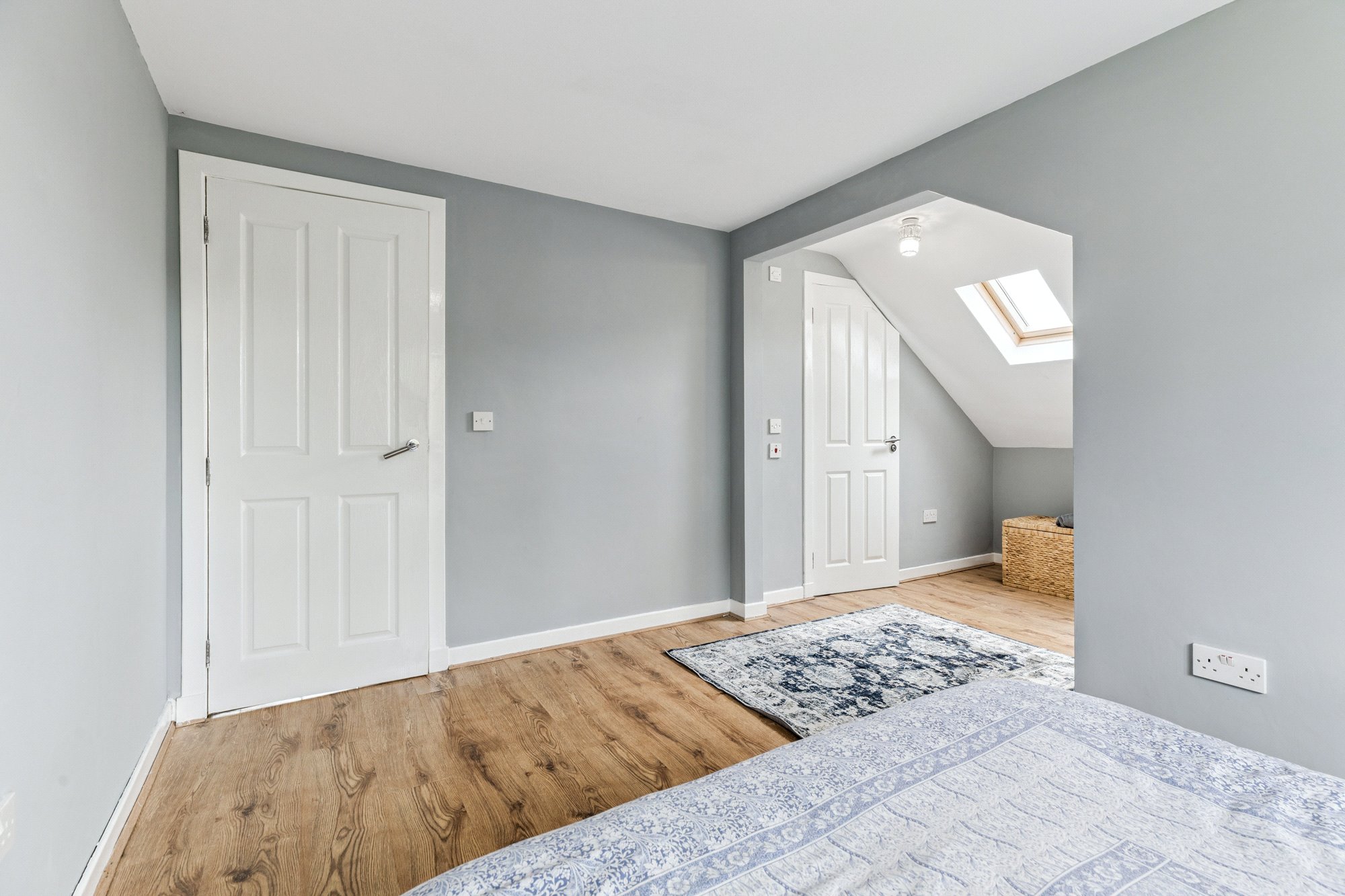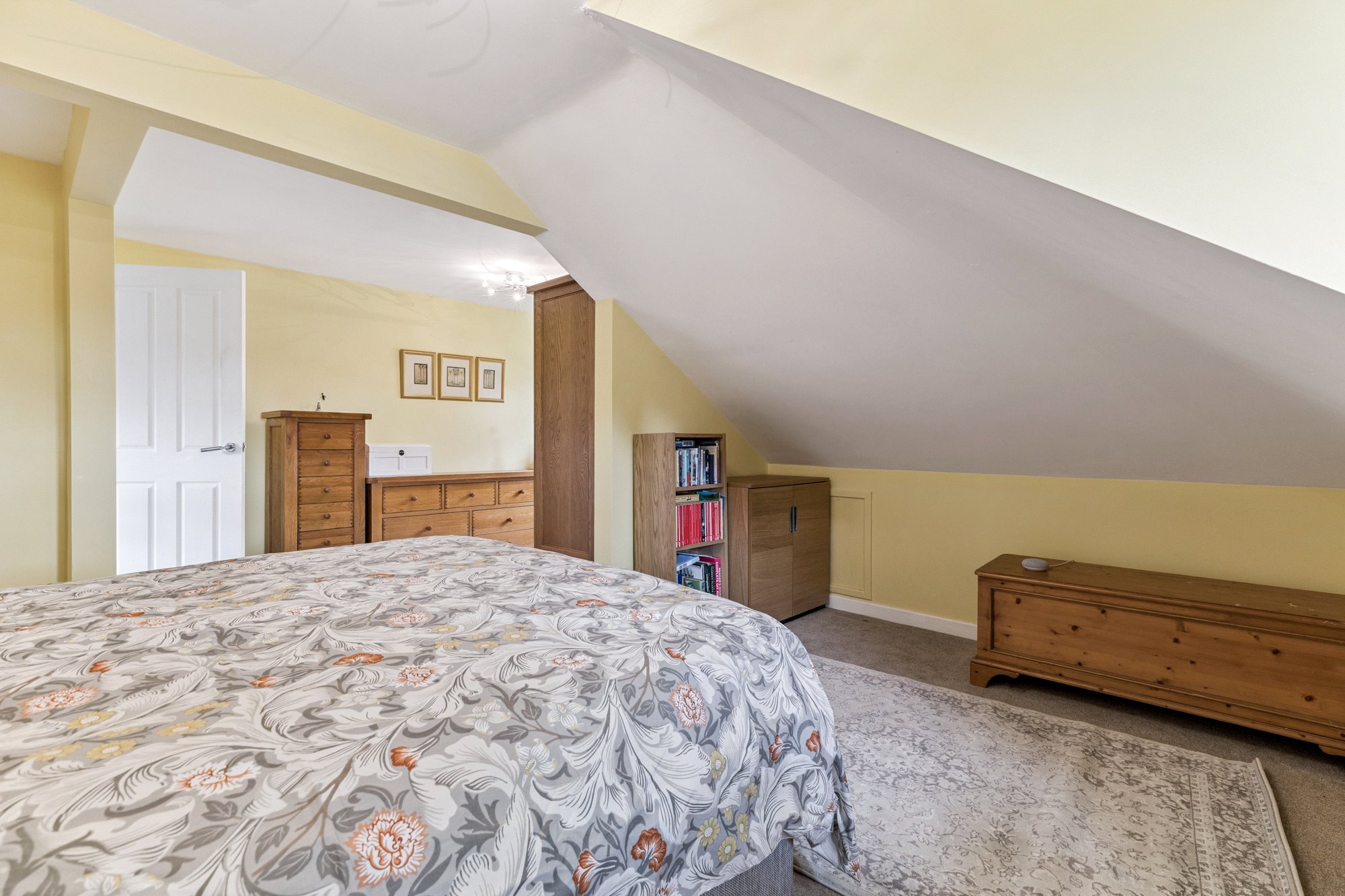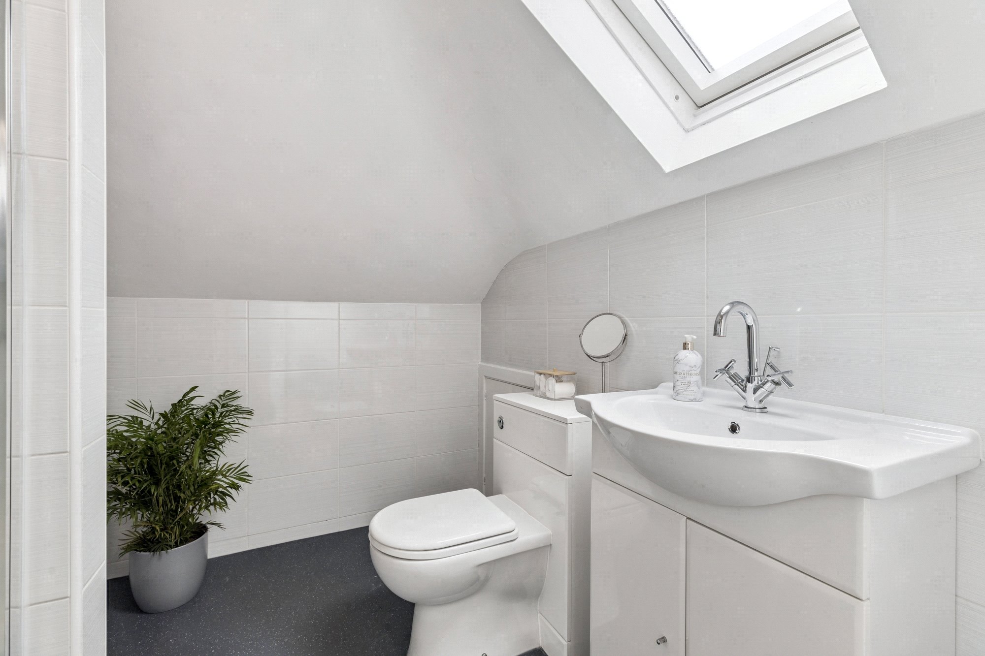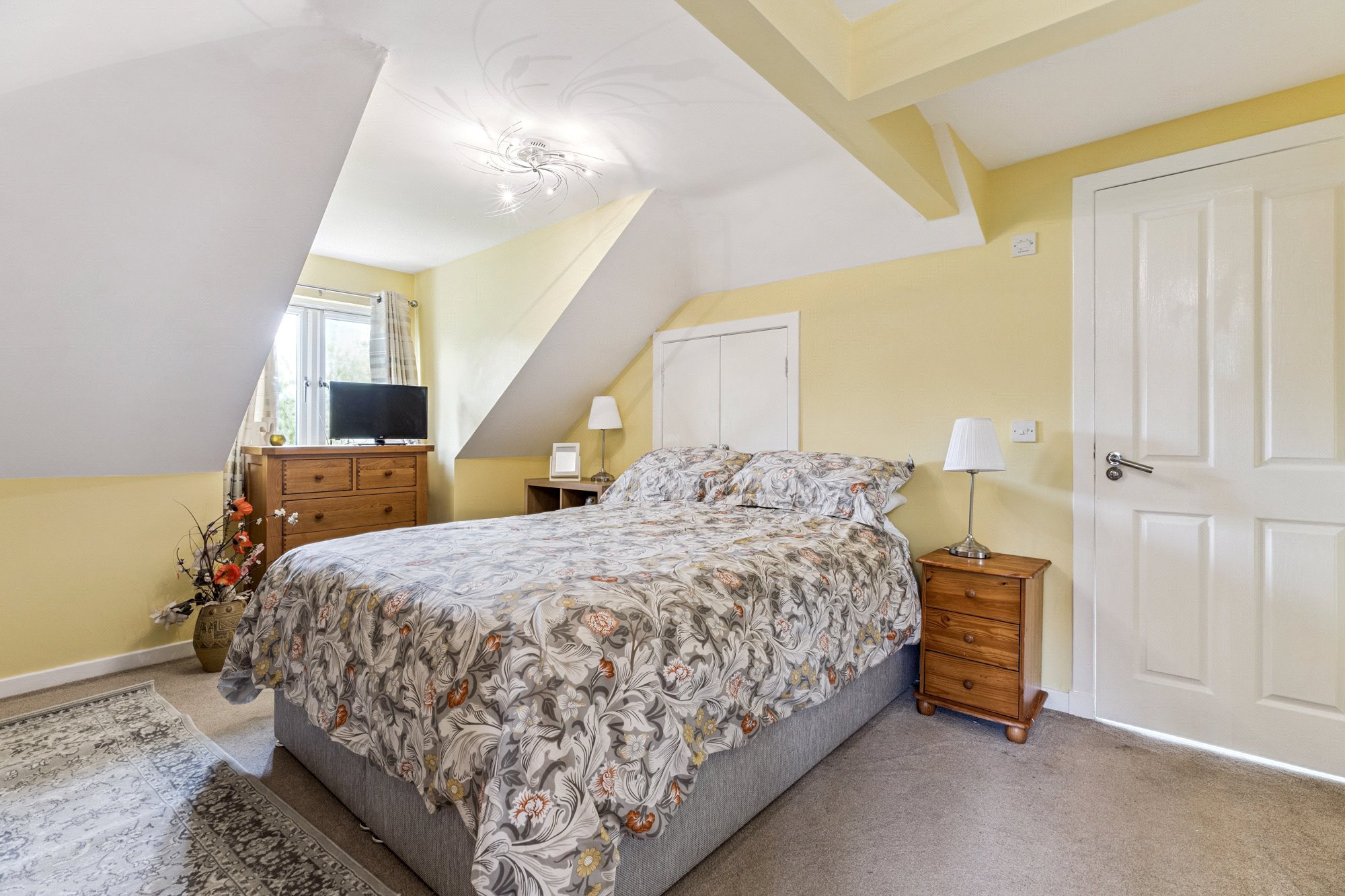 A return flight staircase, with storage cupboard at the half landing, has daylight to the stairwell by virtue of a south-facing dormer window. Upper landing. Primary bedroom with two dormer windows, one to the front (N) and one to the side (E). Very good floor space. Deep storage cupboard. Ensuite, “wet room”, shower room with resin floor with floor drain. Thermostatic shower with both deluge and hand shower heads. Tiled walls. Anthracite coloured towel radiator. Bedroom 2 is another fine sized room with dormer to the front (N) and Velux window to the side (W). Store cupboard. Ensuite shower room with modern white suite. The shower enclosure has an electric Mira Sport shower. Chrome towel radiator. Velux window. Study - a compact little Home Office is ideal for home working. It has a dormer window to the rear (S).