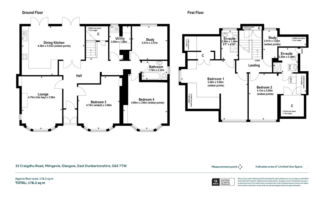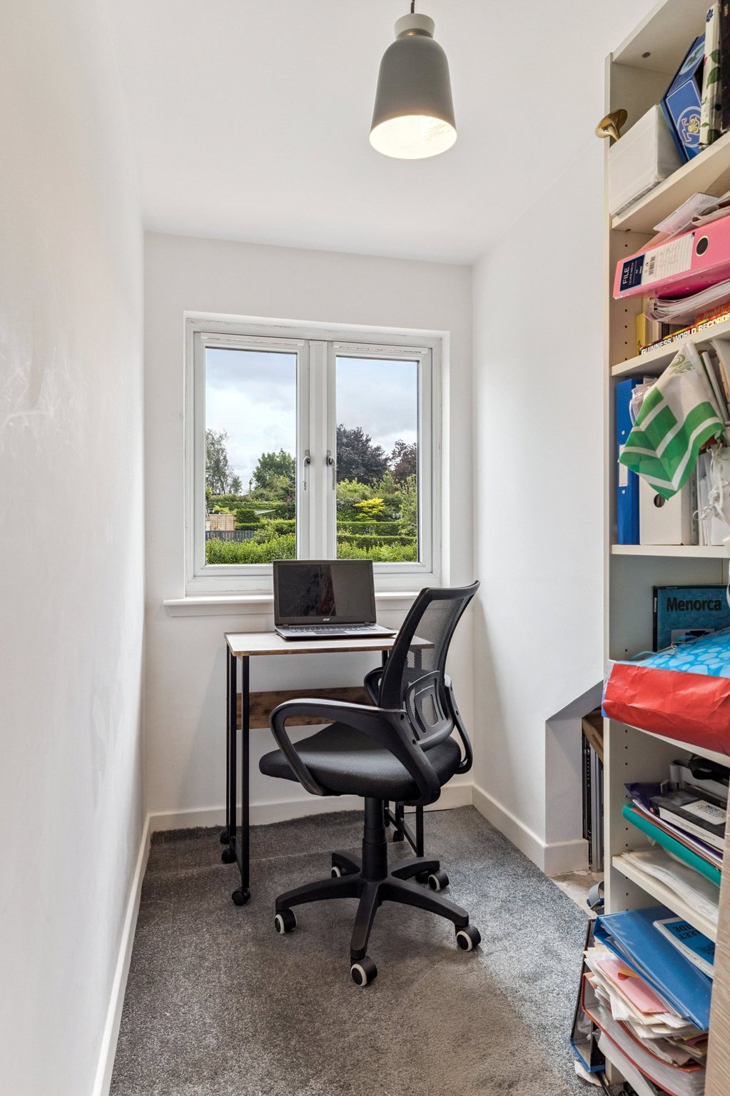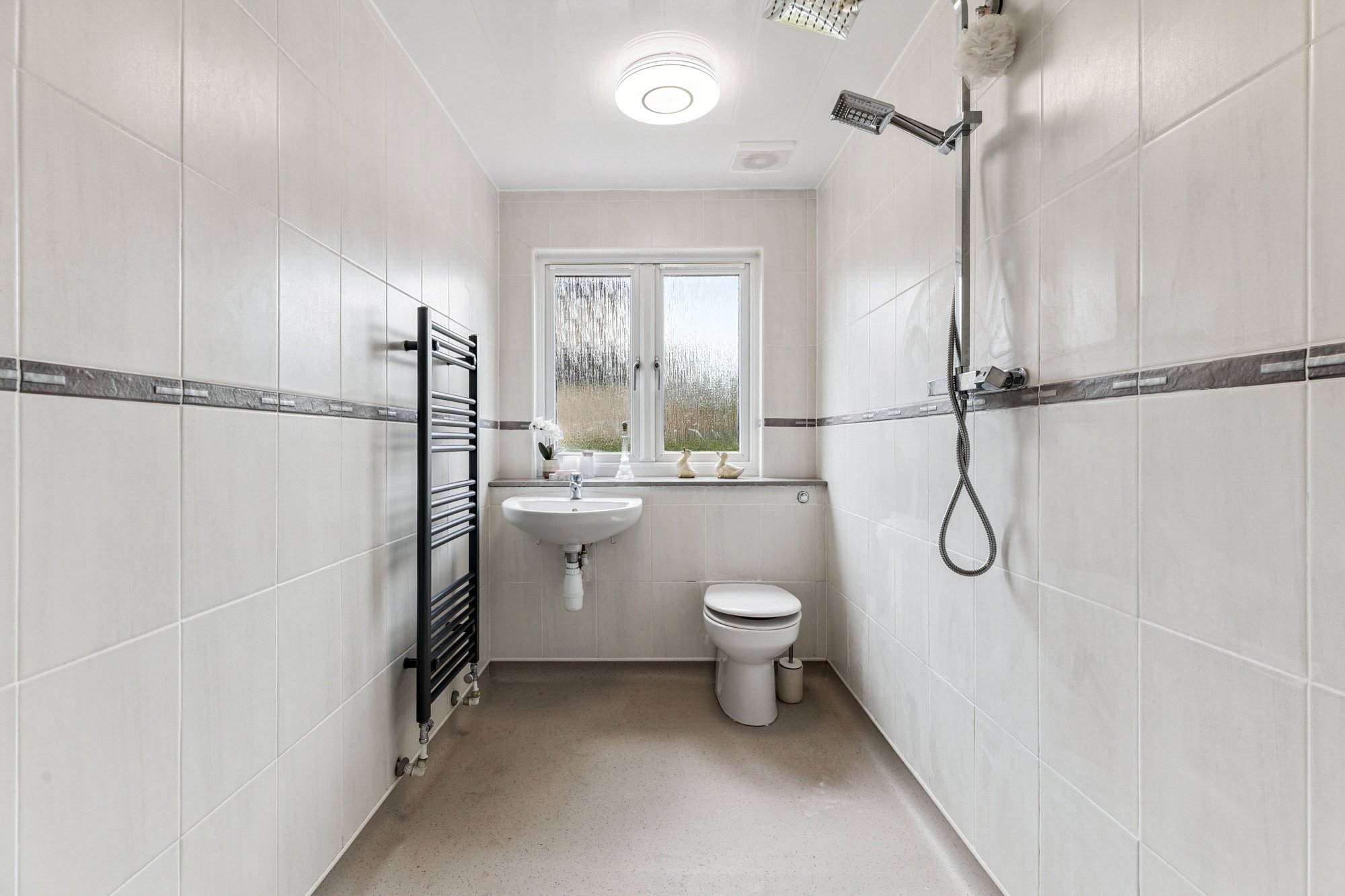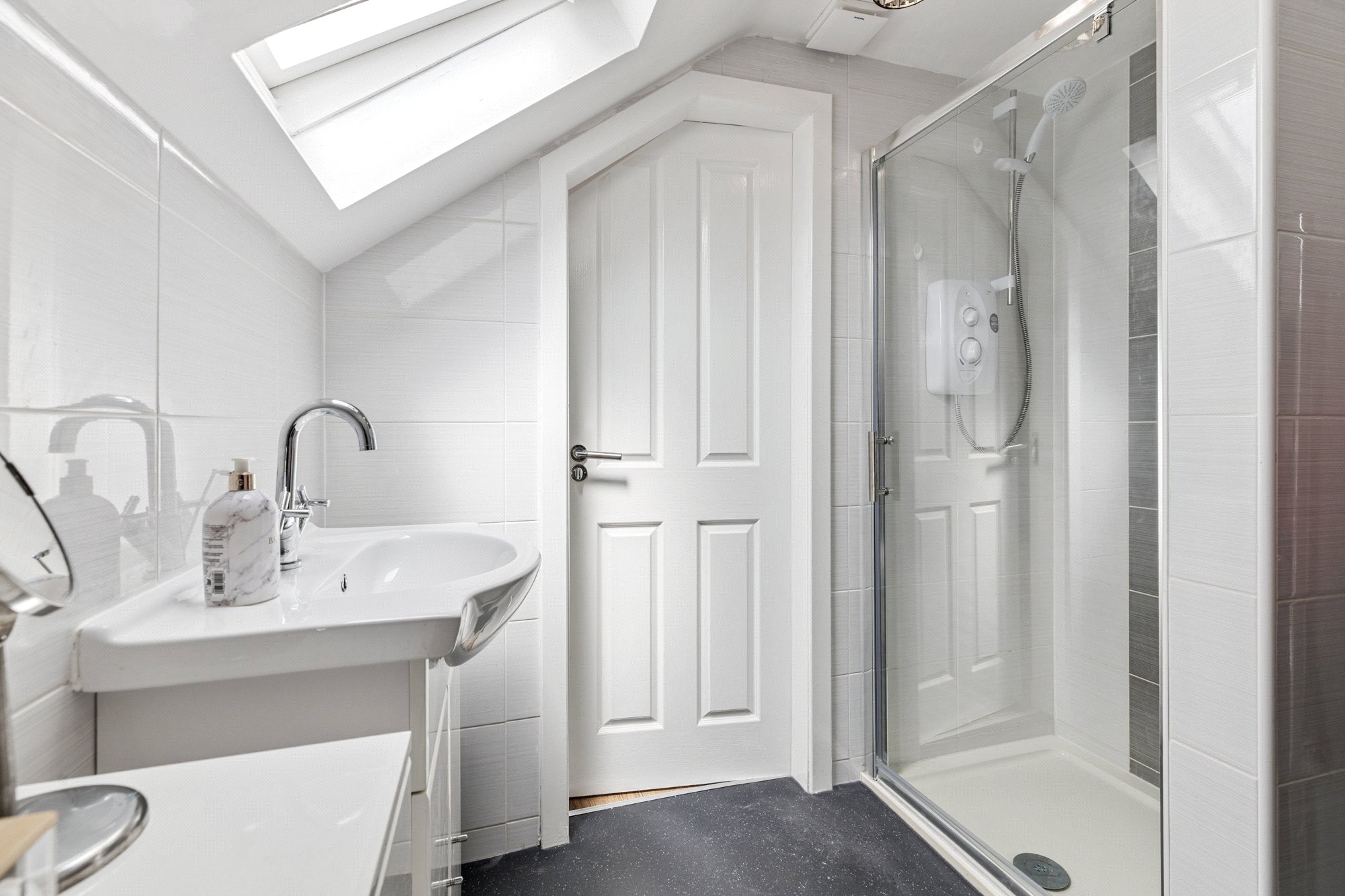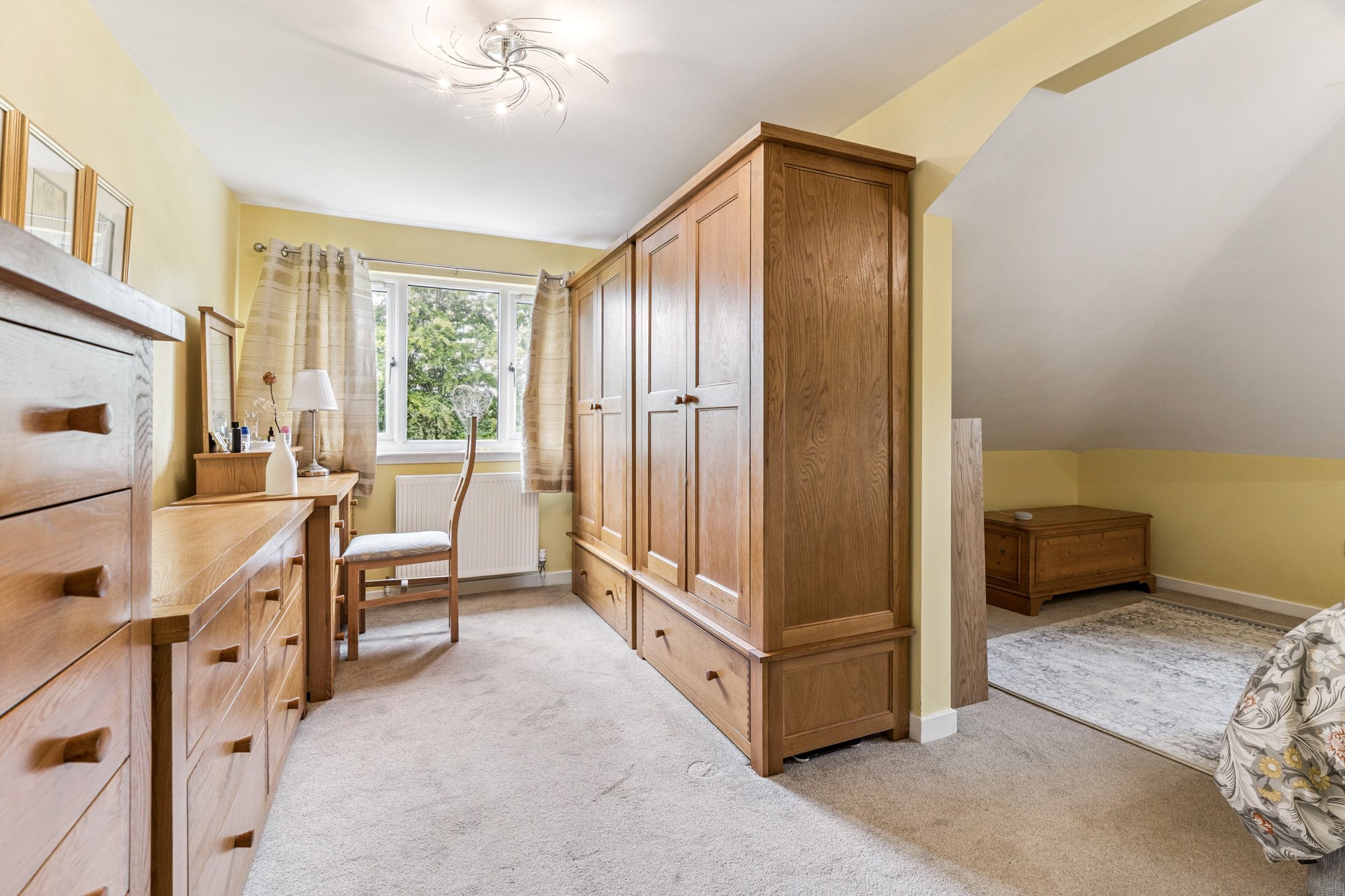 A return flight staircase, with storage cupboard at the half landing, has daylight to the stairwell by virtue of a south-facing dormer window. Upper landing. Primary bedroom with two dormer windows, one to the front (N) and one to the side (E). Very good floor space. Deep storage cupboard. Ensuite, “wet room”, shower room with resin floor with floor drain. Thermostatic shower with both deluge and hand shower heads. Tiled walls. Anthracite coloured towel radiator. Bedroom 2 is another fine sized room with dormer to the front (N) and Velux window to the side (W). Store cupboard. Ensuite shower room with modern white suite. The shower enclosure has an electric Mira Sport shower. Chrome towel radiator. Velux window. Study - a compact little Home Office is ideal for home working. It has a dormer window to the rear (S).