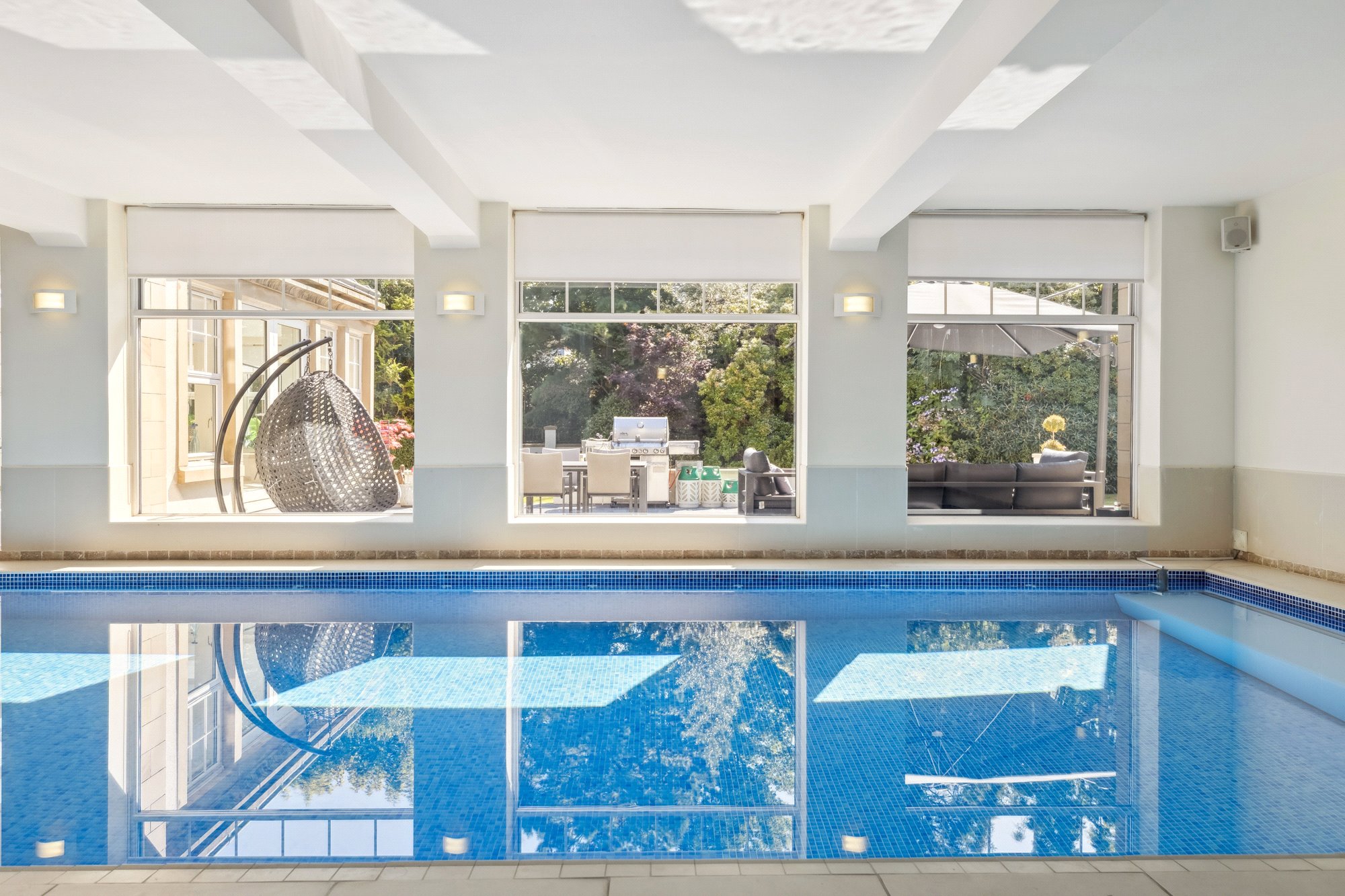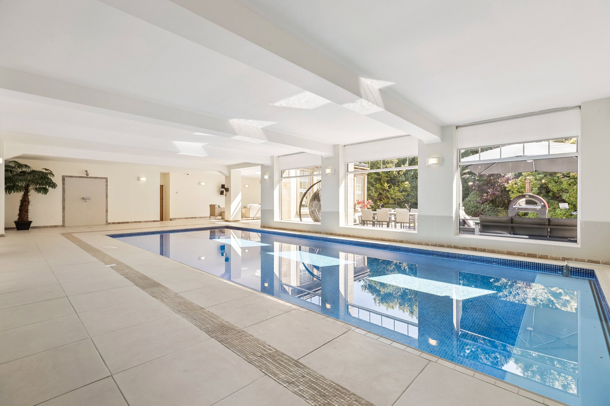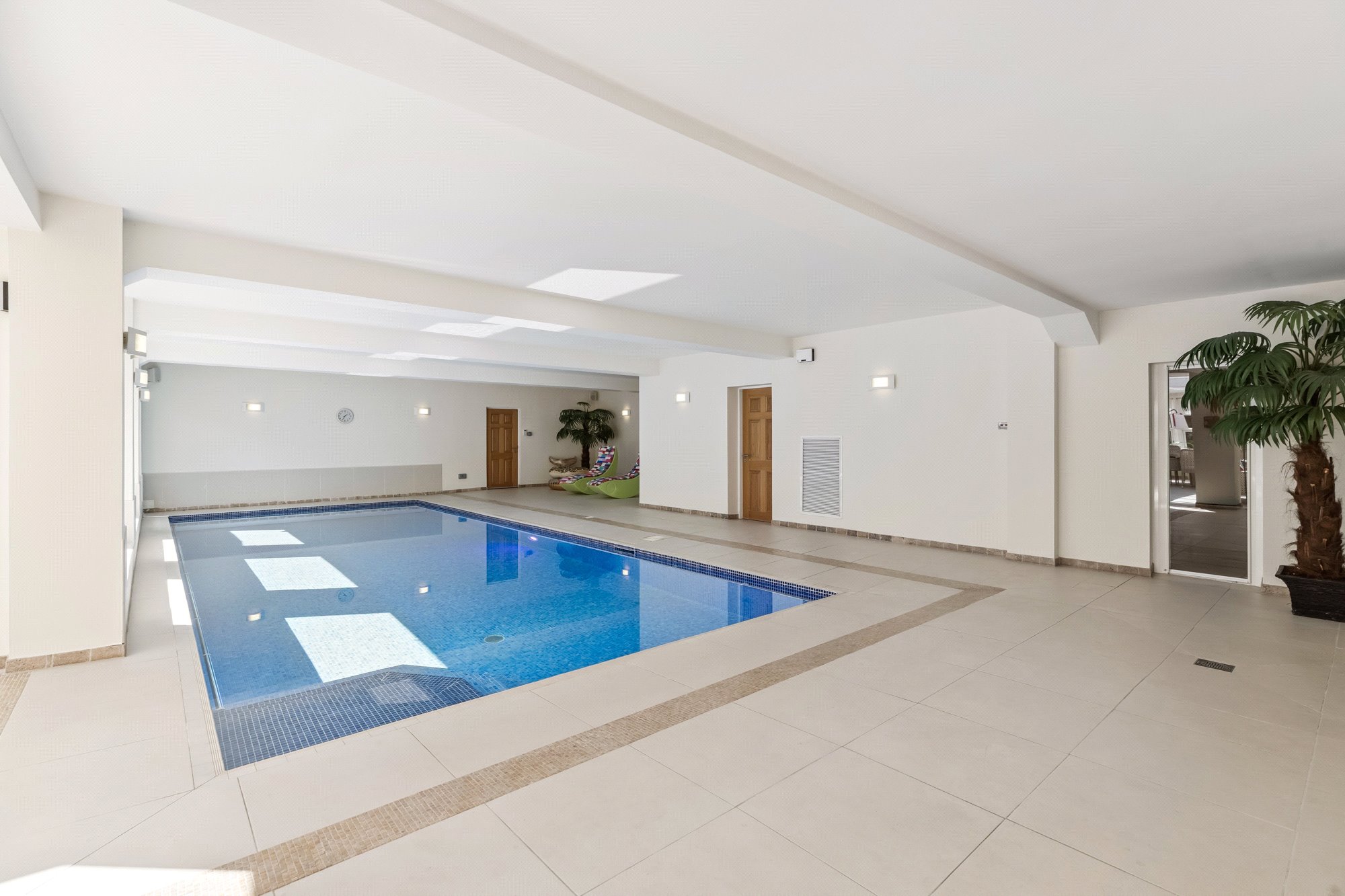 Swimming pool complex with large pool, sitting/dining area in an Orangerie style with large roof light, changing room with shower, WC, steam room, plant room, private “west” entrance hall.