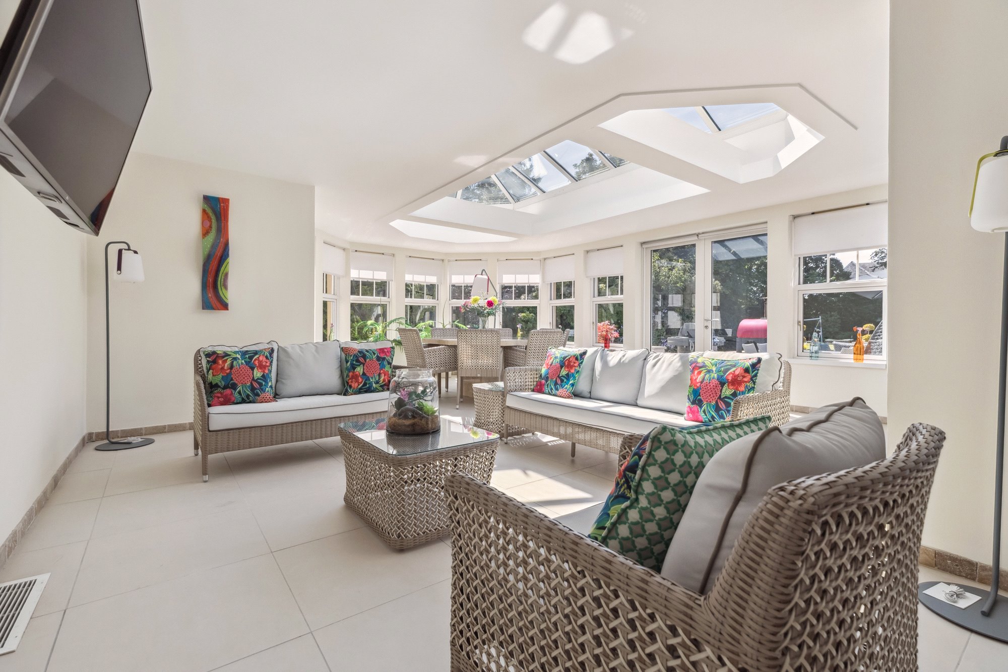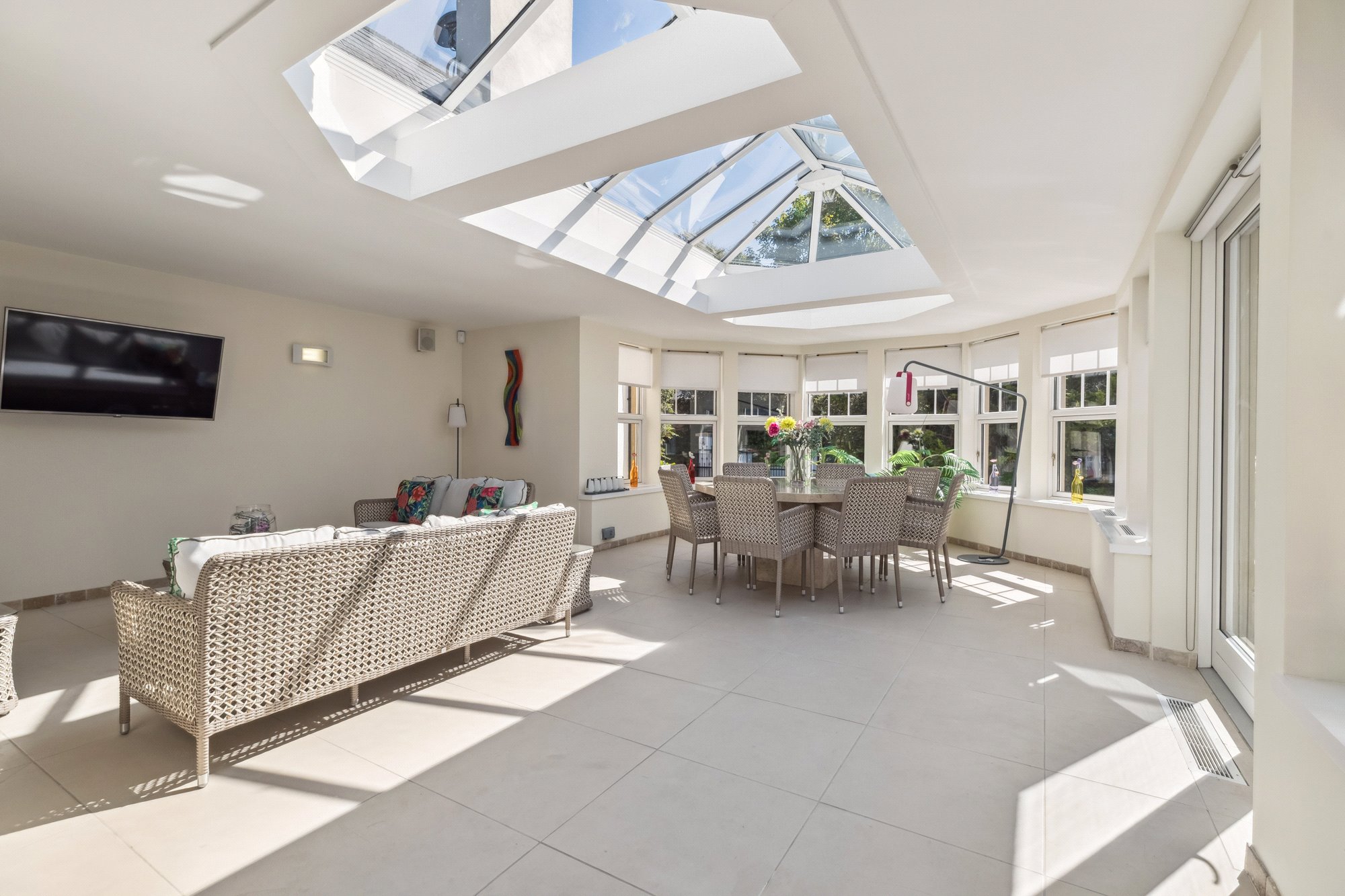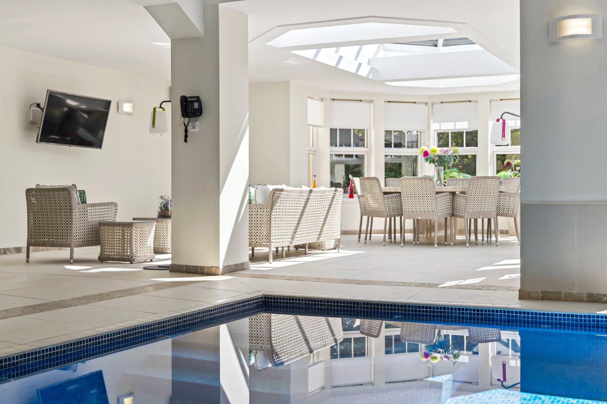 Swimming pool complex with large pool, sitting/dining area in an Orangerie style with large roof light, changing room with shower, WC, steam room, plant room, private “west” entrance hall.