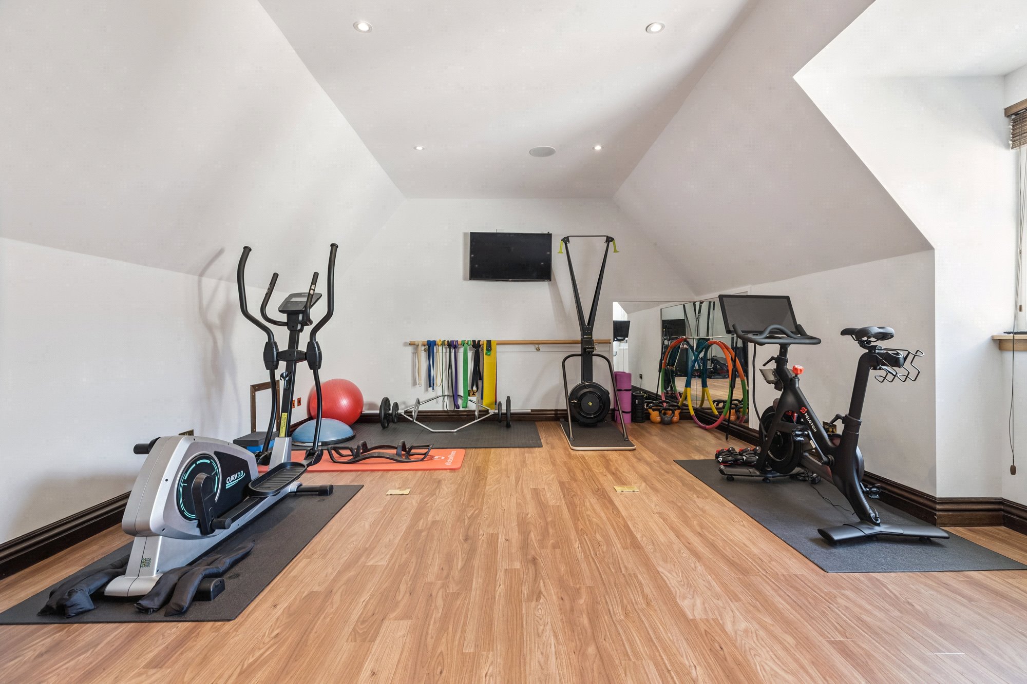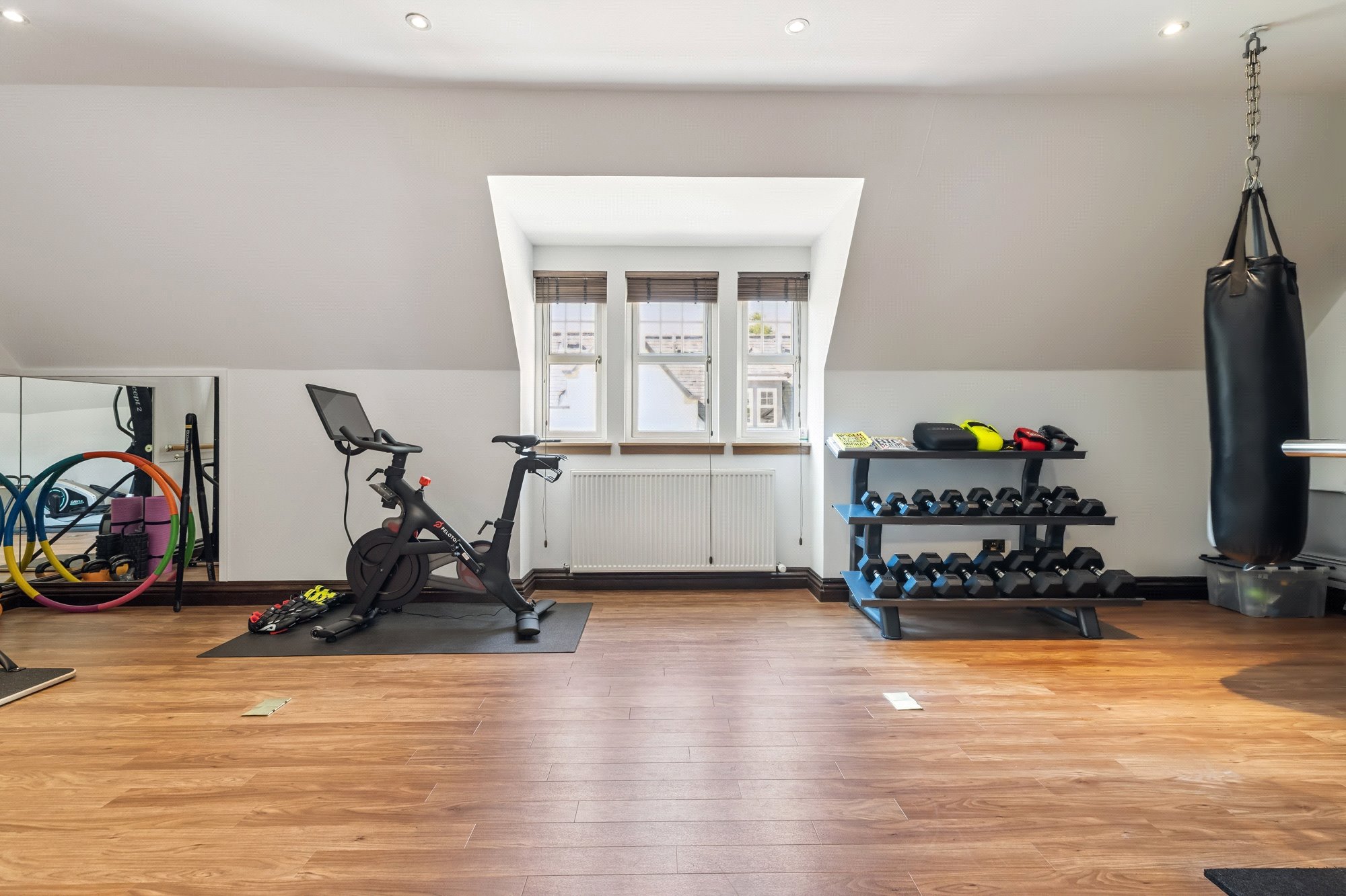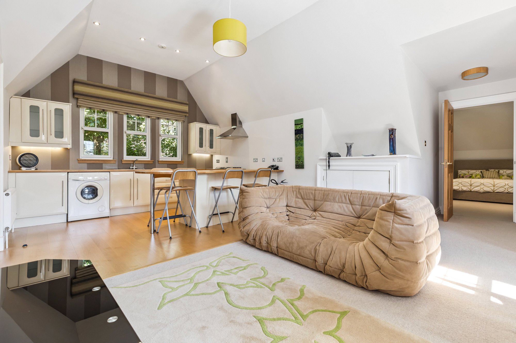 Lounge with open plan kitchen, bedroom, shower room, gymnasium.