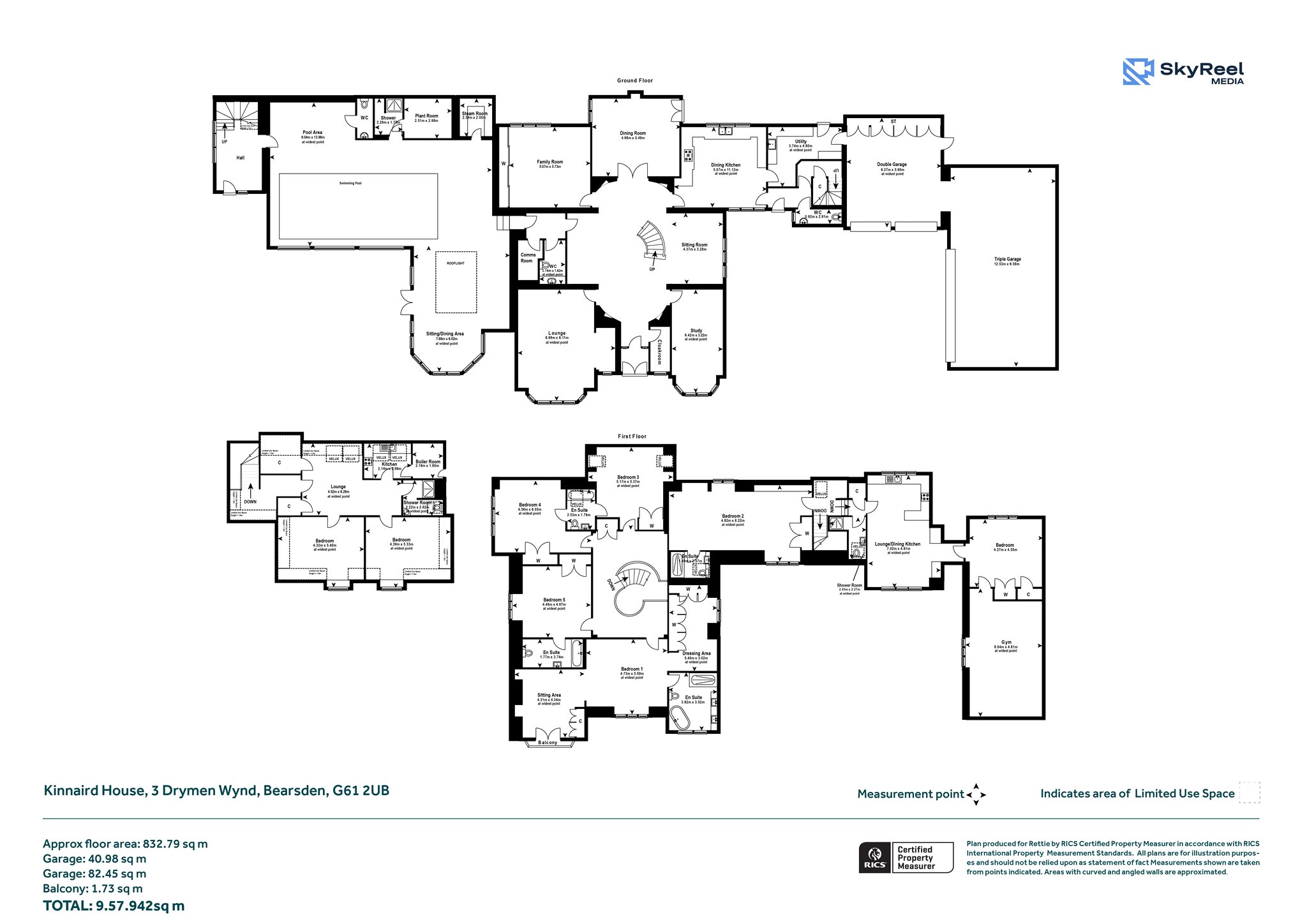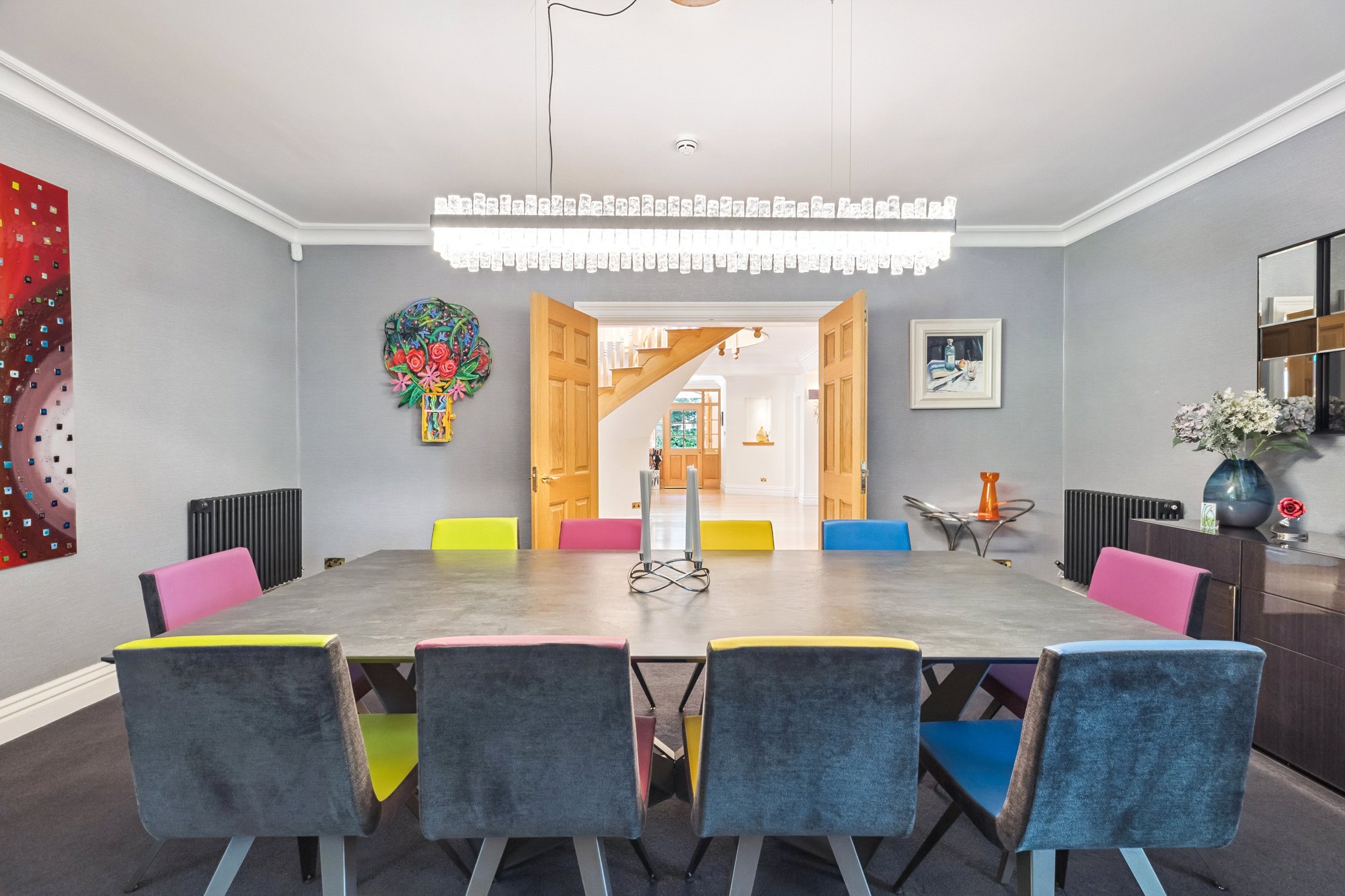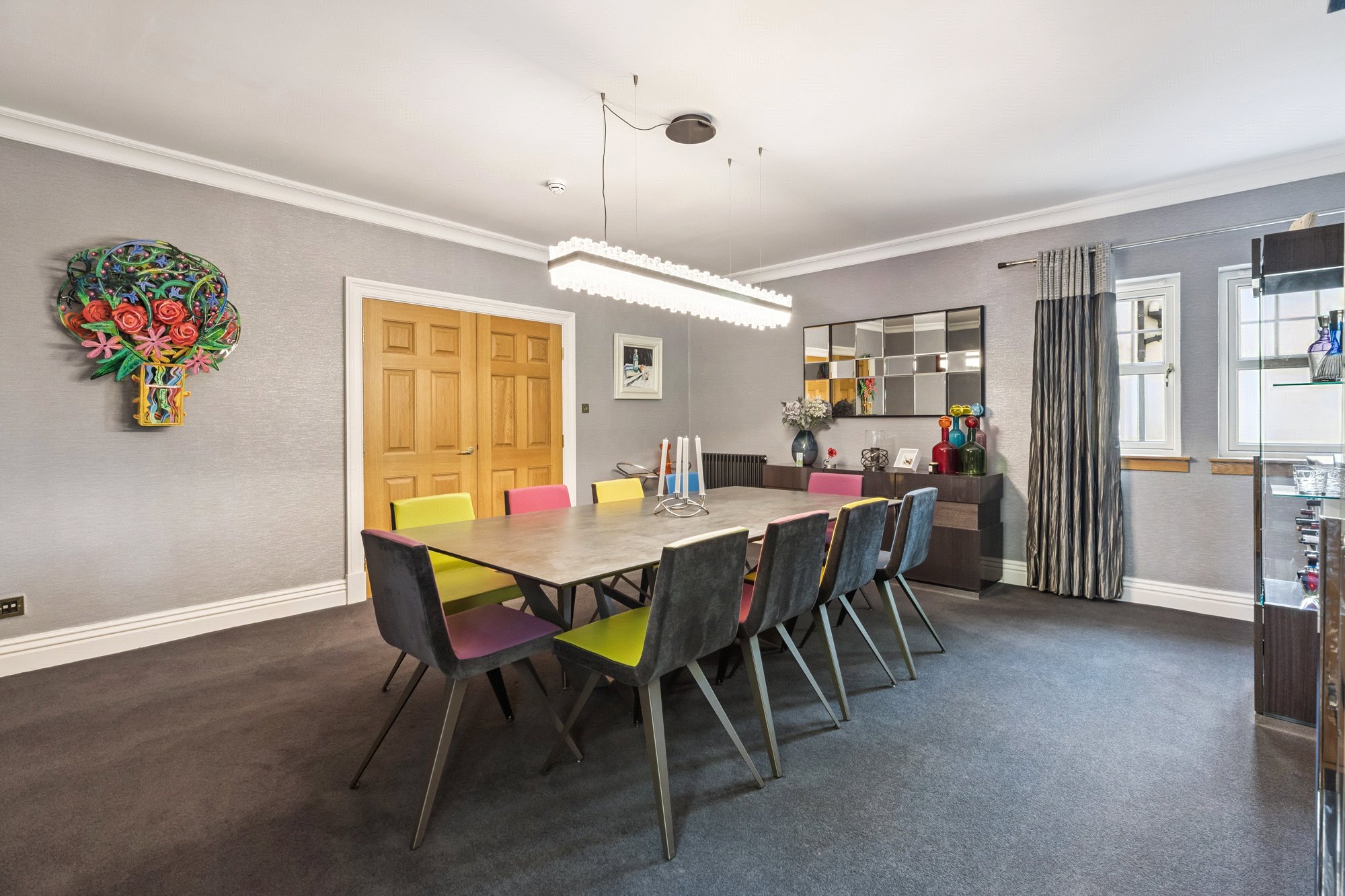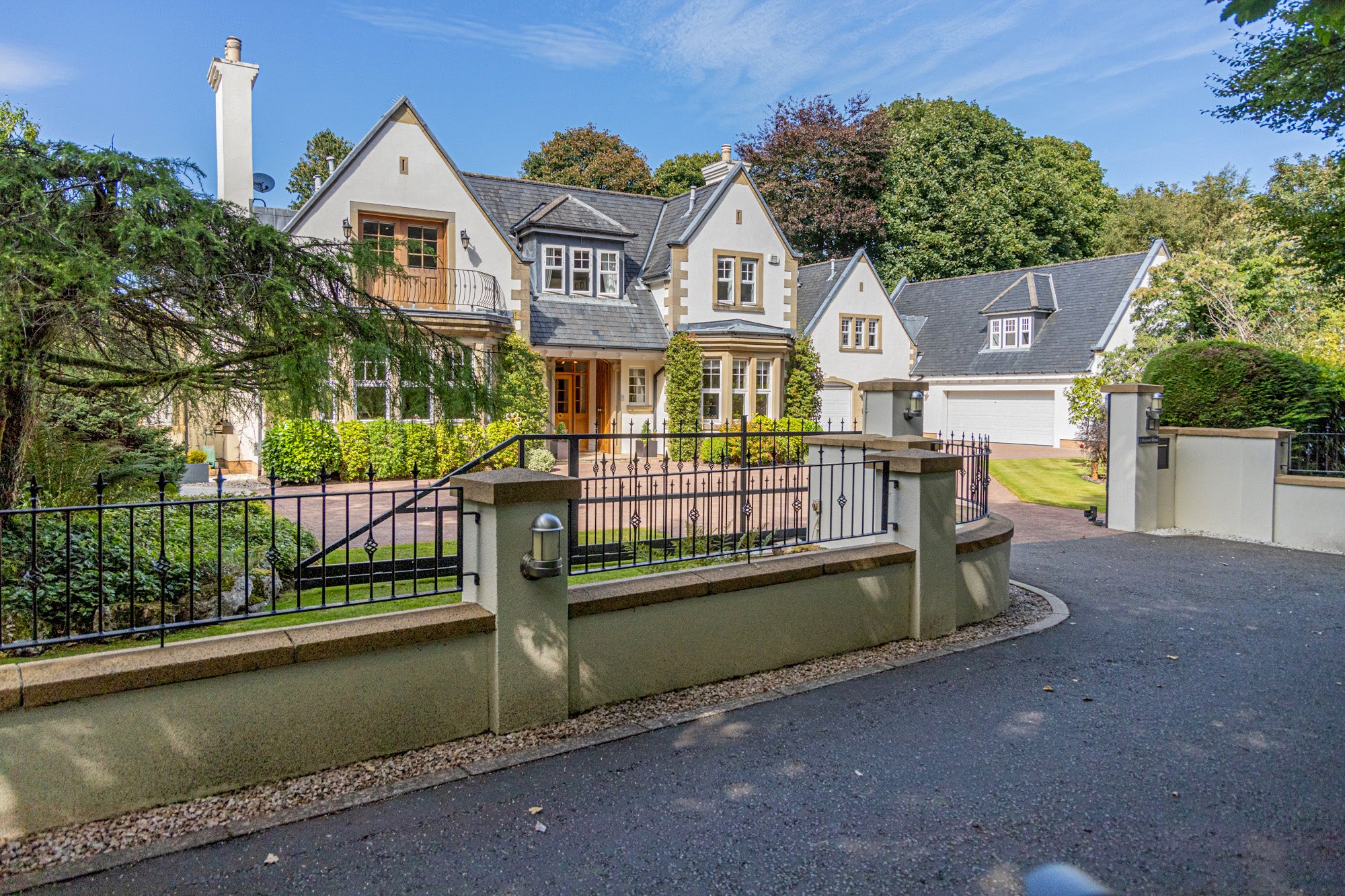 The main, central, house has five bedrooms and five public rooms with the east wing providing a guest/staff flat and gym with the west wing home to the large swimming pool facility, with Orangerie style sitting/dining area, and a further self-contained two-bedroom flat for family/guests/staff.