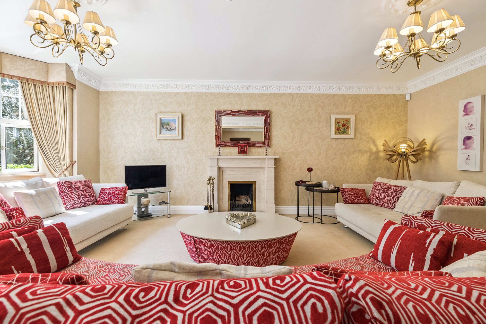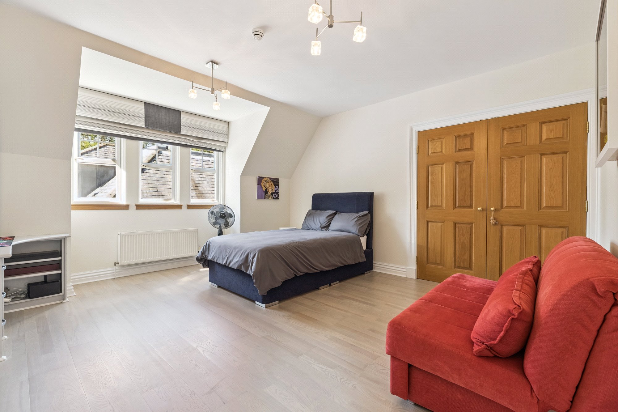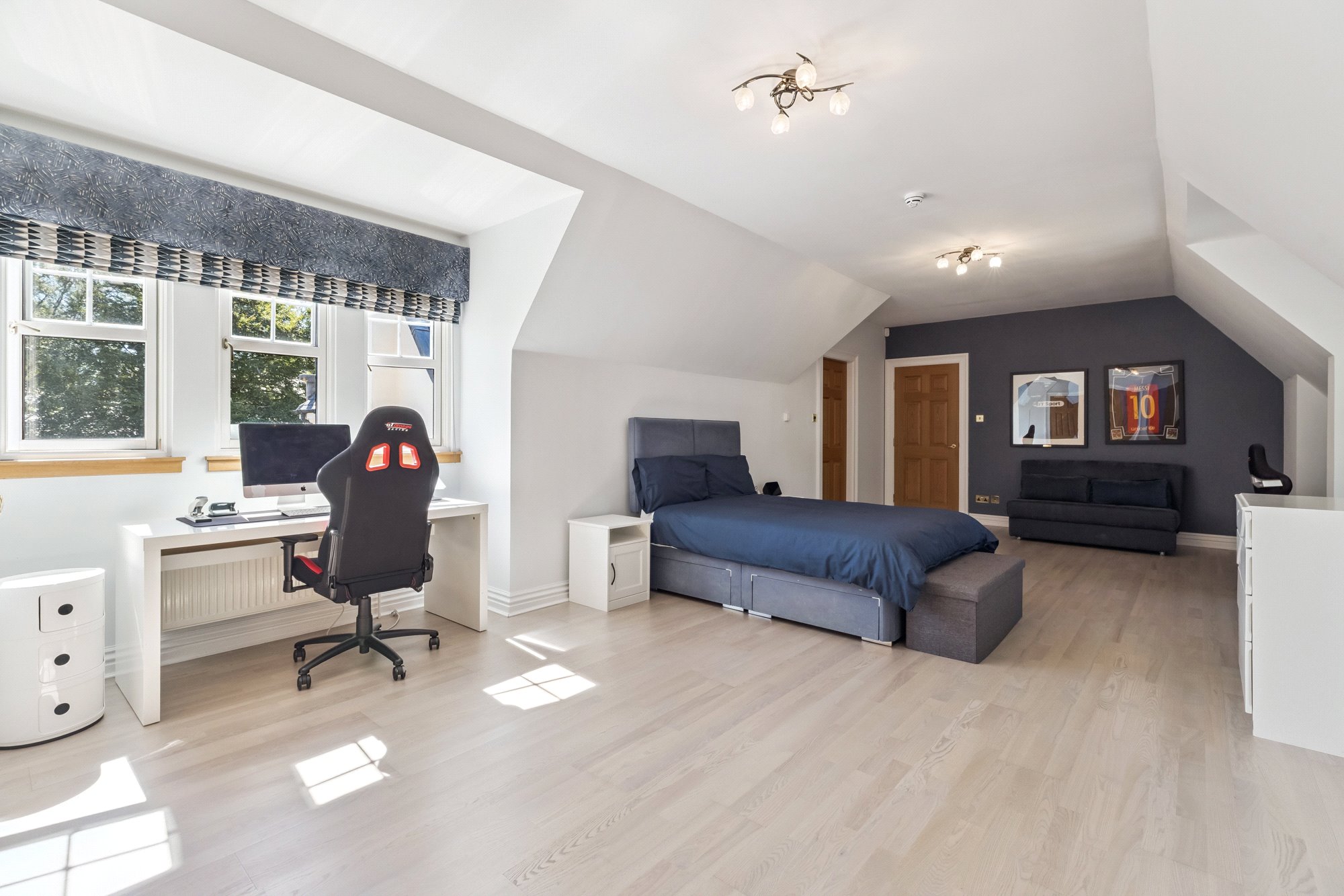 The main, central, house has five bedrooms and five public rooms with the east wing providing a guest/staff flat and gym with the west wing home to the large swimming pool facility, with Orangerie style sitting/dining area, and a further self-contained two-bedroom flat for family/guests/staff.