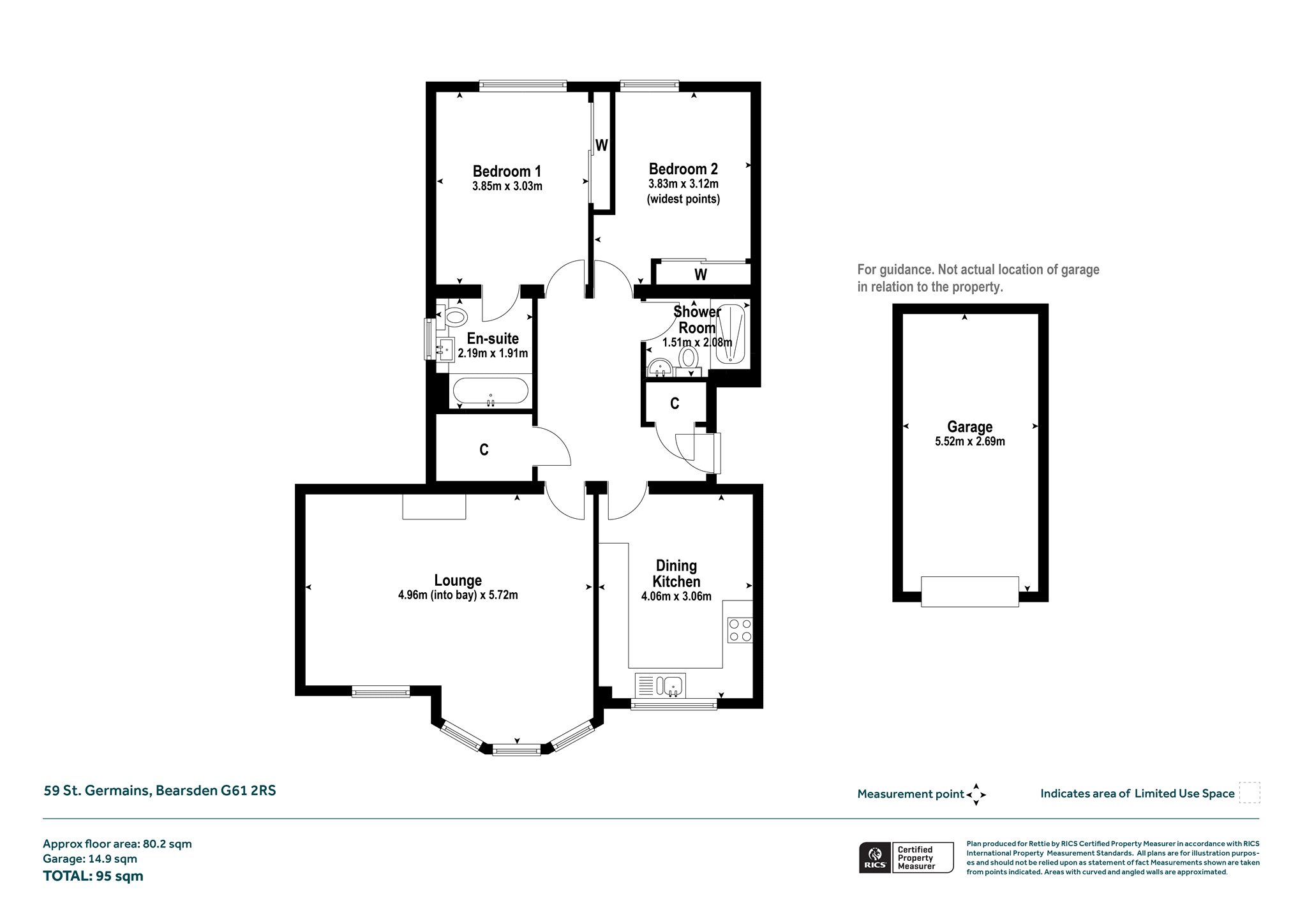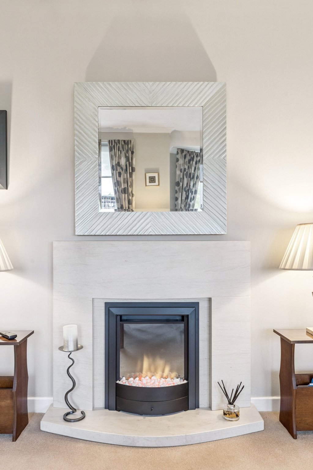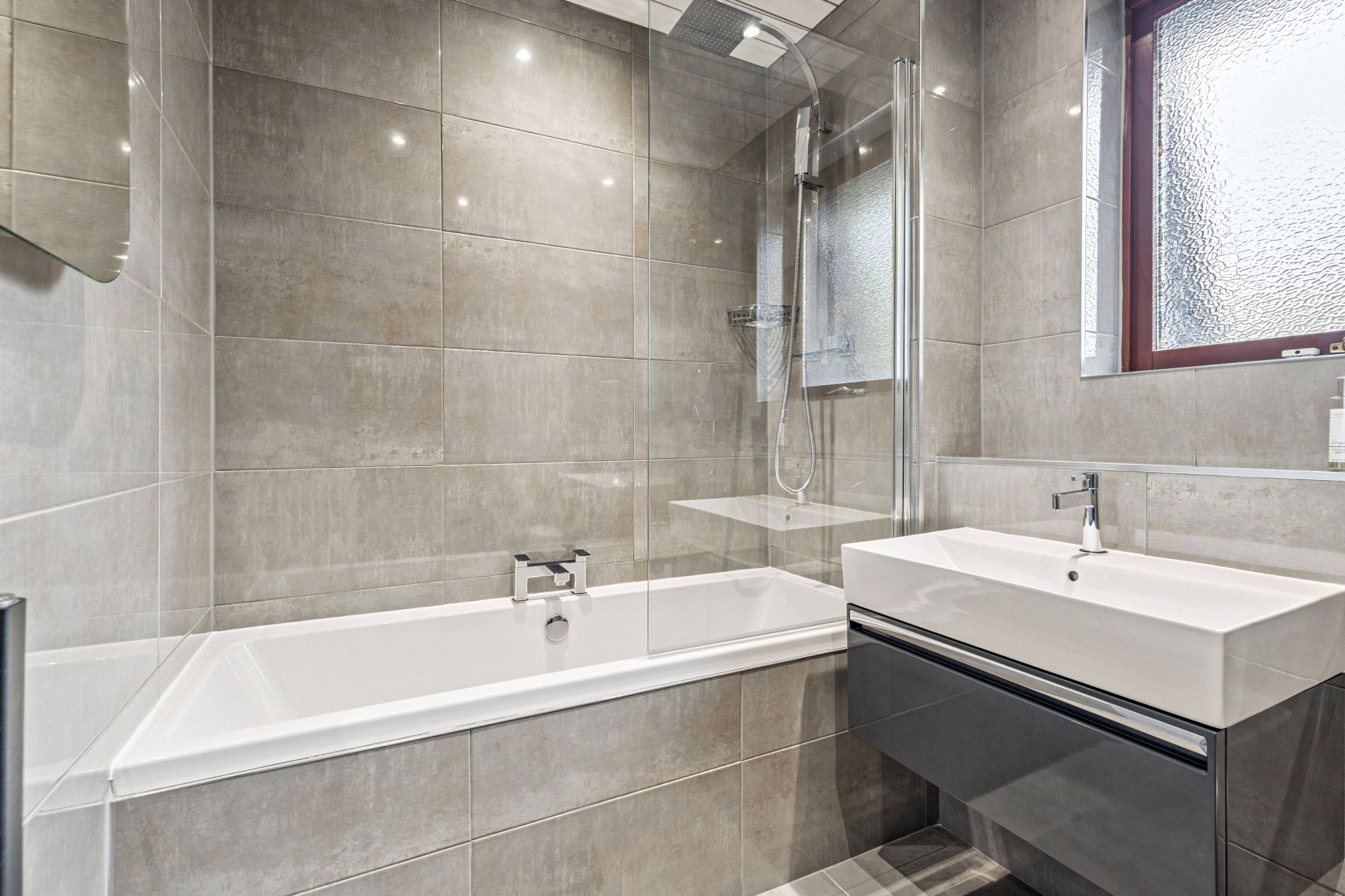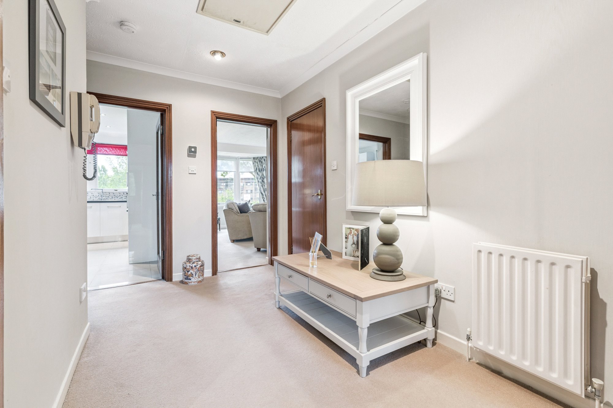 Initially is a resident’s entranceway, secured by a door entry phone system. This accesses a communal, carpeted, hall and staircase. The flat’s private hall is a good size and has excellent storage facility as well as a loft-hatch to a useful, insulated, attic space. The south facing lounge is of a size for it to be a lounge/dining room if required. It has two sets of windows to the front, including a bay window, with a particularly nice outlook. A limestone fireplace, with an electric fire, makes for a lovely focal point to the room. The kitchen was renewed about eleven years ago and boasts a range of white high-gloss units with contrasting charcoal coloured laminate worktops. The integrated appliances include - halogen hob, double oven with grill, microwave, cooker hood and, concealed, a slimline dishwasher and a fridge-freezer. Flooring here features a large format ceramic floor tile which makes for a rather attractive design. As with the lounge the two-frame south facing window lets the light flood into the kitchen. Two double bedrooms, both have fitted wardrobes with sliding mirror doors. The primary bedroom benefits from a superb ensuite bathroom which has been impressively renewed with contemporary white suite, including a “floating” whb unit. Quality floor and wall tiling. Over the bath is a thermostatic shower with both deluge and hand shower heads. A heated towel radiator is finished in a cool matt anthracite colour. Side window for daylight. To service bedroom 2 and to act as a guest toilet is another superbly renewed, fully tiled, shower room with an easy-to-access, oversized, shower enclosure with another powerful thermostatic shower with deluge and hand shower heads. Anthracite coloured to radiator again.