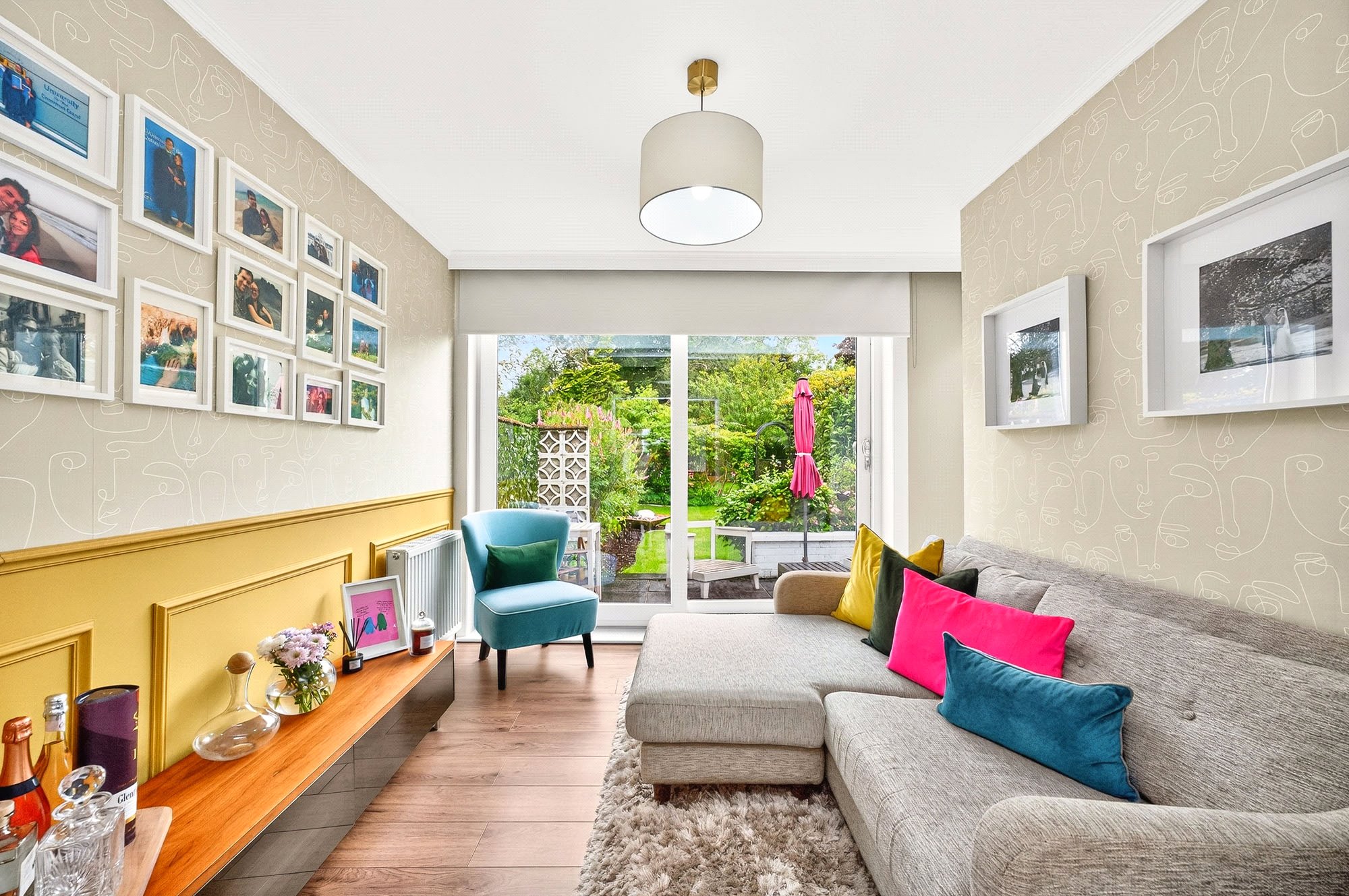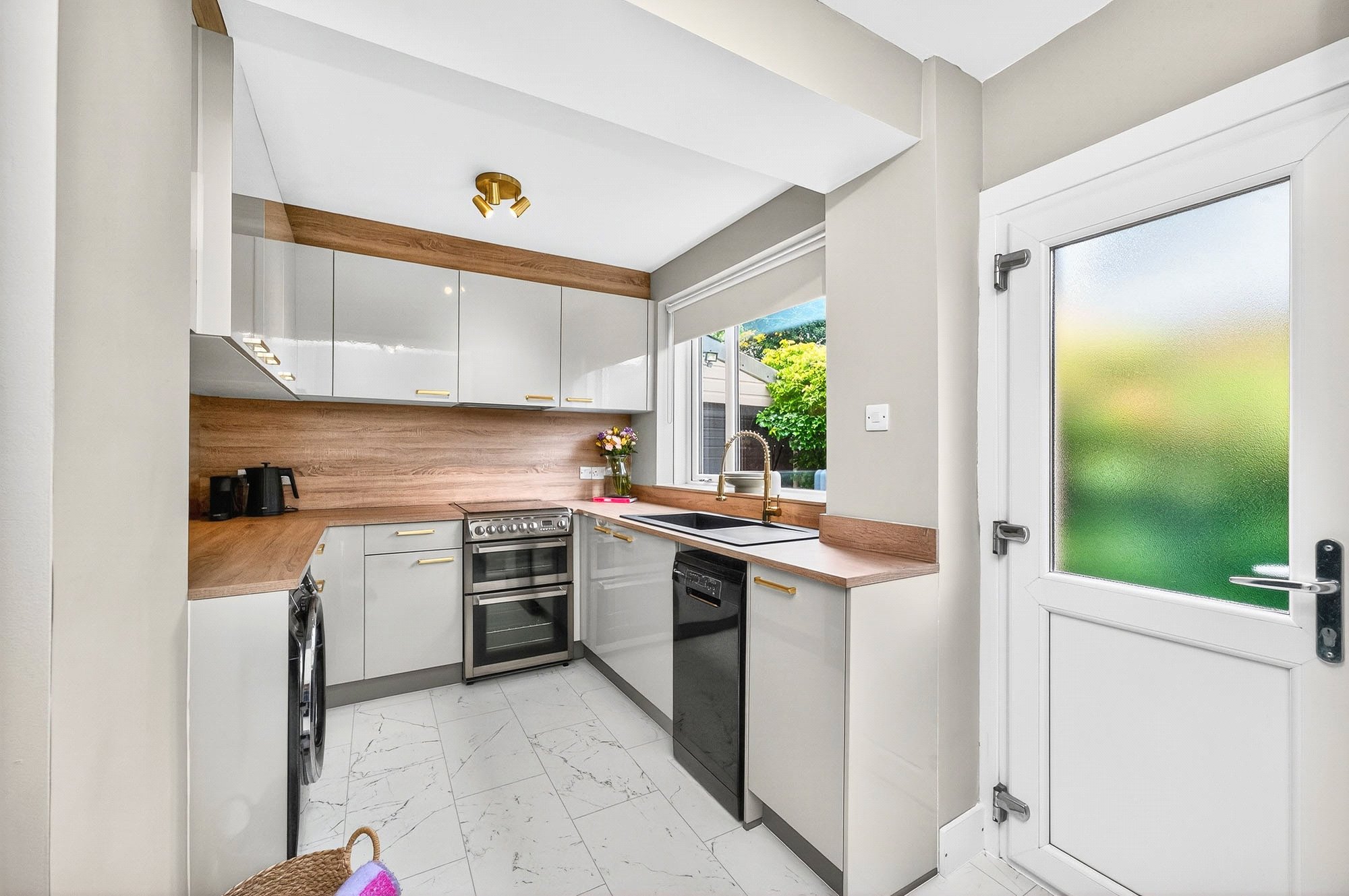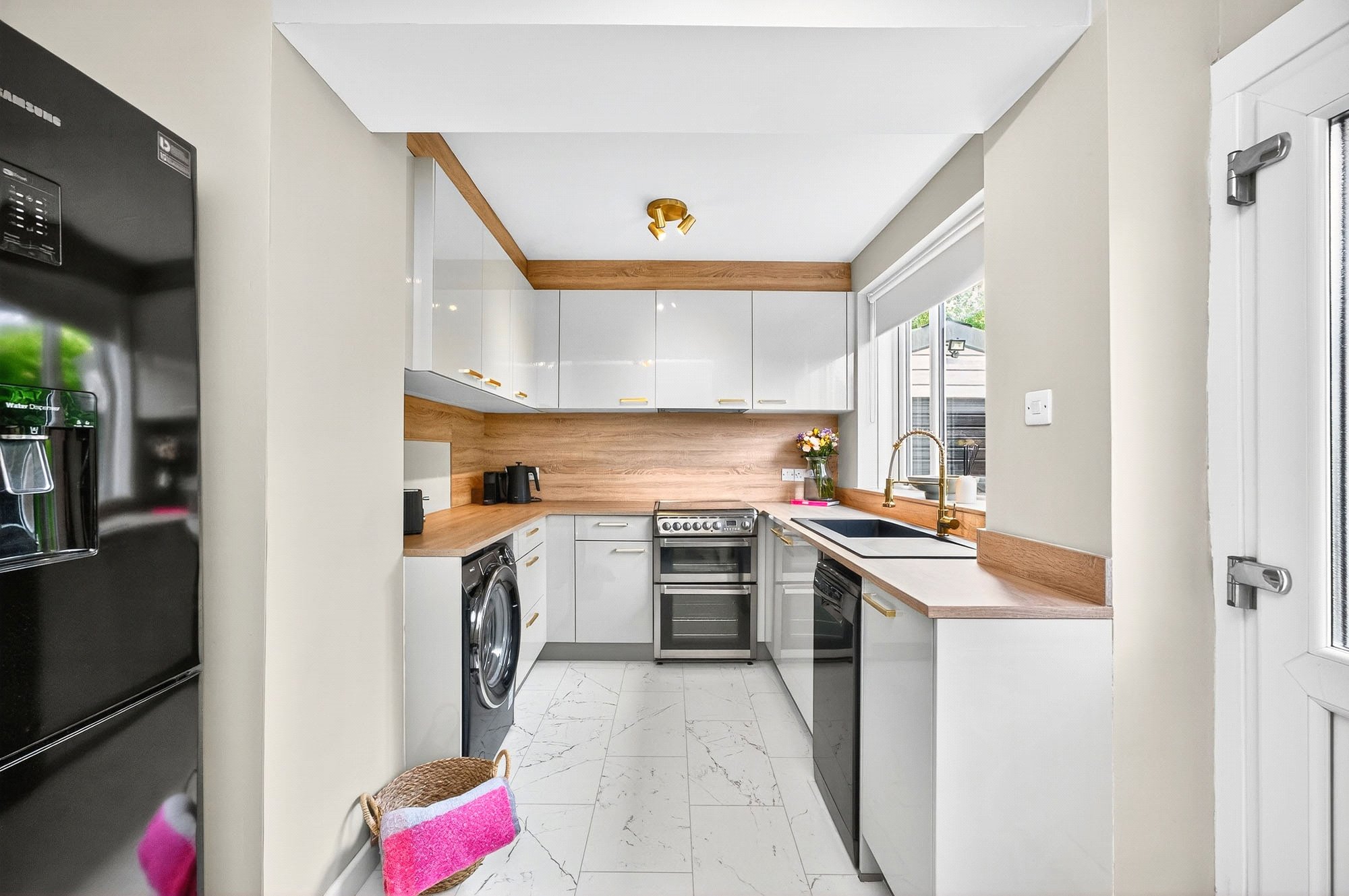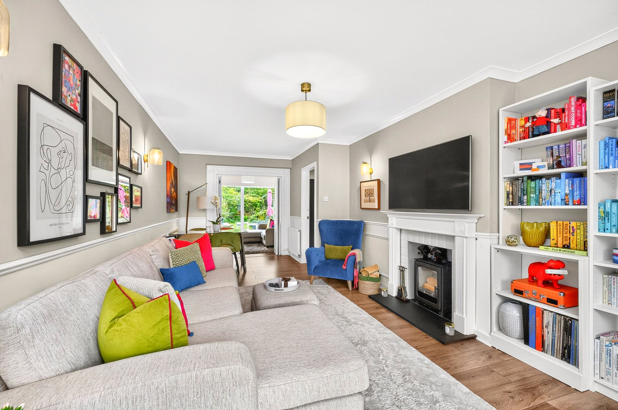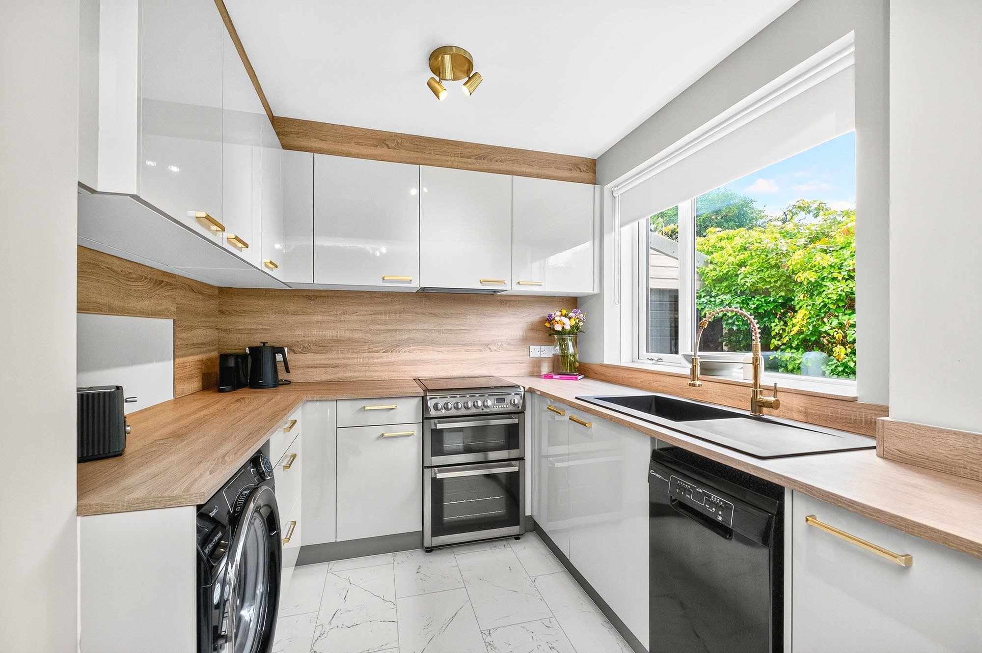 Reception hall. WC with a smart and clever space-saving “combination” WC/WHB unit. A fine open plan lounge/dining room with bay window and fireplace a modern log-burning stove. The rear extension provides a really lovely snug (sitting room) with an almost seamless connection to the rear garden, featuring an impressive (large) set of patio doors plus a feature “fixed frame”, almost floor-to-ceiling, side window. A really lovely space. The kitchen was renewed, with German units, in 2020 and feature smart flush, high-gloss, units in a pale taupe colour offset by brass coloured handles and both oak laminate worktops and wall panels - very appealing design. A new black sink unit along with black coloured dishwasher, washing machine, and fridge-freezer makes for a nice contrast. Additionally there is a cooker with gas hobs and a cooker hood.