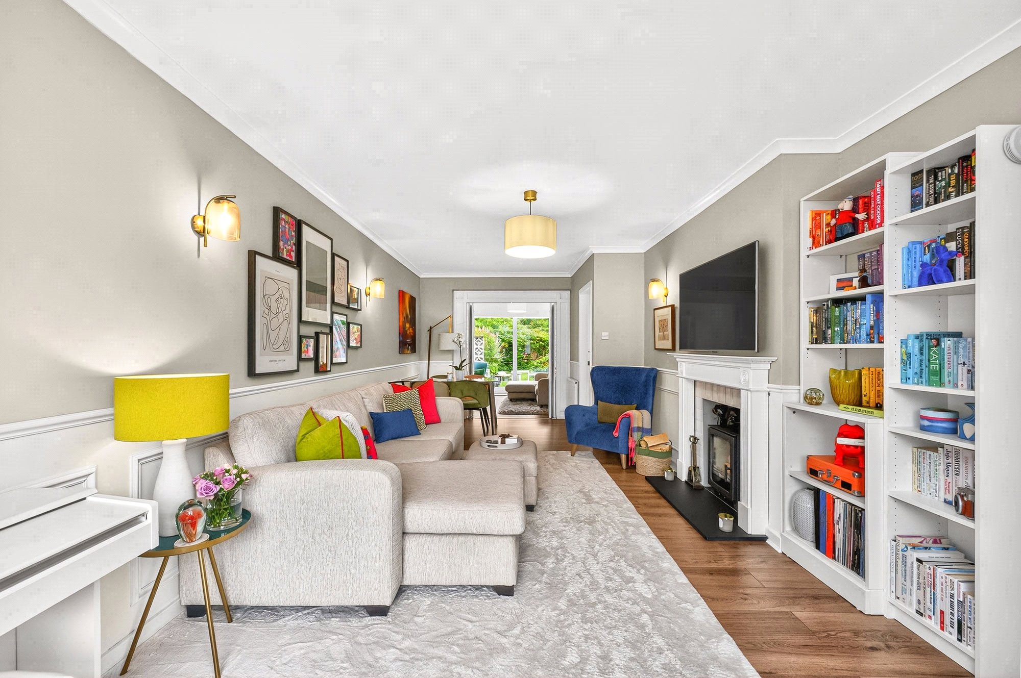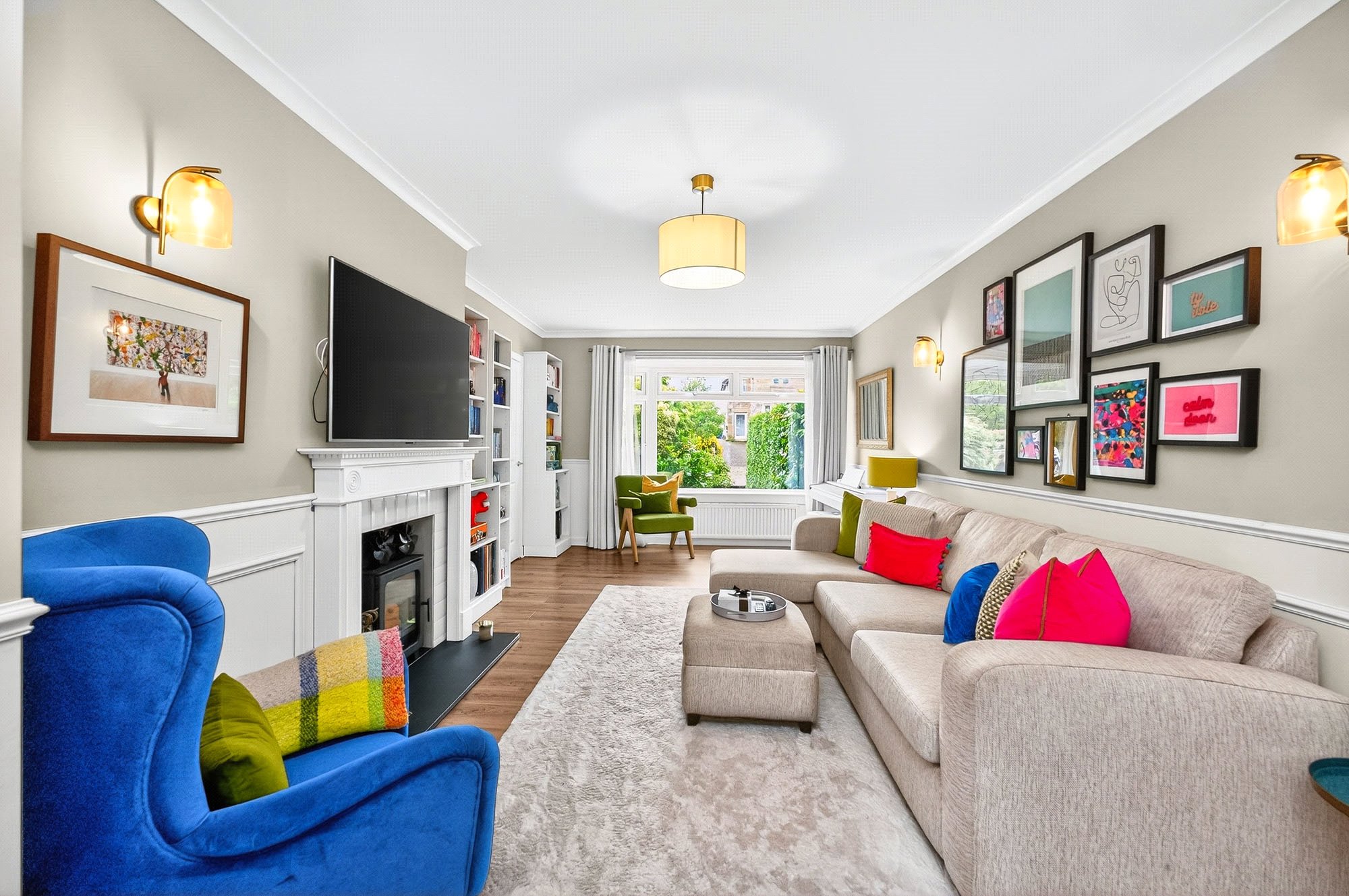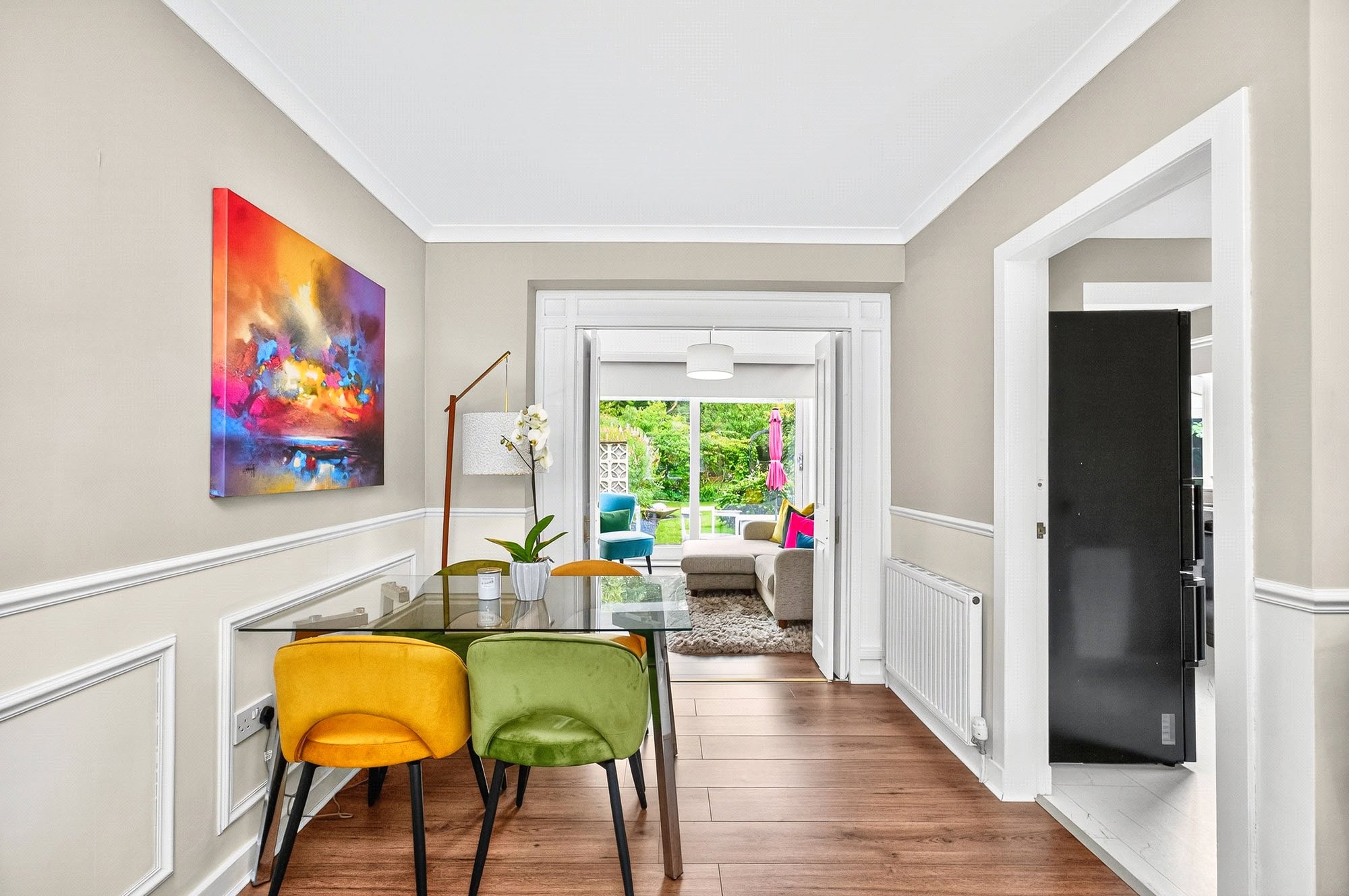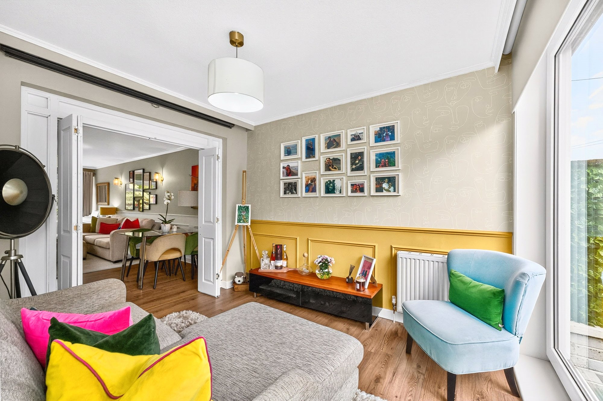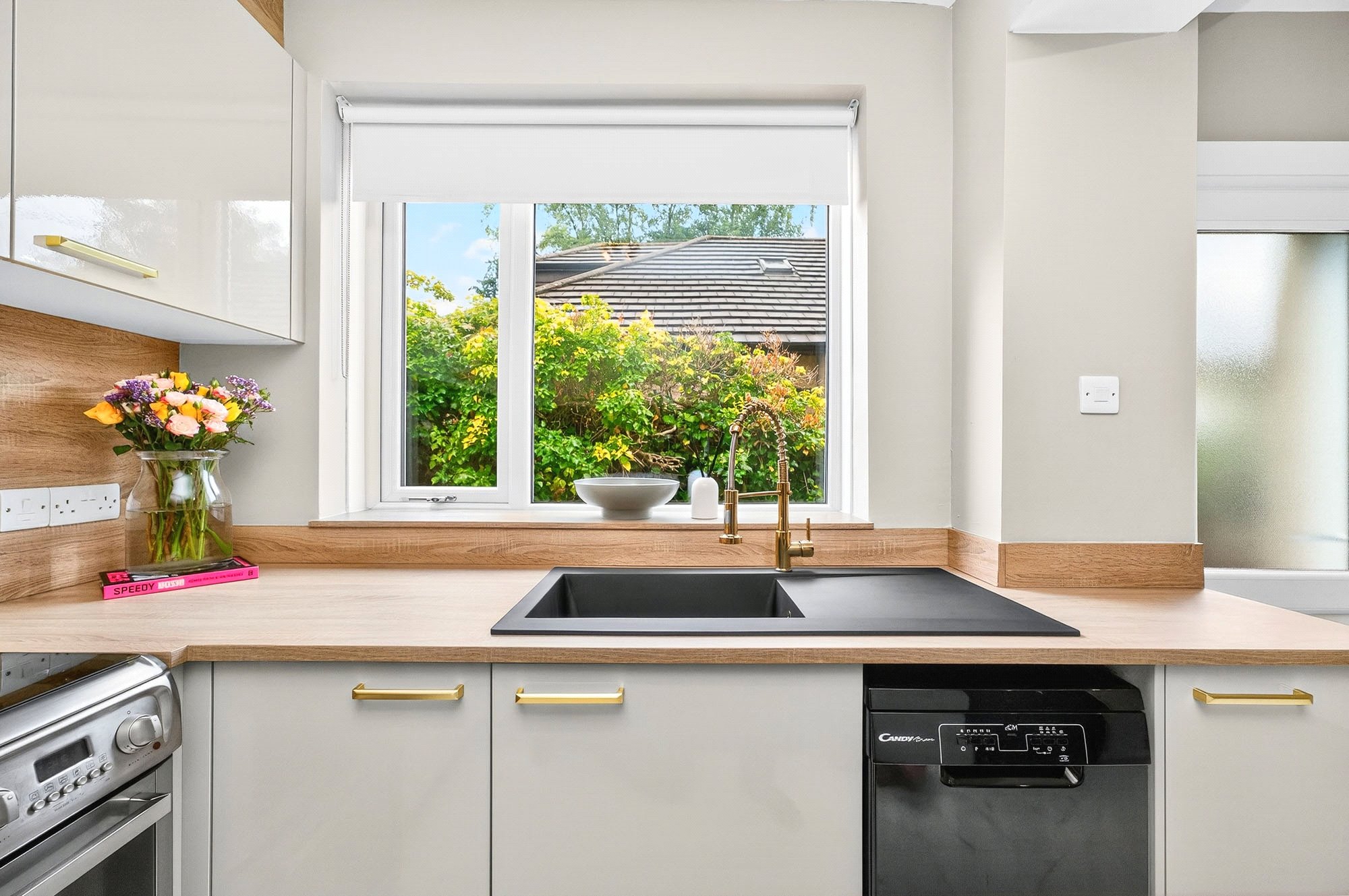 Reception hall. WC with a smart and clever space-saving “combination” WC/WHB unit. A fine open plan lounge/dining room with bay window and fireplace a modern log-burning stove. The rear extension provides a really lovely snug (sitting room) with an almost seamless connection to the rear garden, featuring an impressive (large) set of patio doors plus a feature “fixed frame”, almost floor-to-ceiling, side window. A really lovely space. The kitchen was renewed, with German units, in 2020 and feature smart flush, high-gloss, units in a pale taupe colour offset by brass coloured handles and both oak laminate worktops and wall panels - very appealing design. A new black sink unit along with black coloured dishwasher, washing machine, and fridge-freezer makes for a nice contrast. Additionally there is a cooker with gas hobs and a cooker hood.