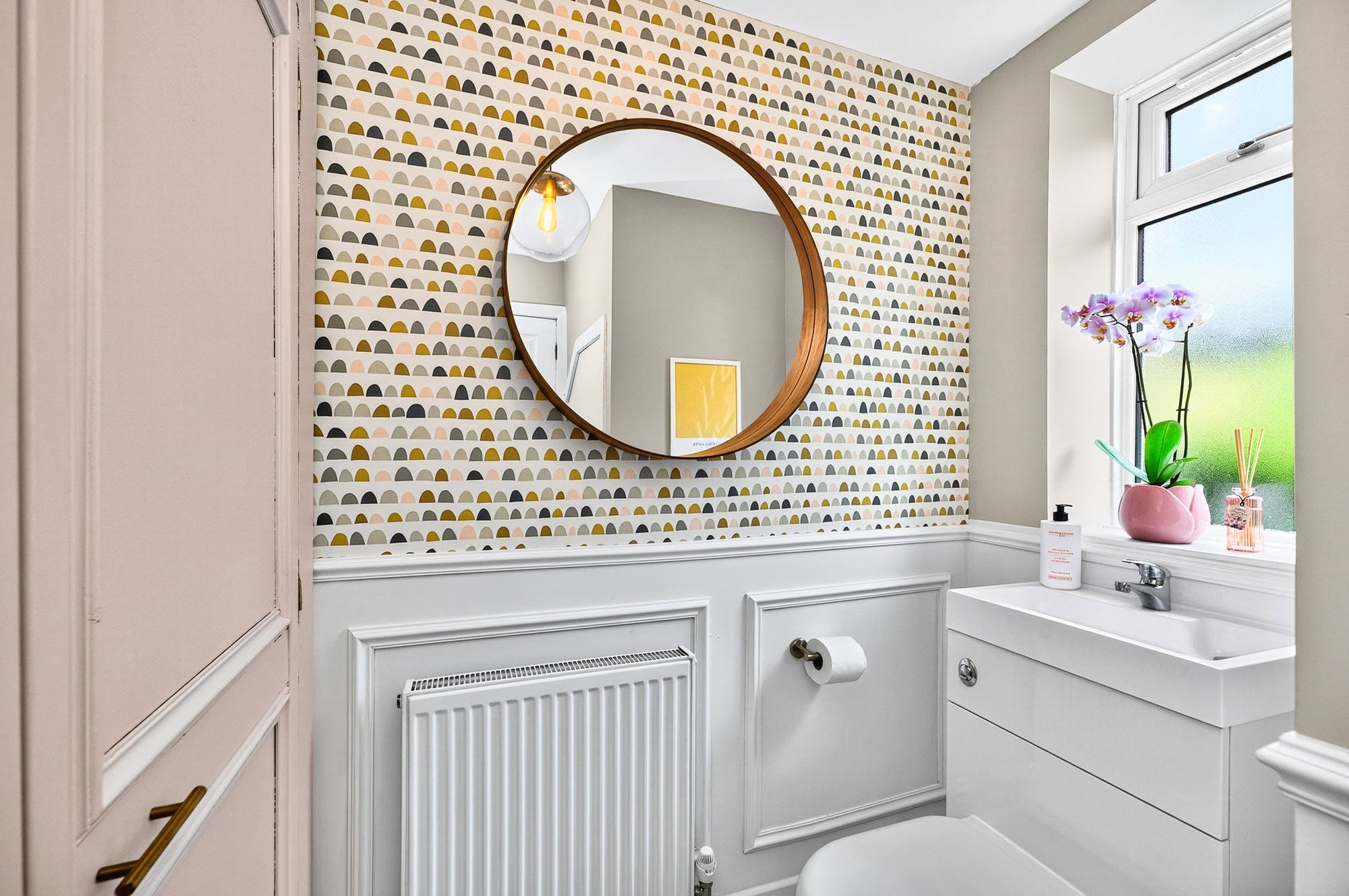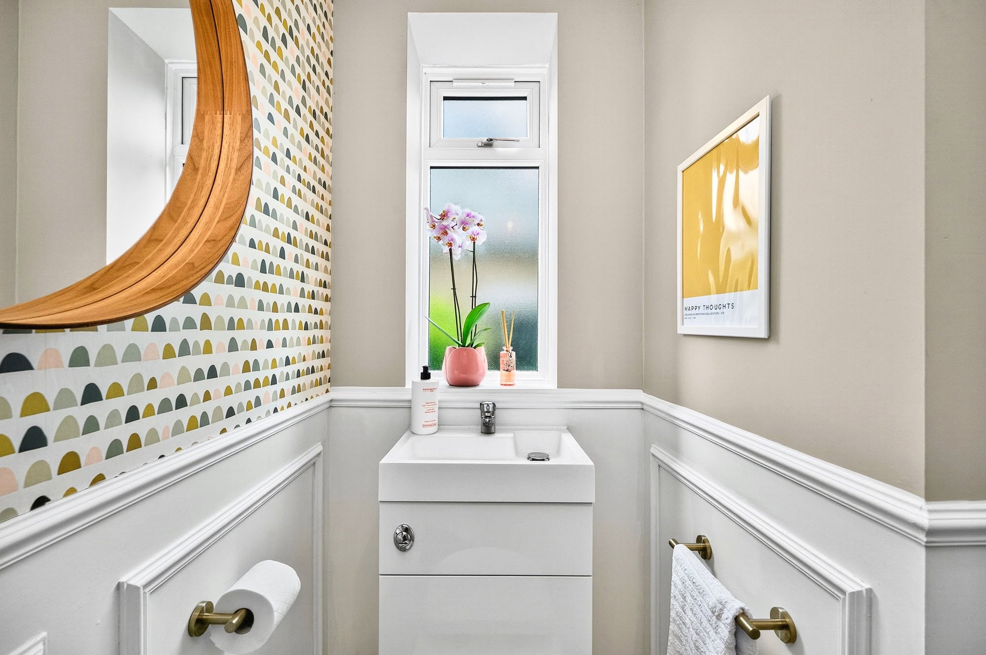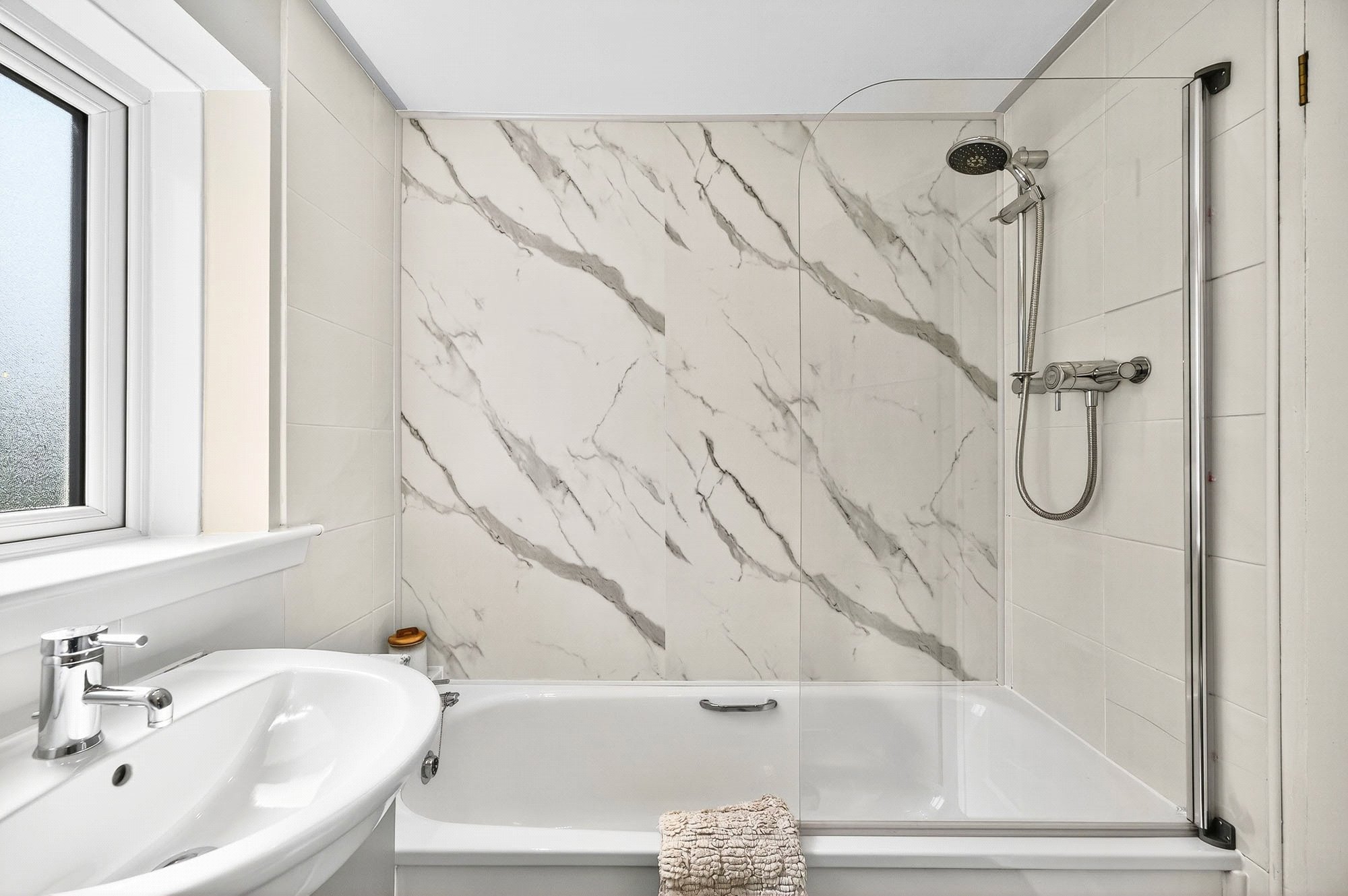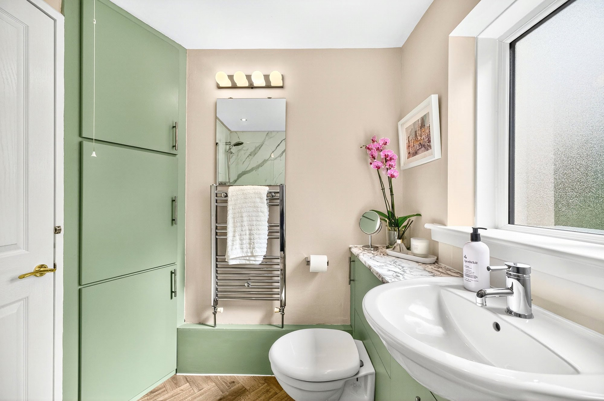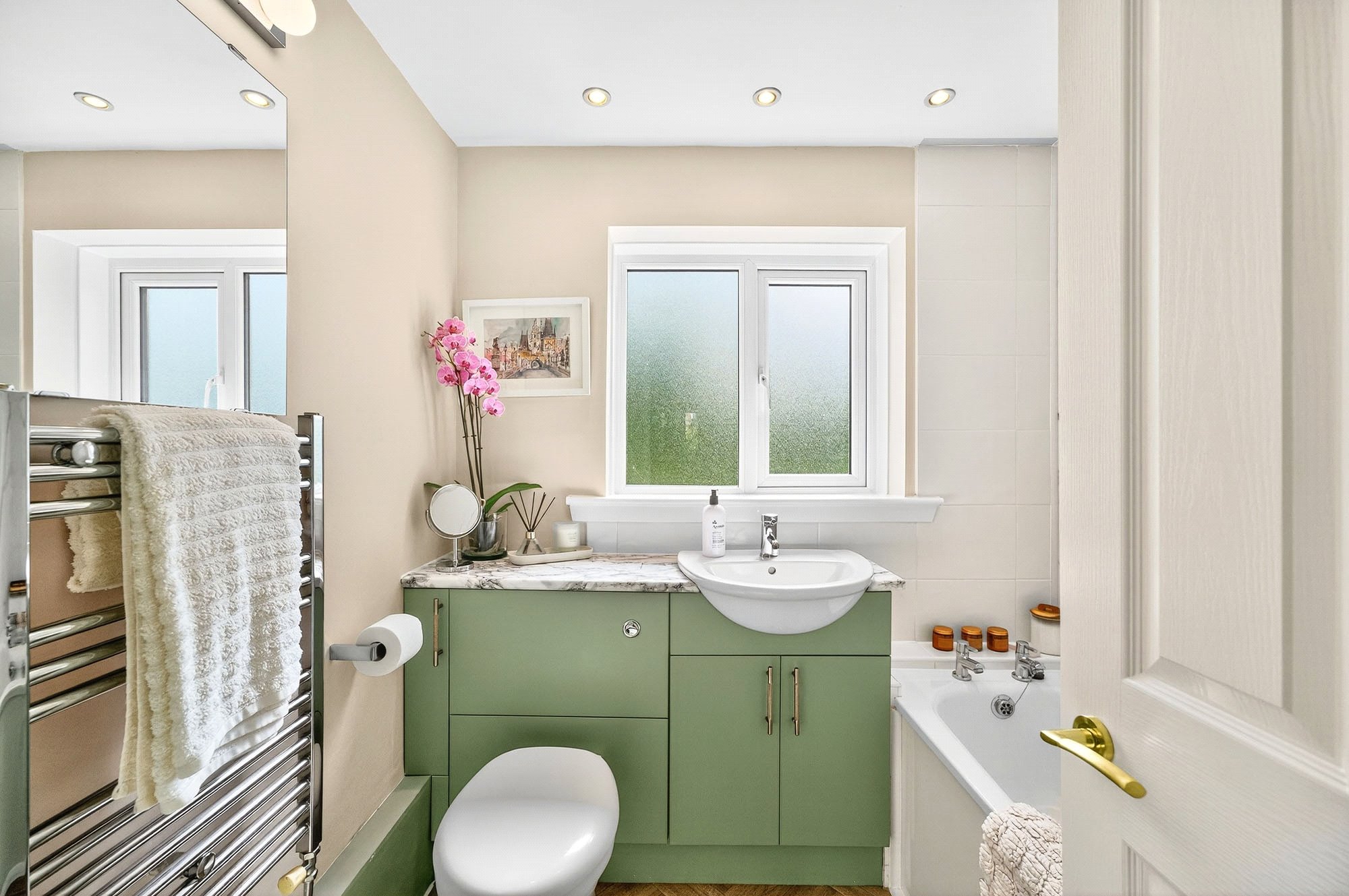 A staircase ascends to an upper hallway where a loft ladder accesses the attic. There are three beautifully decorated bedrooms here - two doubles and one single, the latter used as a home office. The smart modern bathroom has a mix of wall tiles and wet-wall panelling and, as with all of the house, most tastefully decorated. Over the bath is a powerful Mira Element thermostatic shower. Chrome towel radiator. Three-section toilet cabinet.