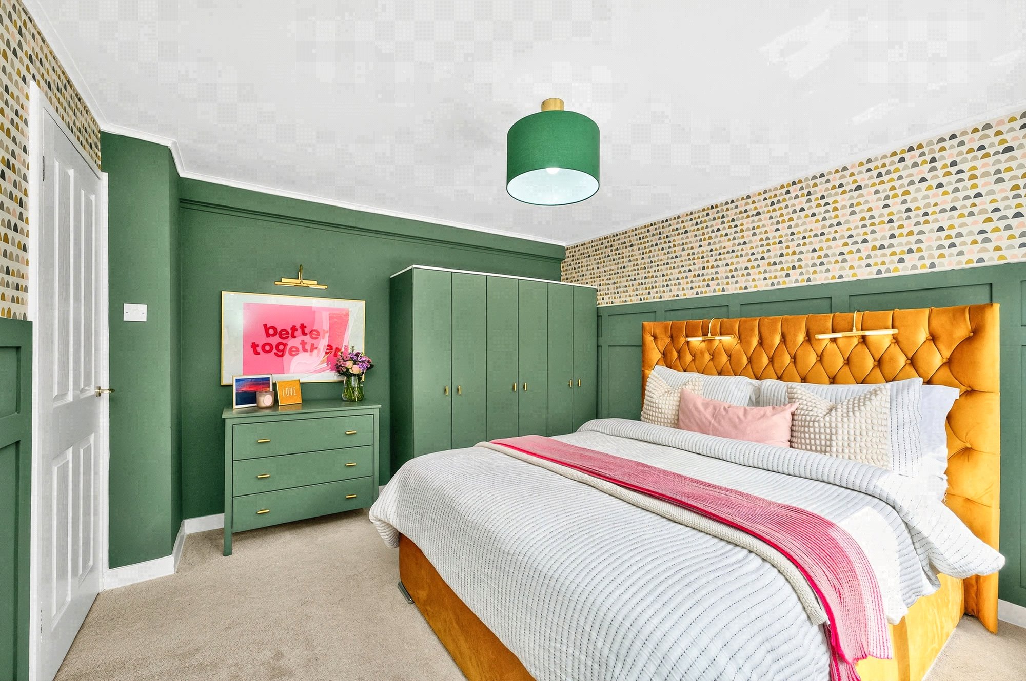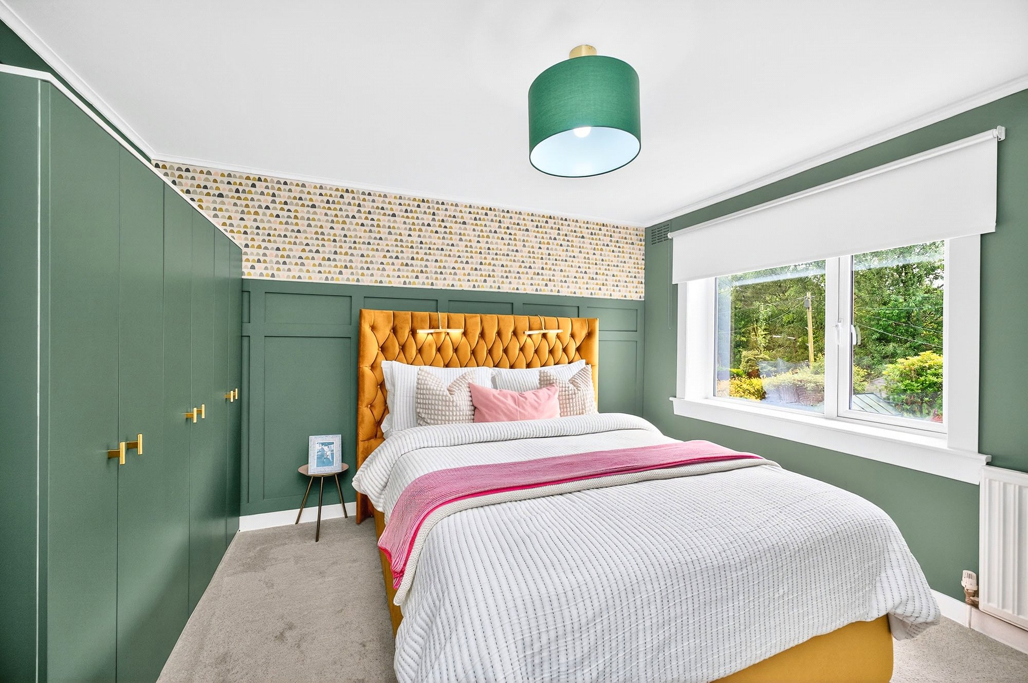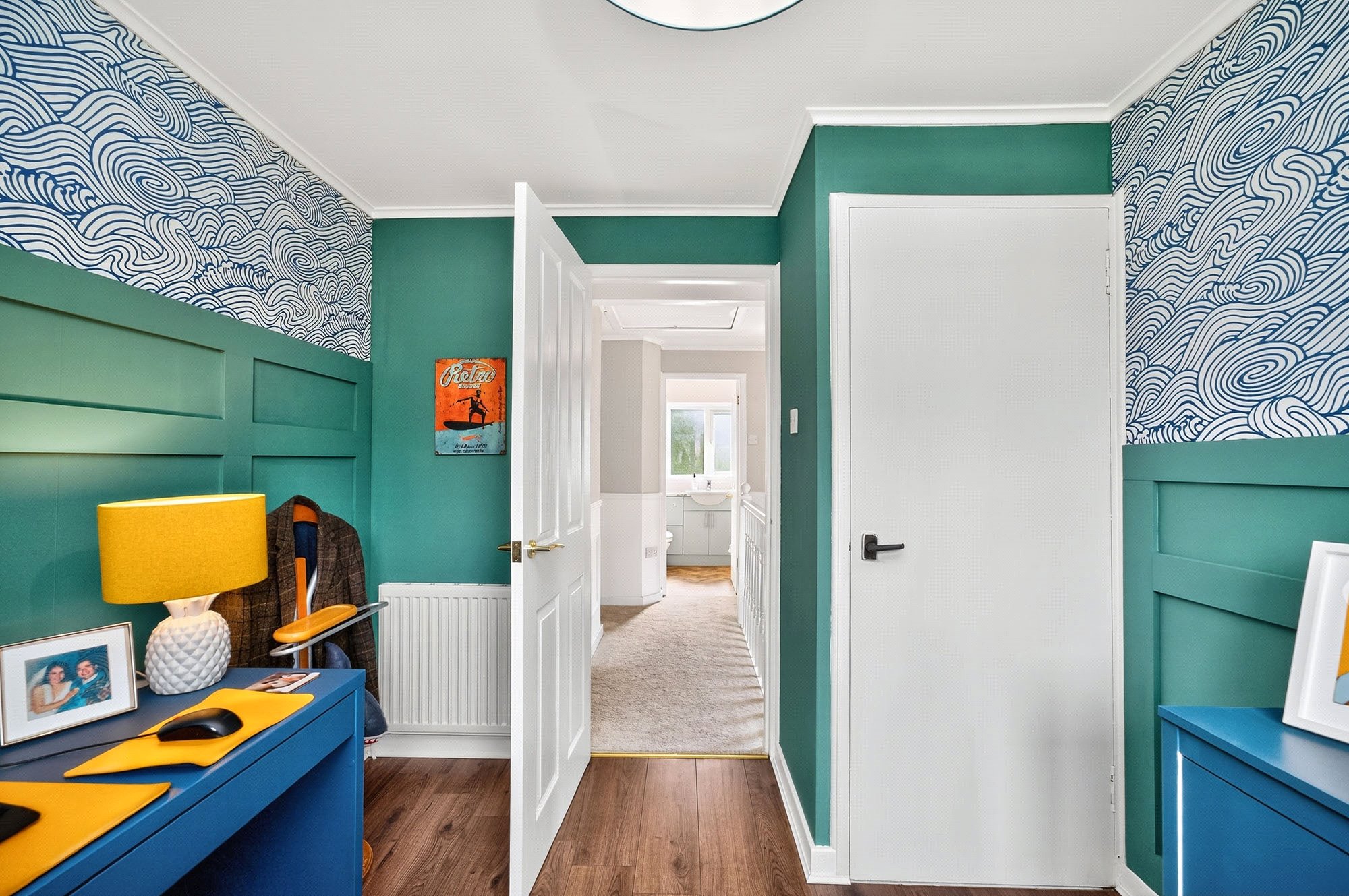 One of the principal design elements is the use of wall panelling to rooms – WC, lounge/dining room, snug, staircase,and bedrooms all of which are painted in tones to marry with the decorative theme of each area. In bedroom 2, for example, the coloured panelling matches that of the wardrobe furniture which for those interested, could be included as part of the sale.