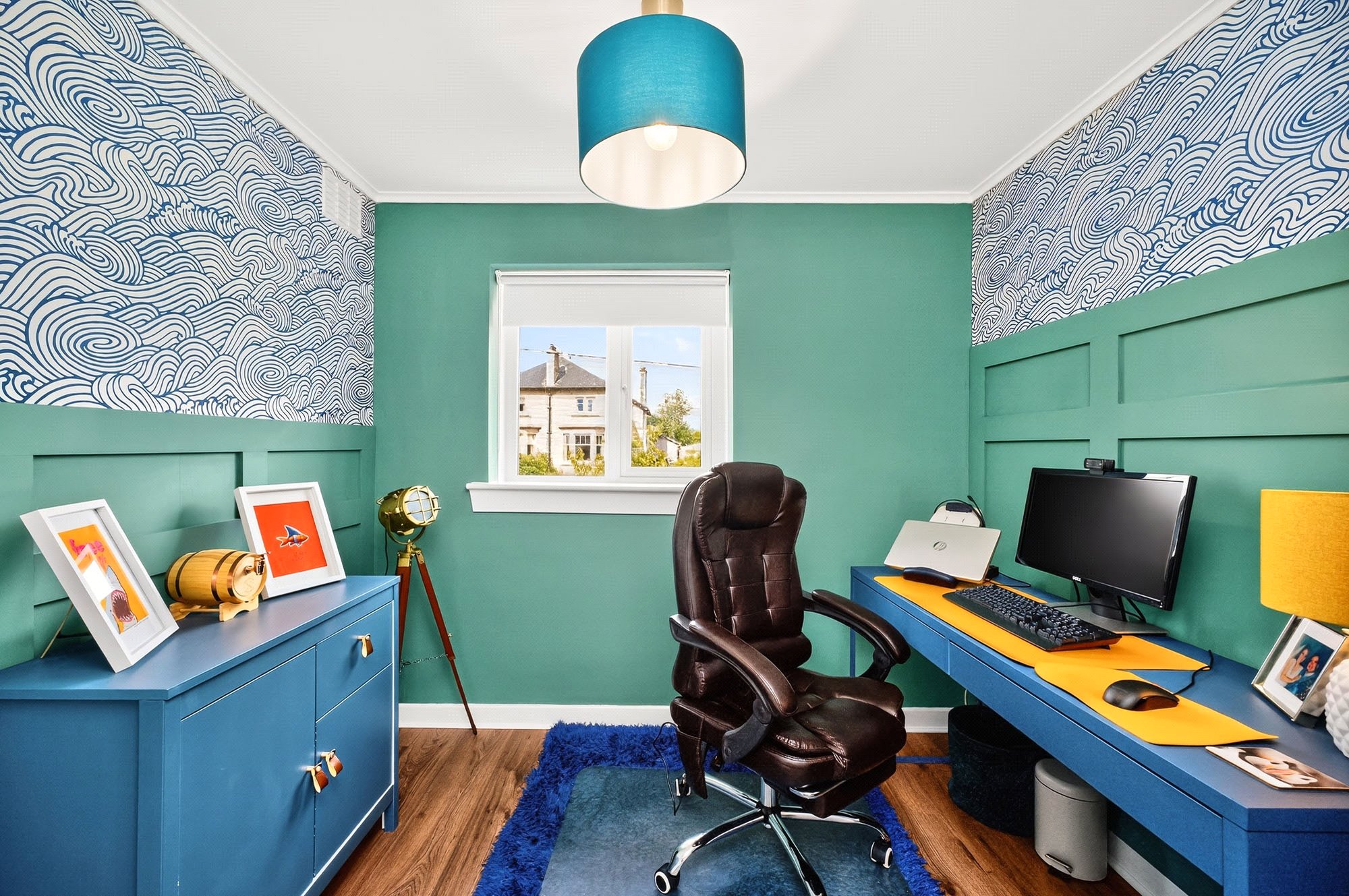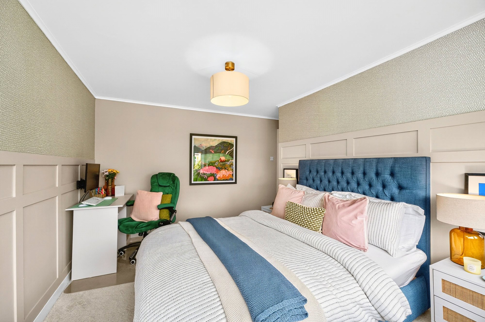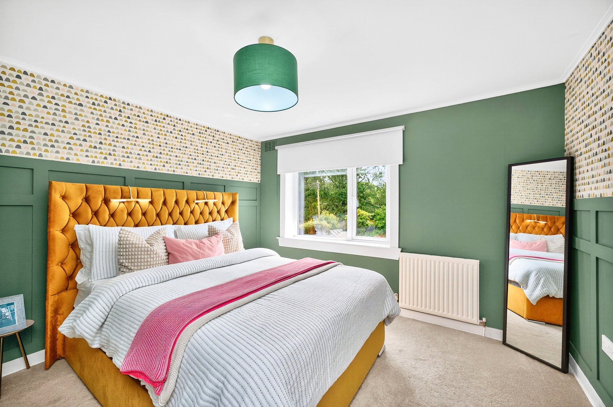 One of the principal design elements is the use of wall panelling to rooms – WC, lounge/dining room, snug, staircase,and bedrooms all of which are painted in tones to marry with the decorative theme of each area. In bedroom 2, for example, the coloured panelling matches that of the wardrobe furniture which for those interested, could be included as part of the sale.