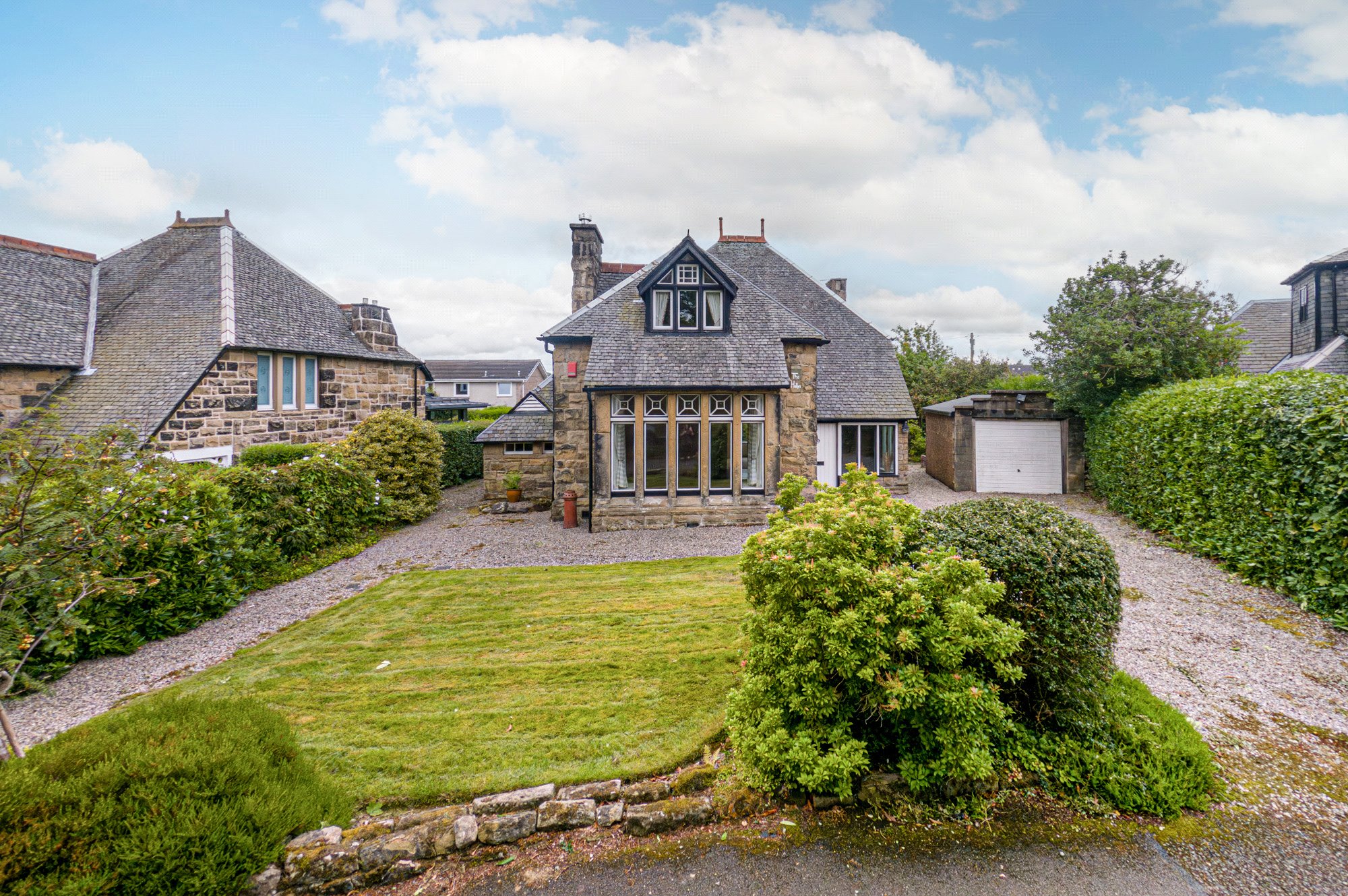 The subjects comprise a very pretty entrance portico that leads to an entrance vestibule, off which is a useful storage area with window. The reception hall has a ground floor guest toilet with w.c. and w.h.b. There are then three main public rooms comprising, principally, a seven framed box bay windowed lounge with traditional fireplace at its focal point. Separately, there is a sitting room, a dining kitchen and off the kitchen a large utility with access on to the rear garden. The kitchen has a range of cupboard units with laminate worktops and free standing appliances.
