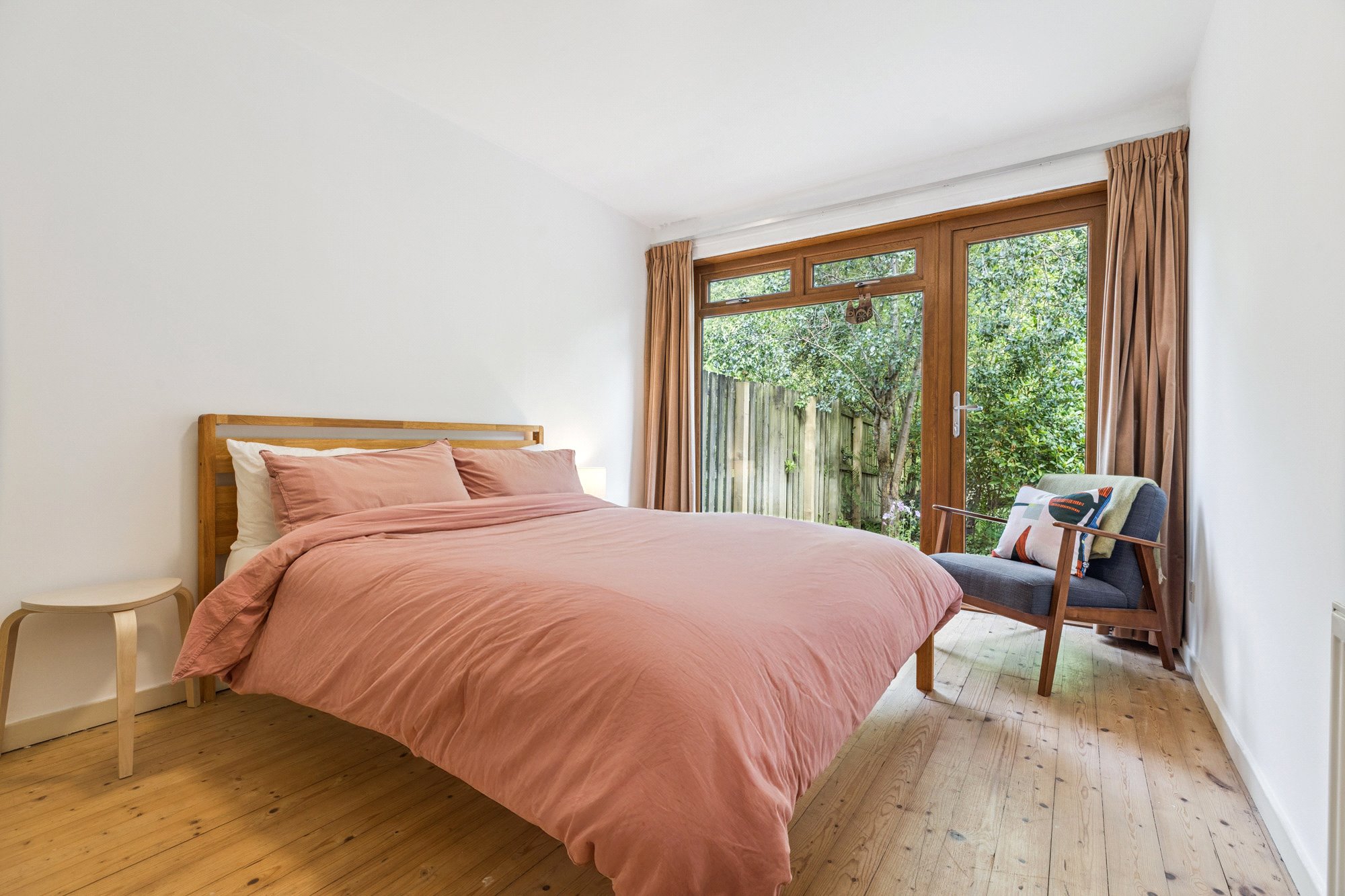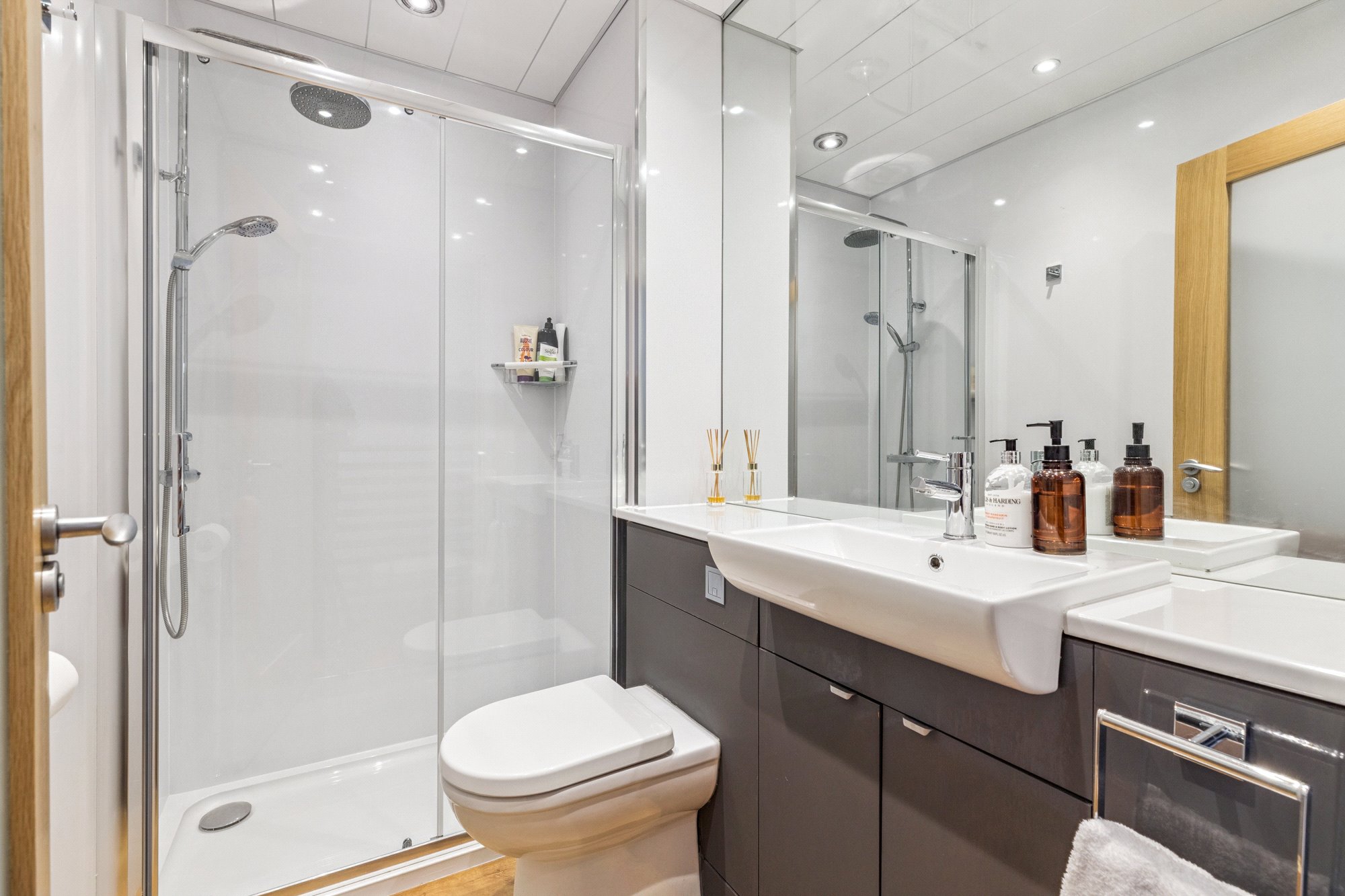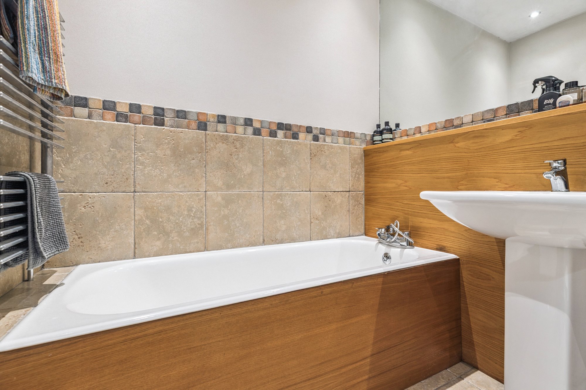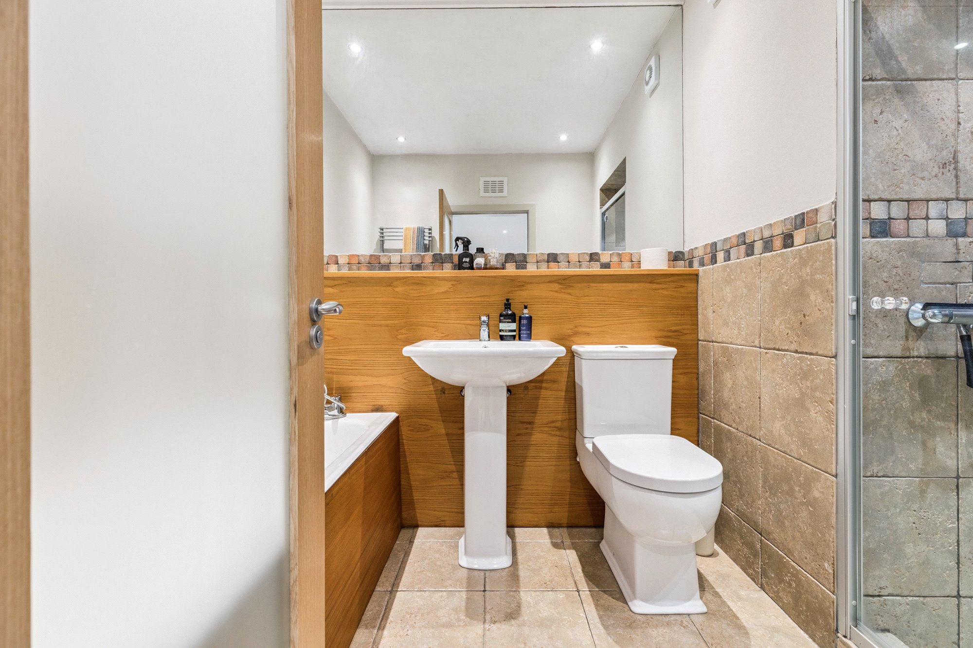 The bedrooms are on the lower ground floor level, the ‘sleeping deck’, where direct access is provided to the garden from each of the three double bedrooms, all having French doors. On this ‘garden level’ is a good-sized hall. The smart four-piece bathroom includes a shower enclosure and is all very smartly done in a contemporary style; it has a four-piece suite that includes an oversized ‘wet room’ style shower enclosure with floor drain. It features another powerful thermostatic shower. It is tiled to full height in the enclosure and half height on walls to match the flooring with a further large wall vanity mirror fitted. Chrome towel radiator. Finally, a very useful storeroom with laundry area.