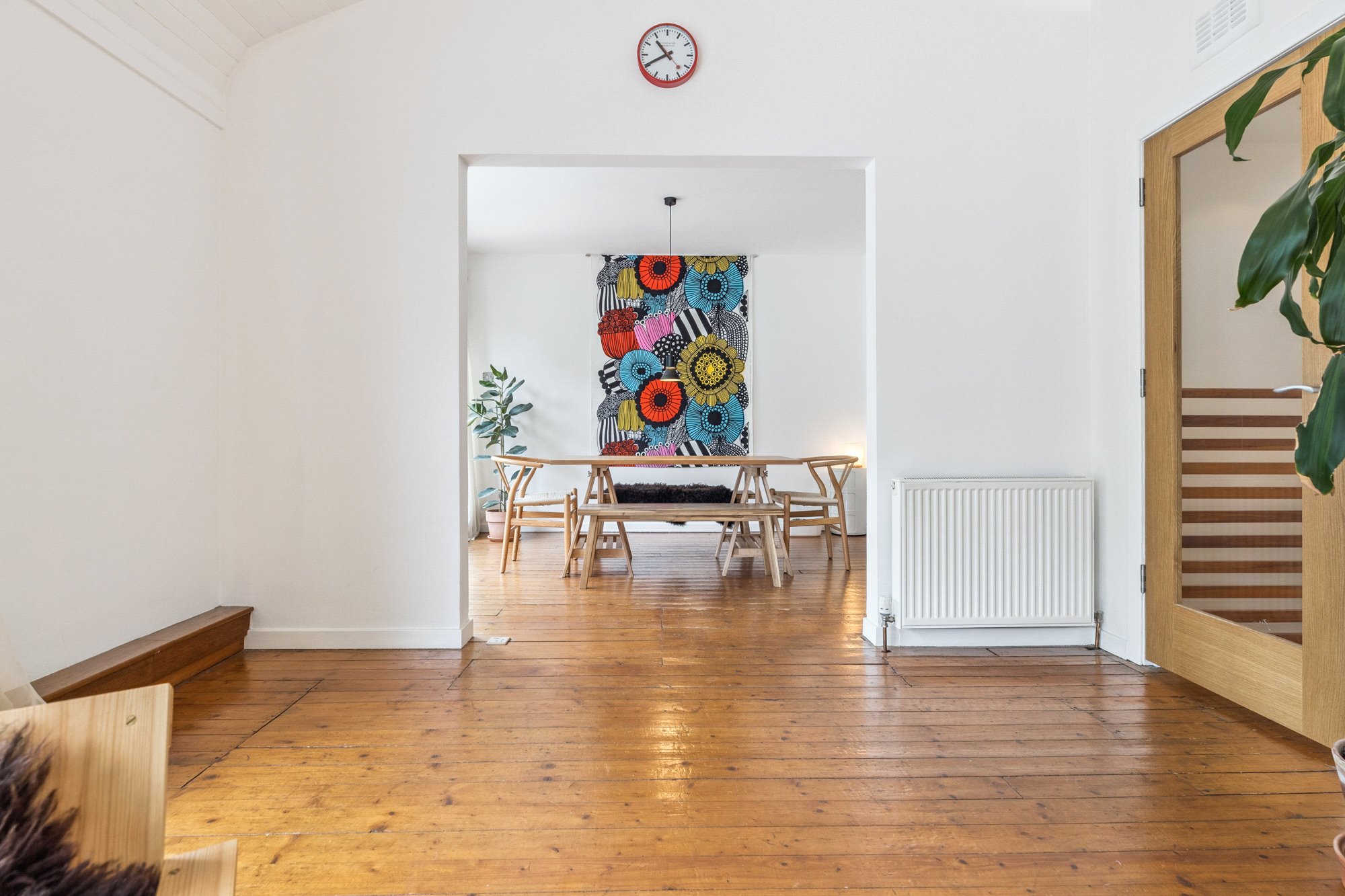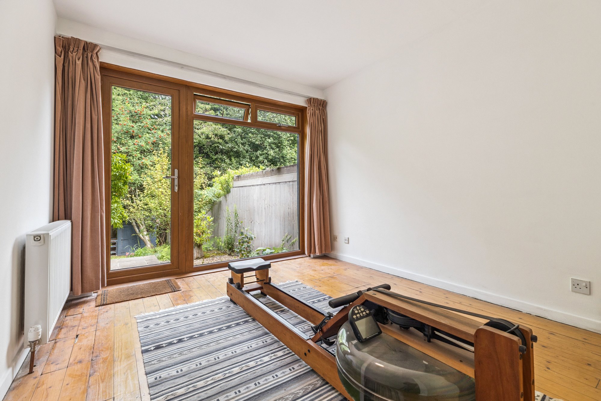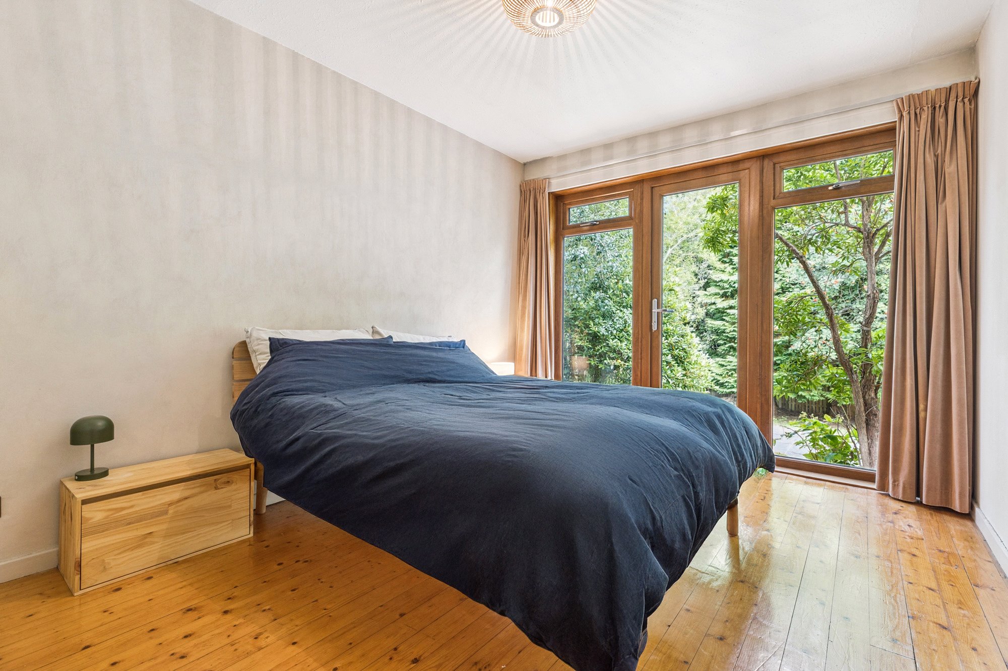 The bedrooms are on the lower ground floor level, the ‘sleeping deck’, where direct access is provided to the garden from each of the three double bedrooms, all having French doors. On this ‘garden level’ is a good-sized hall. The smart four-piece bathroom includes a shower enclosure and is all very smartly done in a contemporary style; it has a four-piece suite that includes an oversized ‘wet room’ style shower enclosure with floor drain. It features another powerful thermostatic shower. It is tiled to full height in the enclosure and half height on walls to match the flooring with a further large wall vanity mirror fitted. Chrome towel radiator. Finally, a very useful storeroom with laundry area.