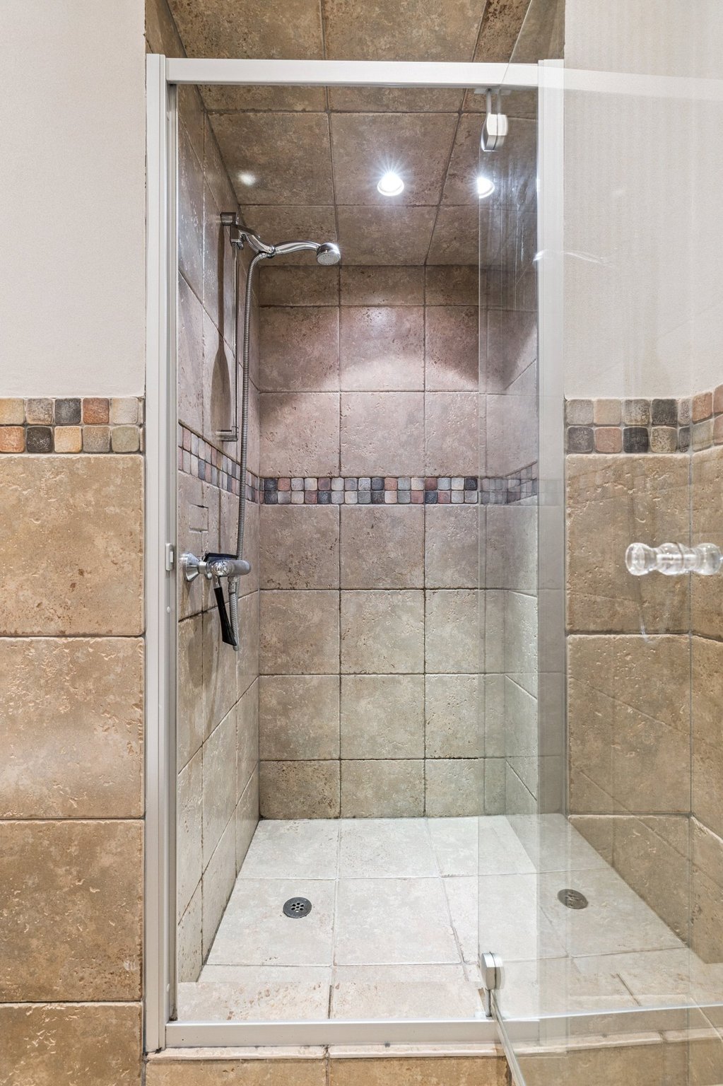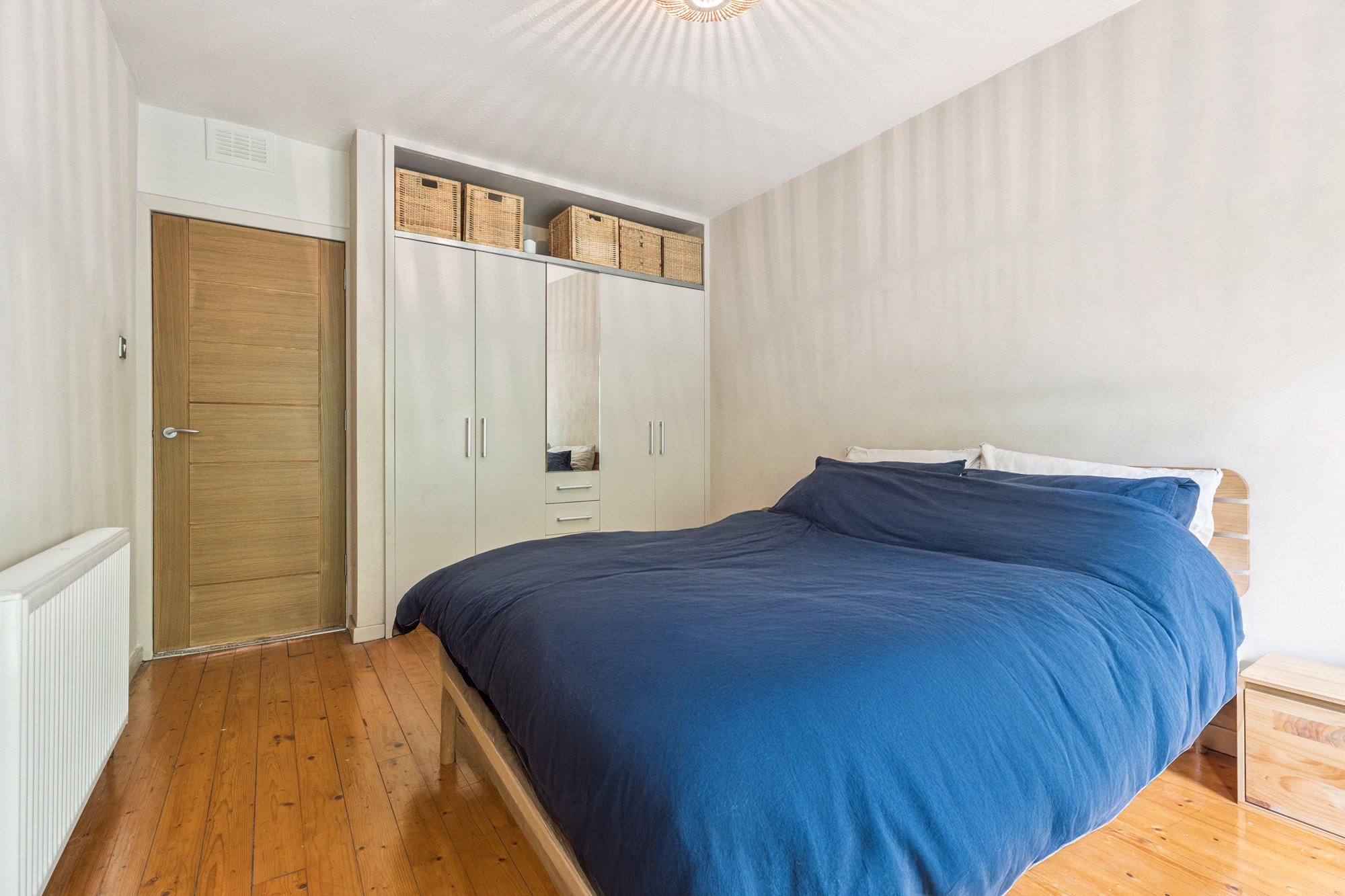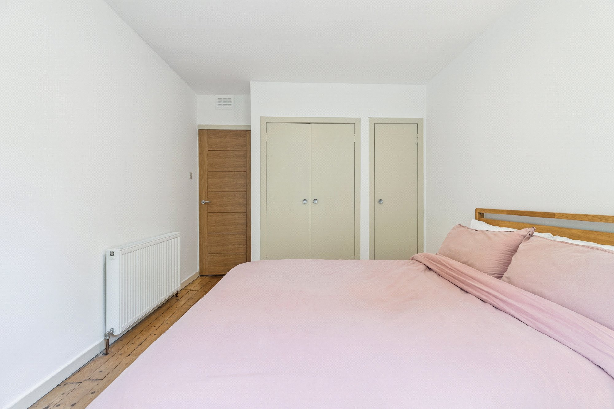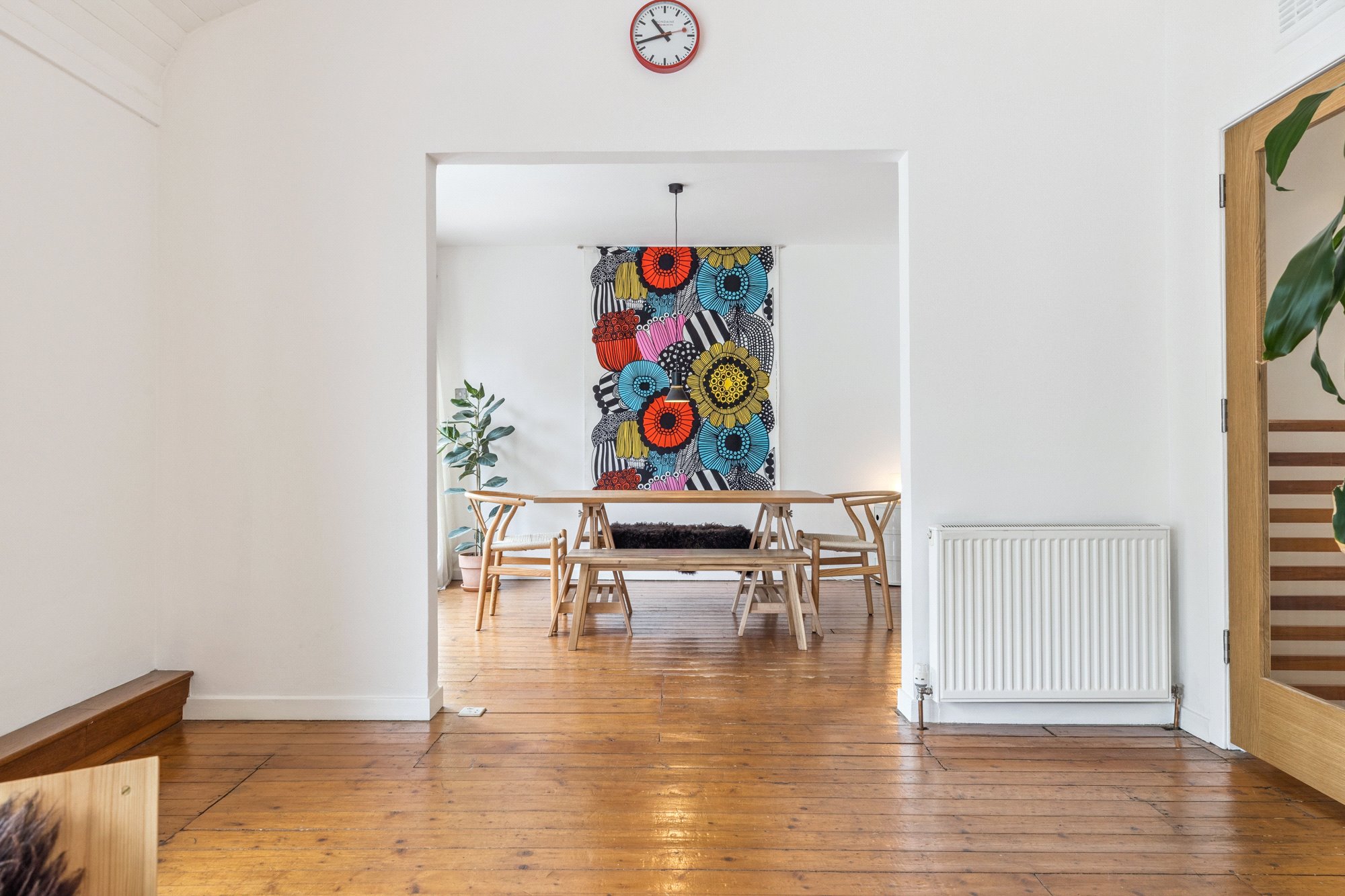 The bedrooms are on the lower ground floor level, the ‘sleeping deck’, where direct access is provided to the garden from each of the three double bedrooms, all having French doors. On this ‘garden level’ is a good-sized hall. The smart four-piece bathroom includes a shower enclosure and is all very smartly done in a contemporary style; it has a four-piece suite that includes an oversized ‘wet room’ style shower enclosure with floor drain. It features another powerful thermostatic shower. It is tiled to full height in the enclosure and half height on walls to match the flooring with a further large wall vanity mirror fitted. Chrome towel radiator. Finally, a very useful storeroom with laundry area.