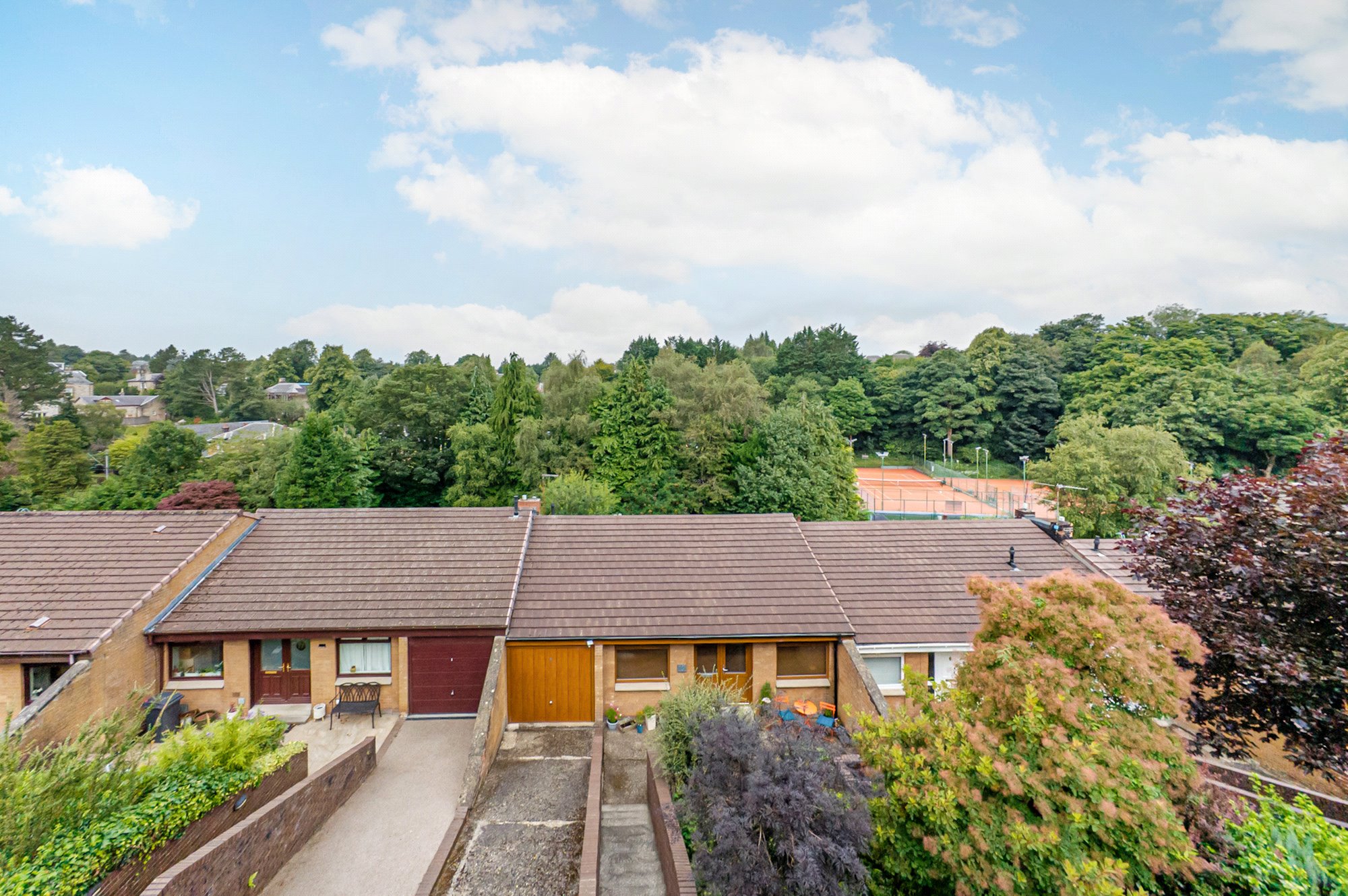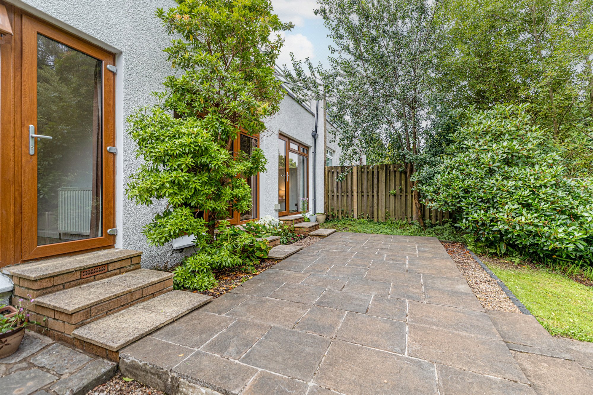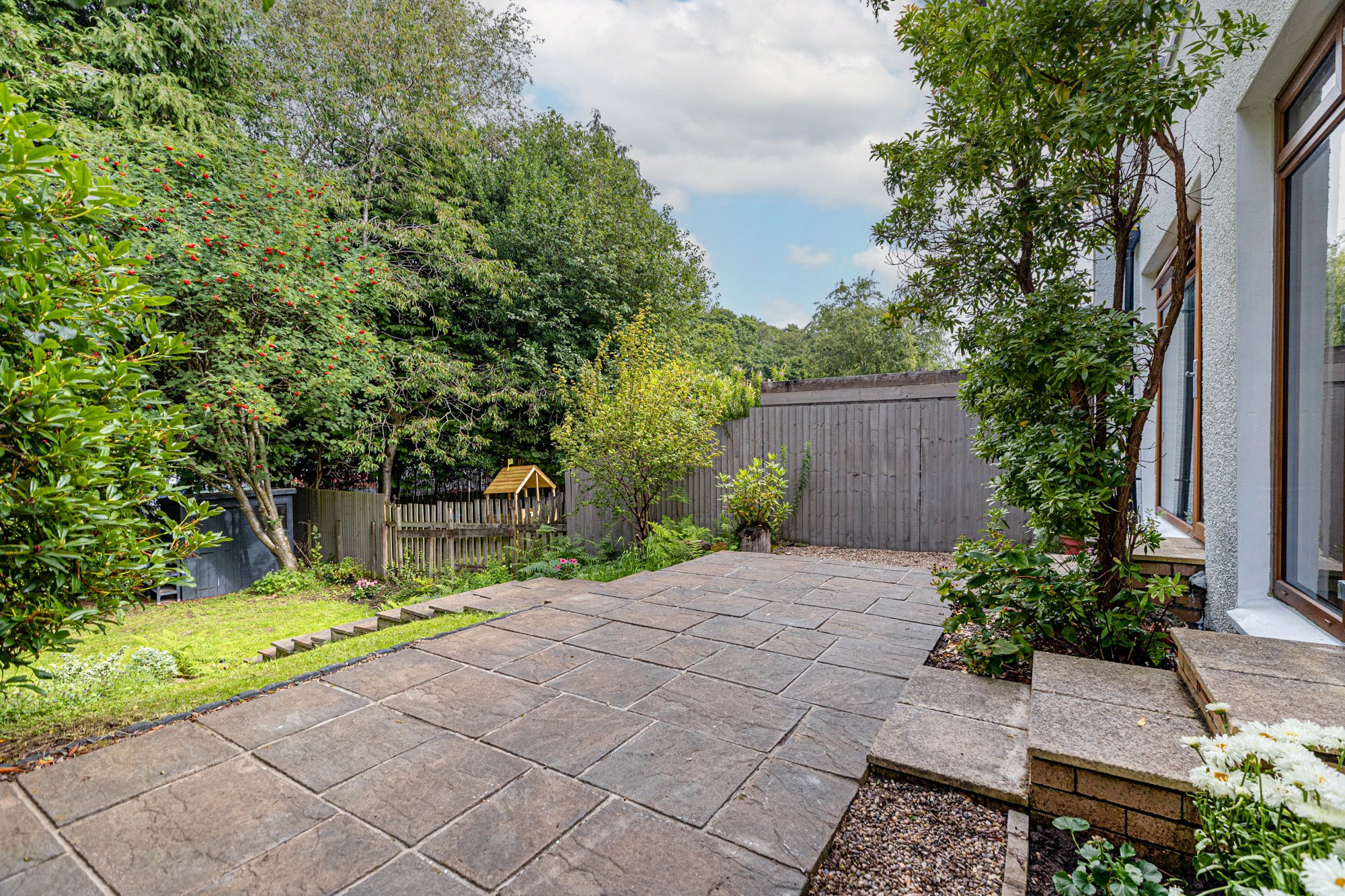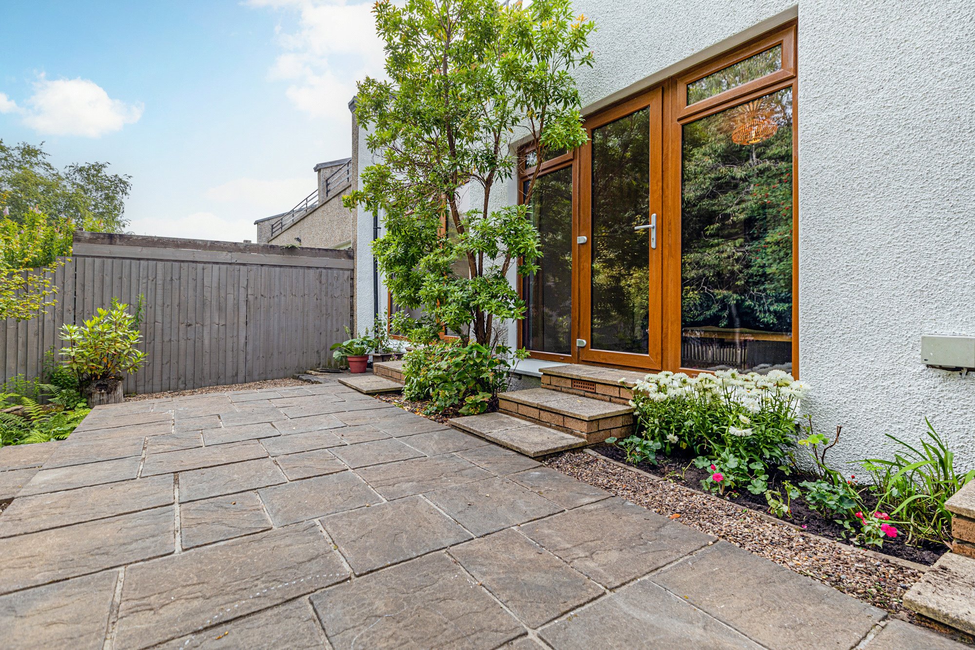The rear garden is very private and has a lovely stone slabbed terrace across the rear of the house, accessed directly from each of the three bedrooms. Stone flagged steps lead down to a lower grassed garden bounded by fencing and screened by trees to make it very private. Shed. Not far away are the courts of Bearsden Tennis Club the sound of ball on racquet a peaceful backdrop and appropriate during the recent Wimbledon championship.