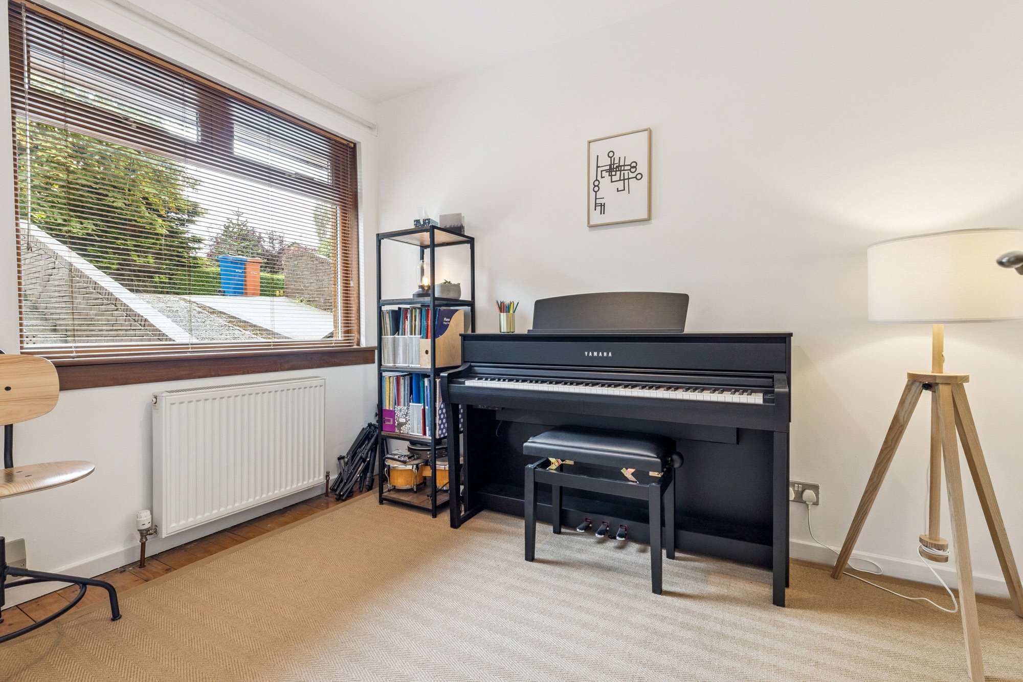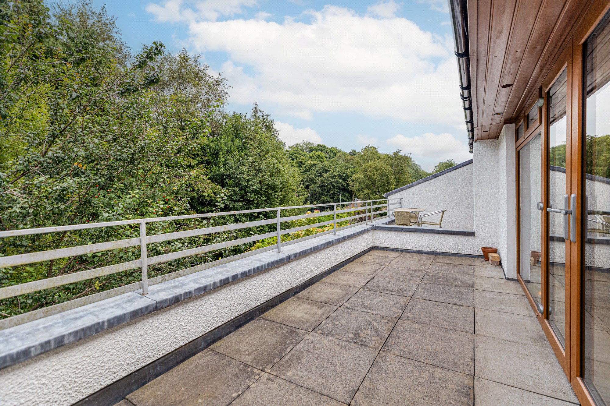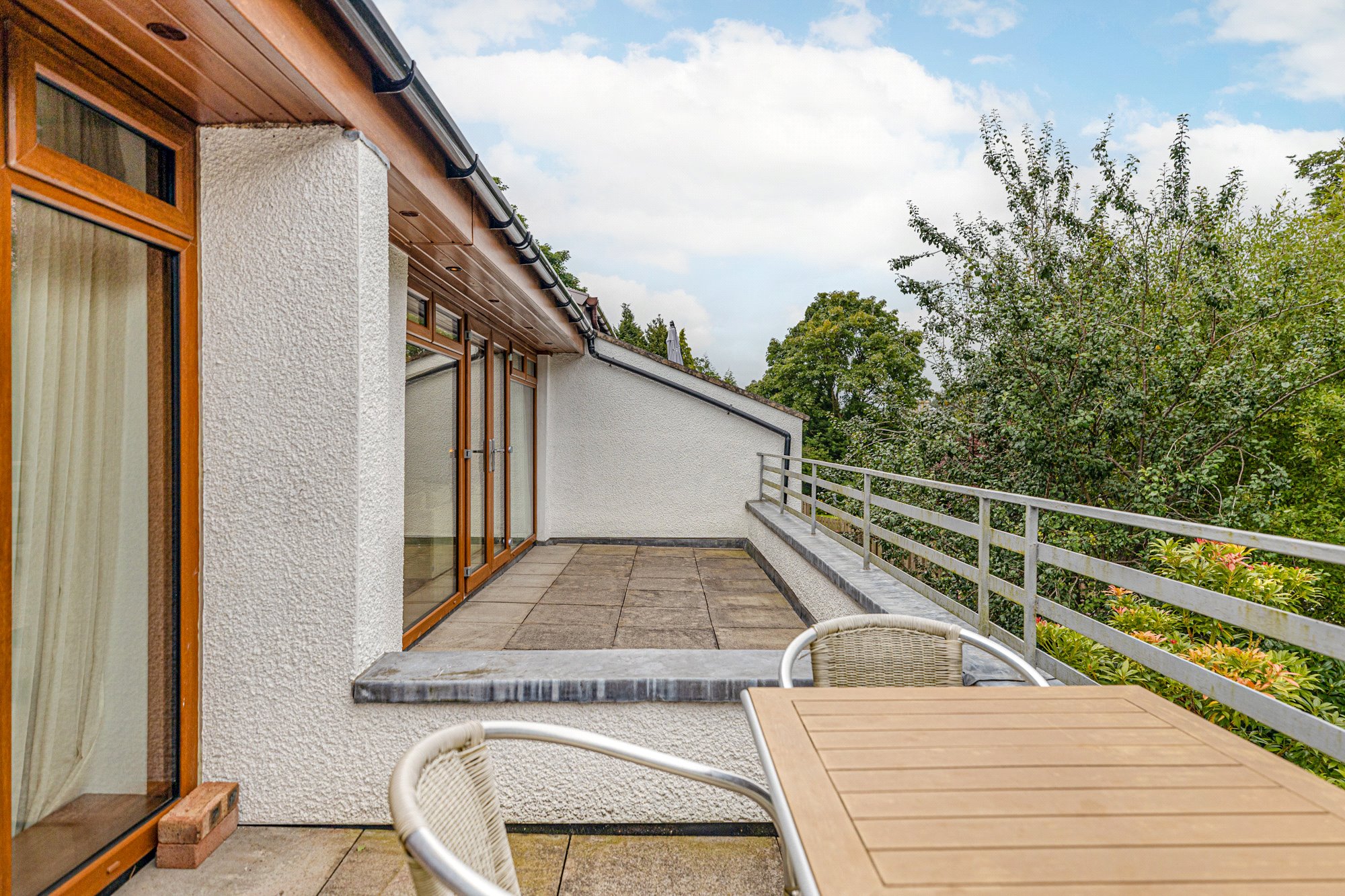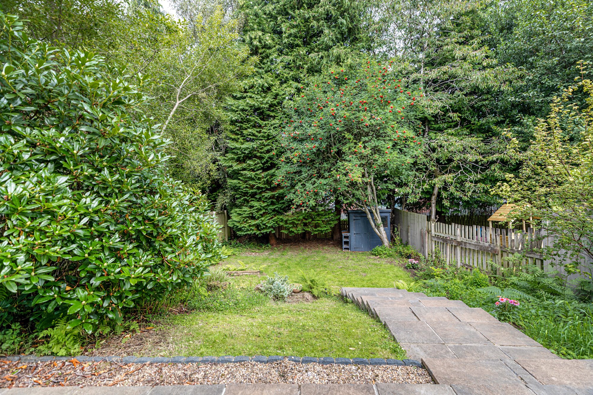 The rear garden is very private and has a lovely stone slabbed terrace across the rear of the house, accessed directly from each of the three bedrooms. Stone flagged steps lead down to a lower grassed garden bounded by fencing and screened by trees to make it very private. Shed. Not far away are the courts of Bearsden Tennis Club the sound of ball on racquet a peaceful backdrop and appropriate during the recent Wimbledon championship.