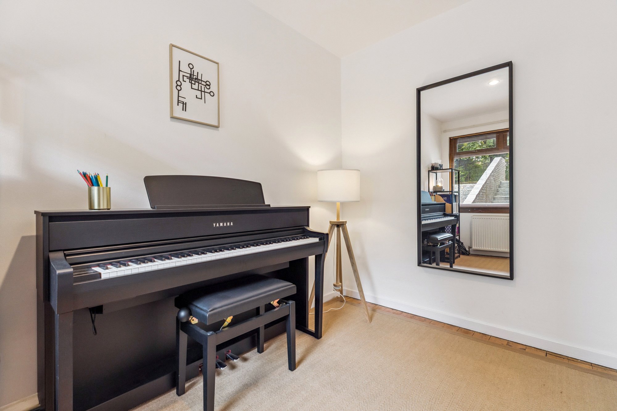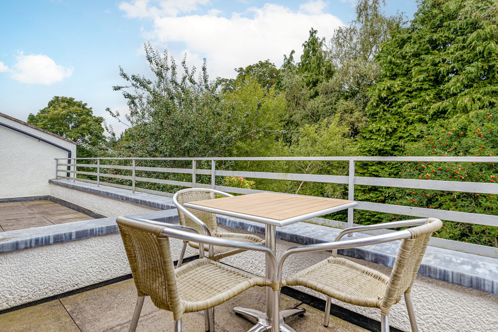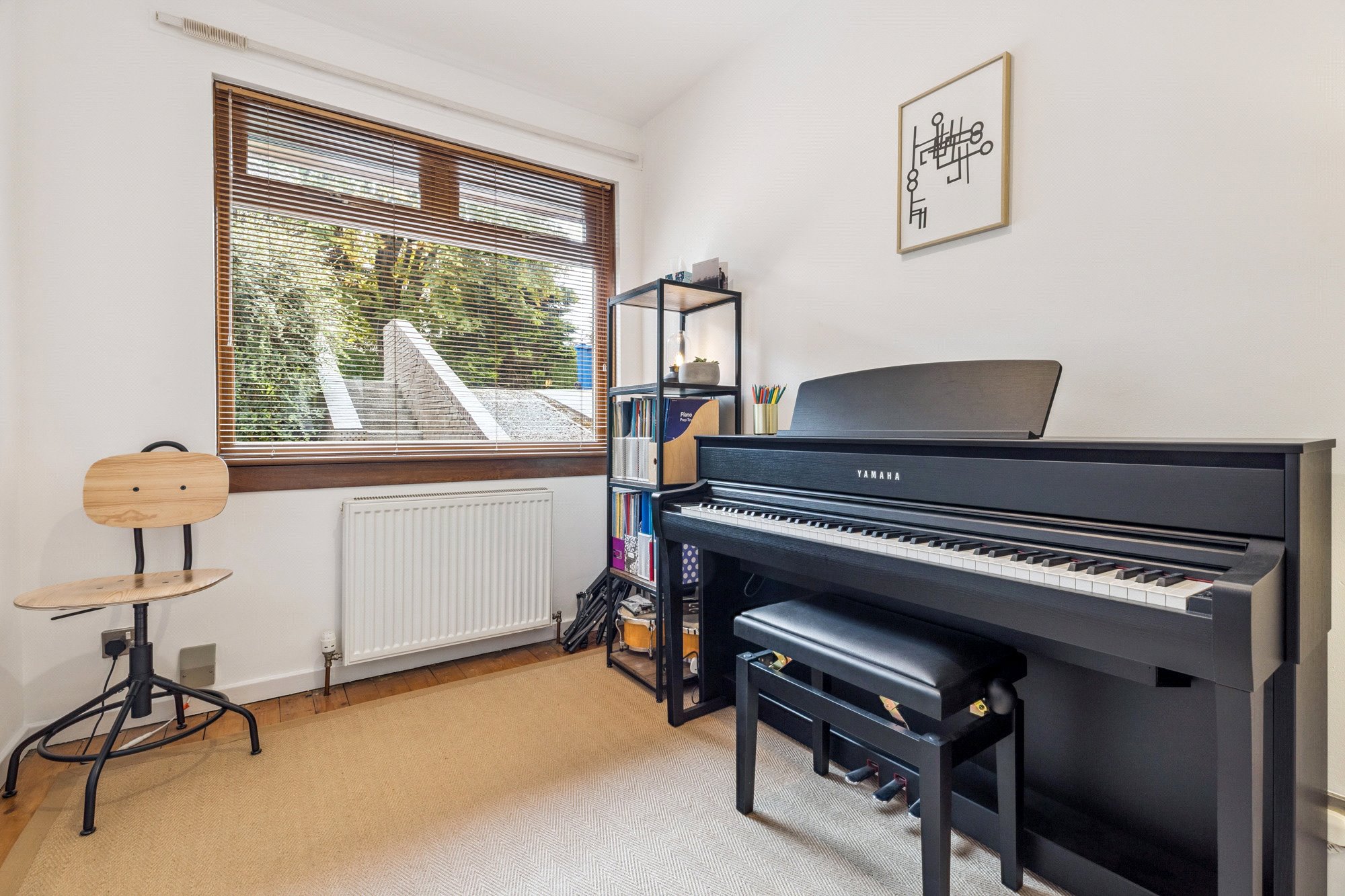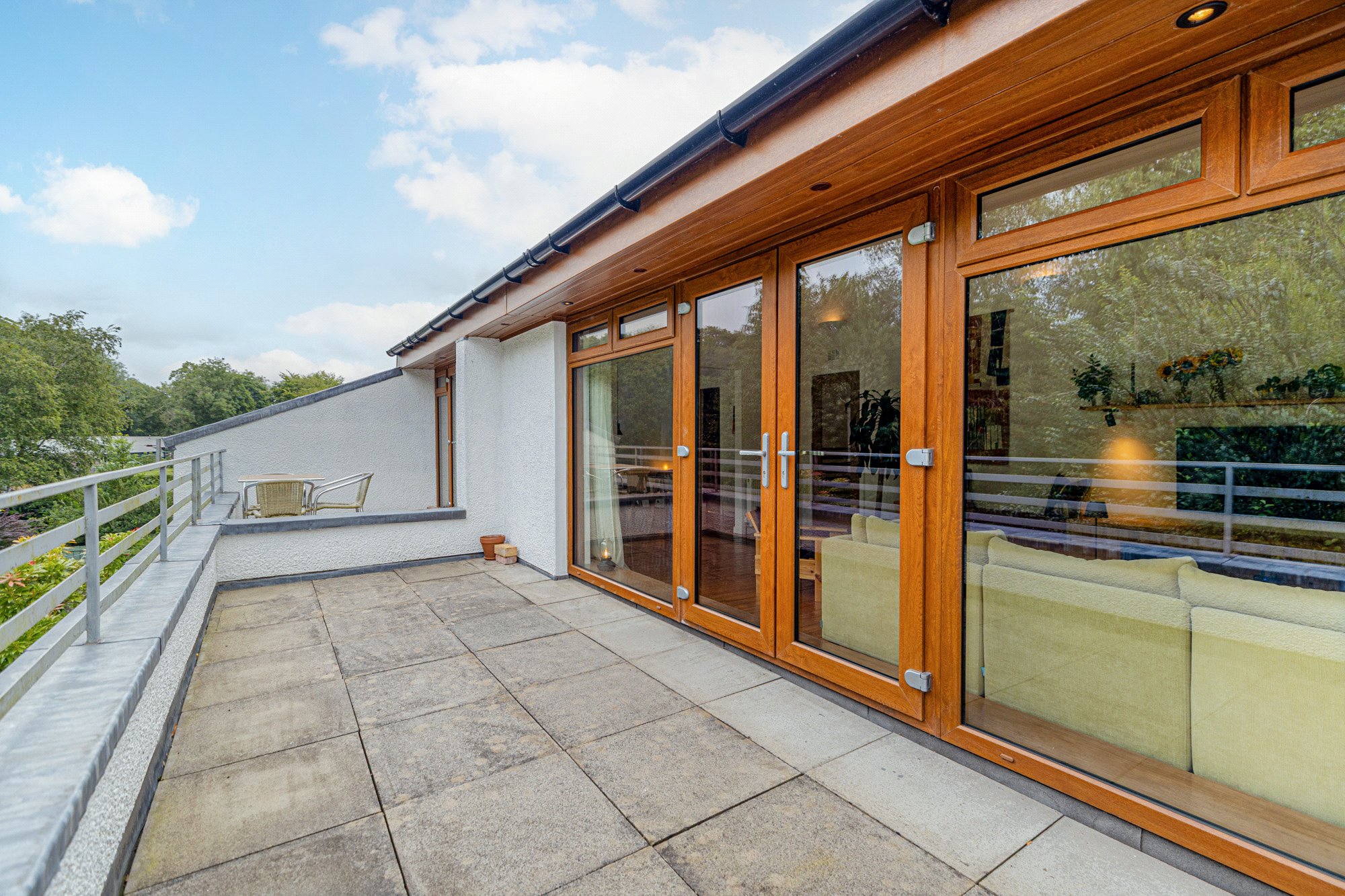 The rear garden is very private and has a lovely stone slabbed terrace across the rear of the house, accessed directly from each of the three bedrooms. Stone flagged steps lead down to a lower grassed garden bounded by fencing and screened by trees to make it very private. Shed. Not far away are the courts of Bearsden Tennis Club the sound of ball on racquet a peaceful backdrop and appropriate during the recent Wimbledon championship.