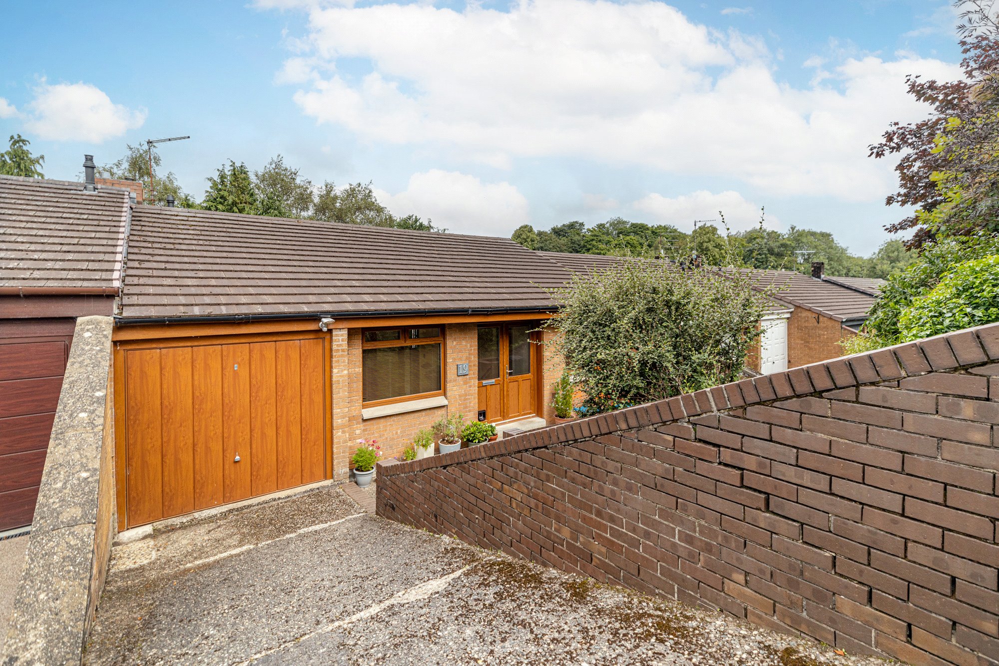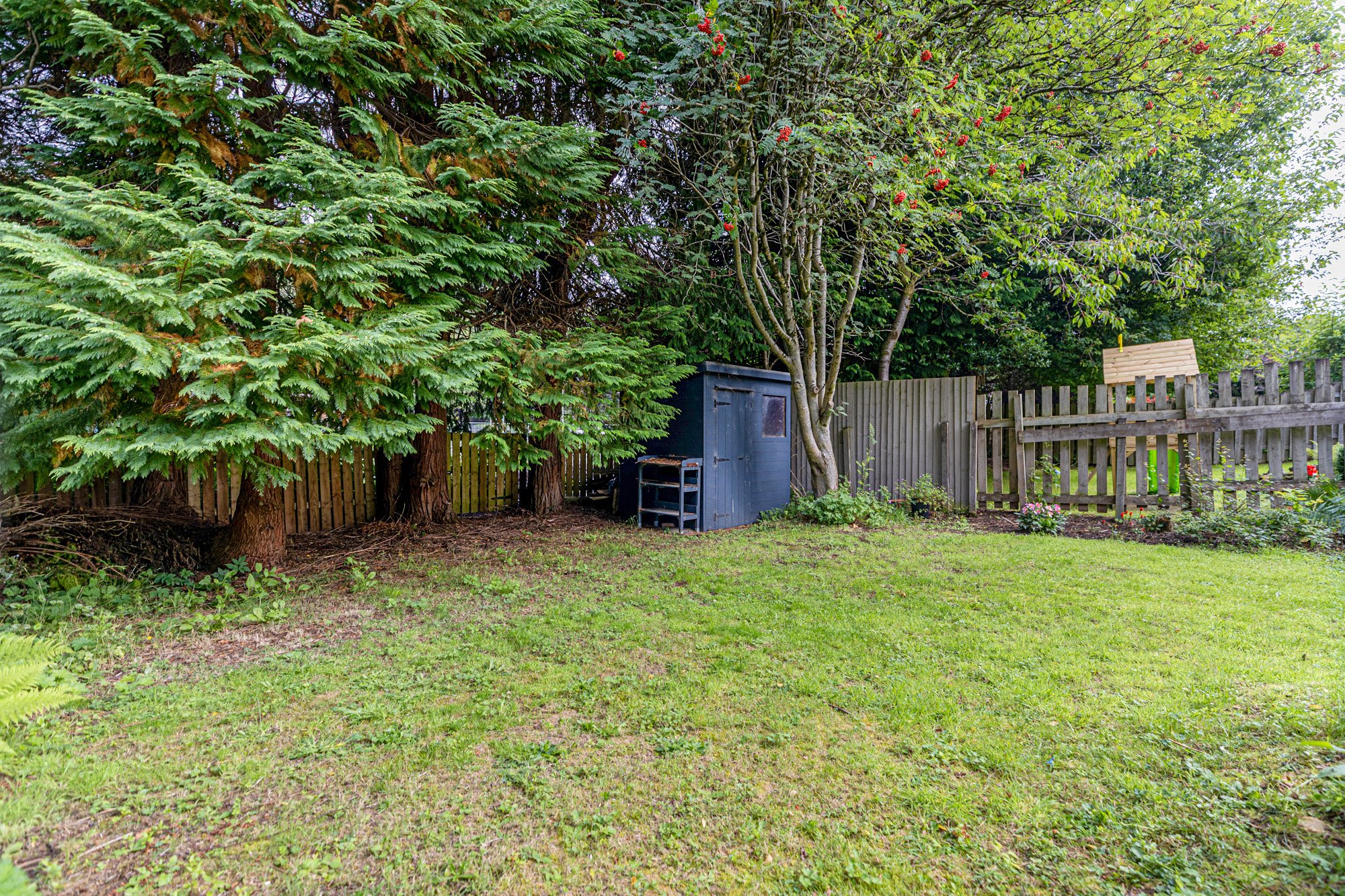 The front garden is on a slope with the front of the house well screened by a densely planted bed, behind which is a sheltered patio, perfect for morning and early afternoon sun. To the side is a drive to the garage.