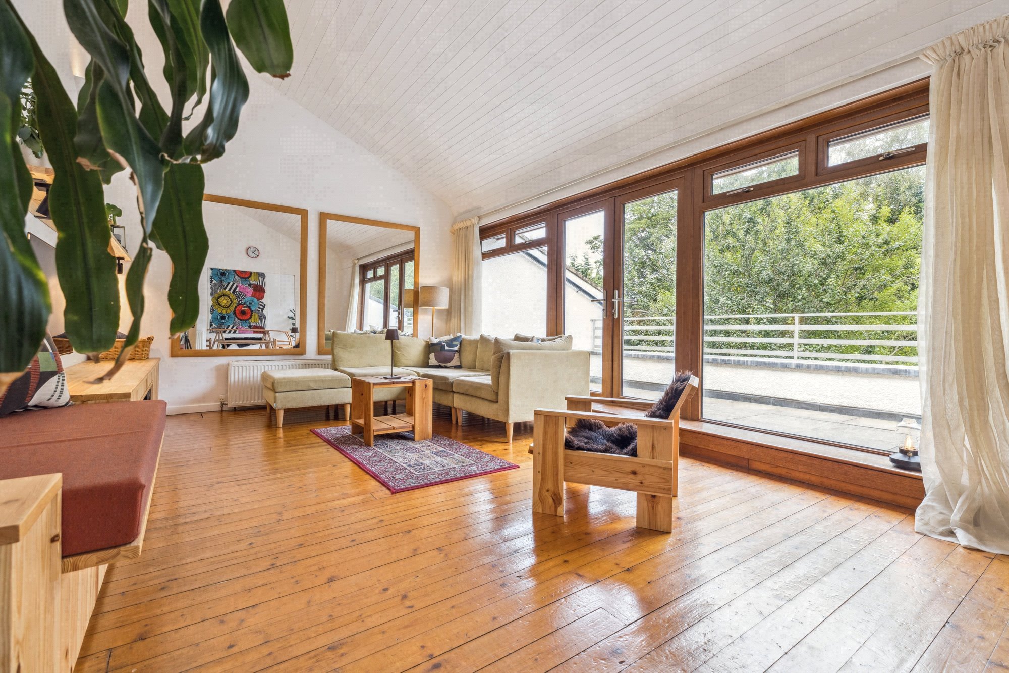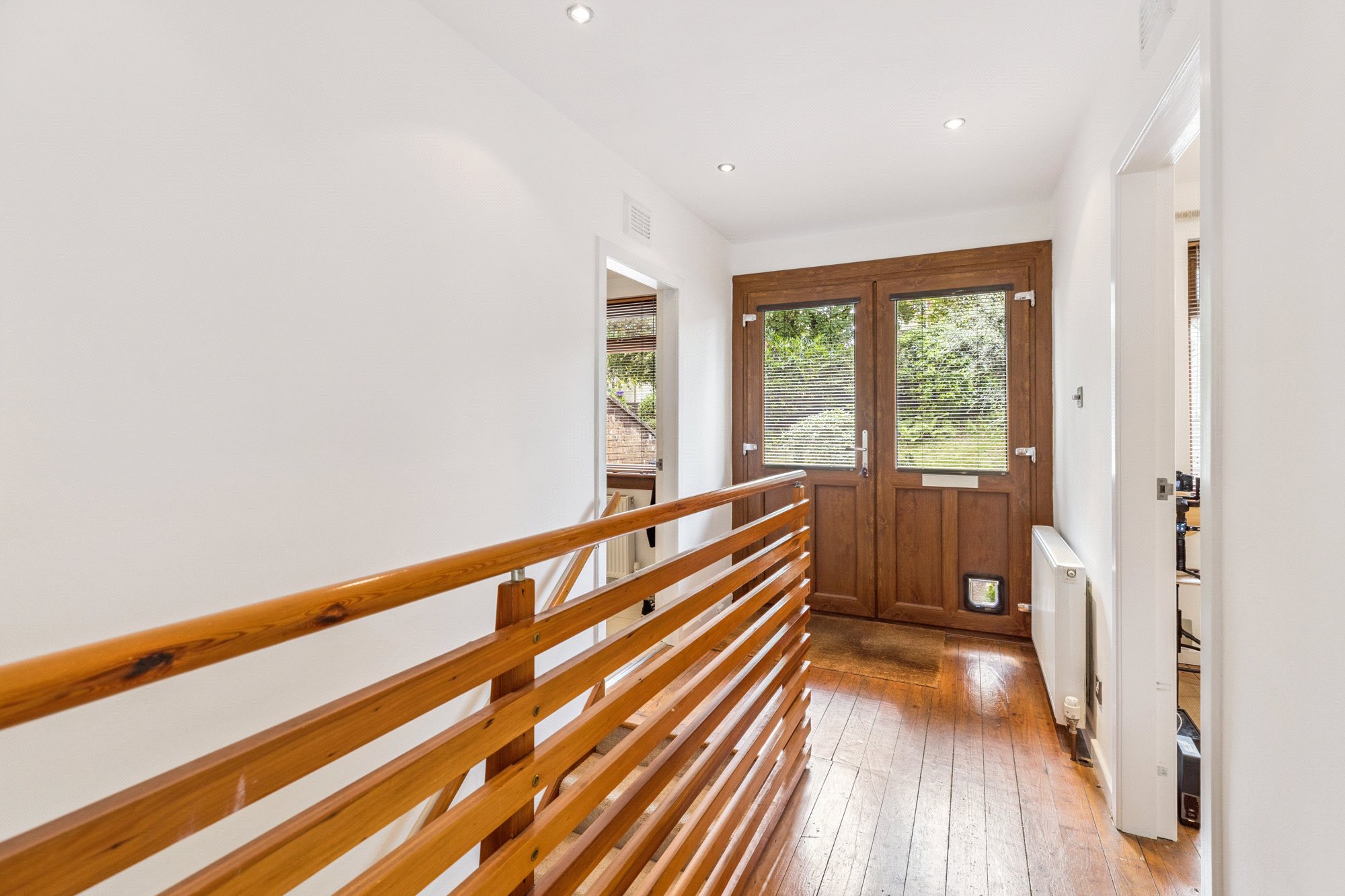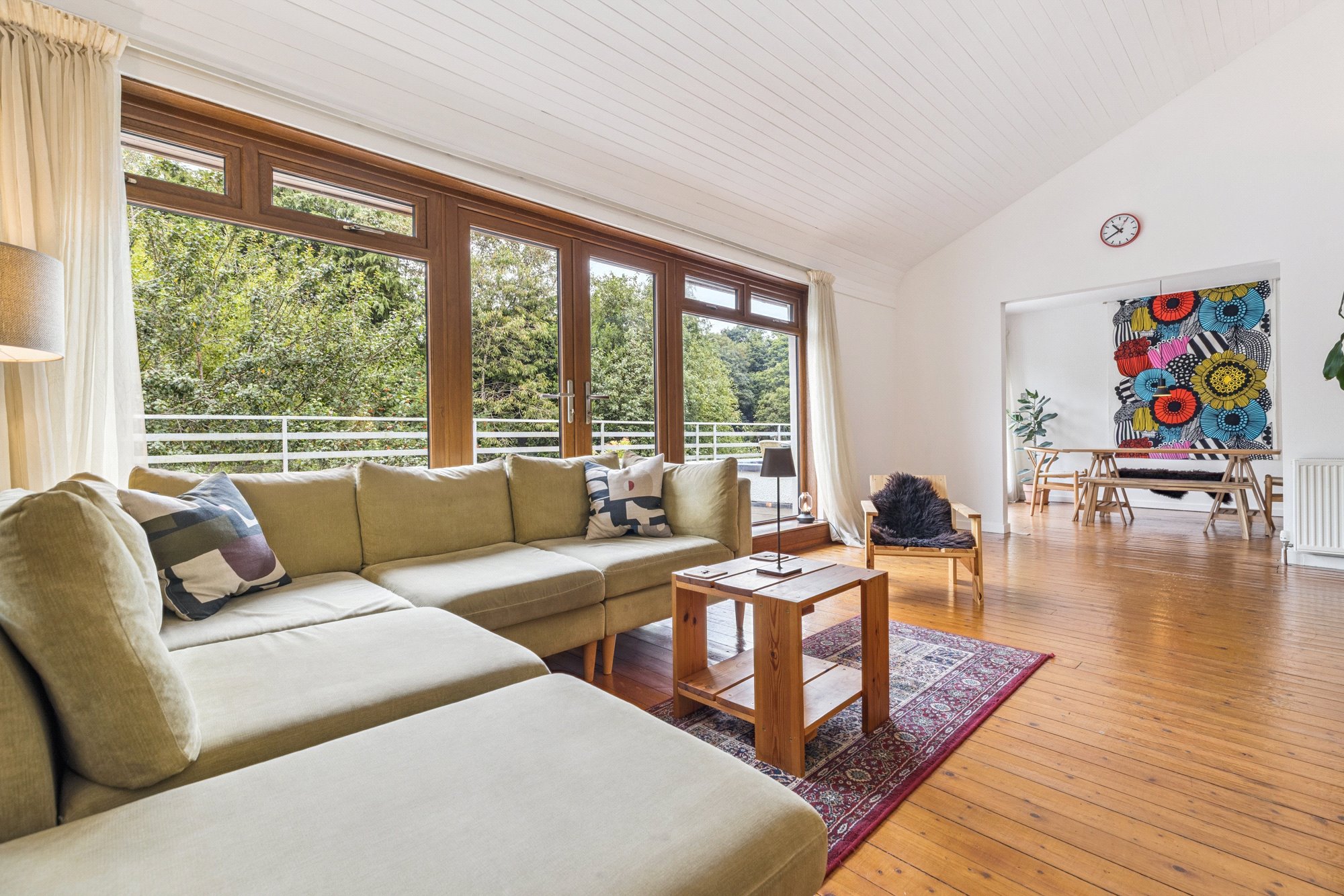 The ‘public’ accommodation is set on the entrance level, described by the architect as the ’living deck’ and includes - Entrance Hall. Lounge with lots of glass, French doors to the sun terrace and a feature barrel vaulted ceiling. Dining room open plan to the lounge and with French doors also to sun terrace. The two sun terraces/decks leading off both the lounge and the dining room. A home office or snug or bedroom 4. Kitchen where the cabinets have solid oak fronts by Winchmore of Suffolk. Against these are more modern grey coloured, concrete style, laminate work surfaces and a contemporary, almost commercial style, wall panels in a grey metal effect, all offset by quality Amtico flooring. Shower room (renewed in 2022) and with powerful thermostatic shower. On this level is the garage, integral to the house, nicely set under the pitch of the roof.