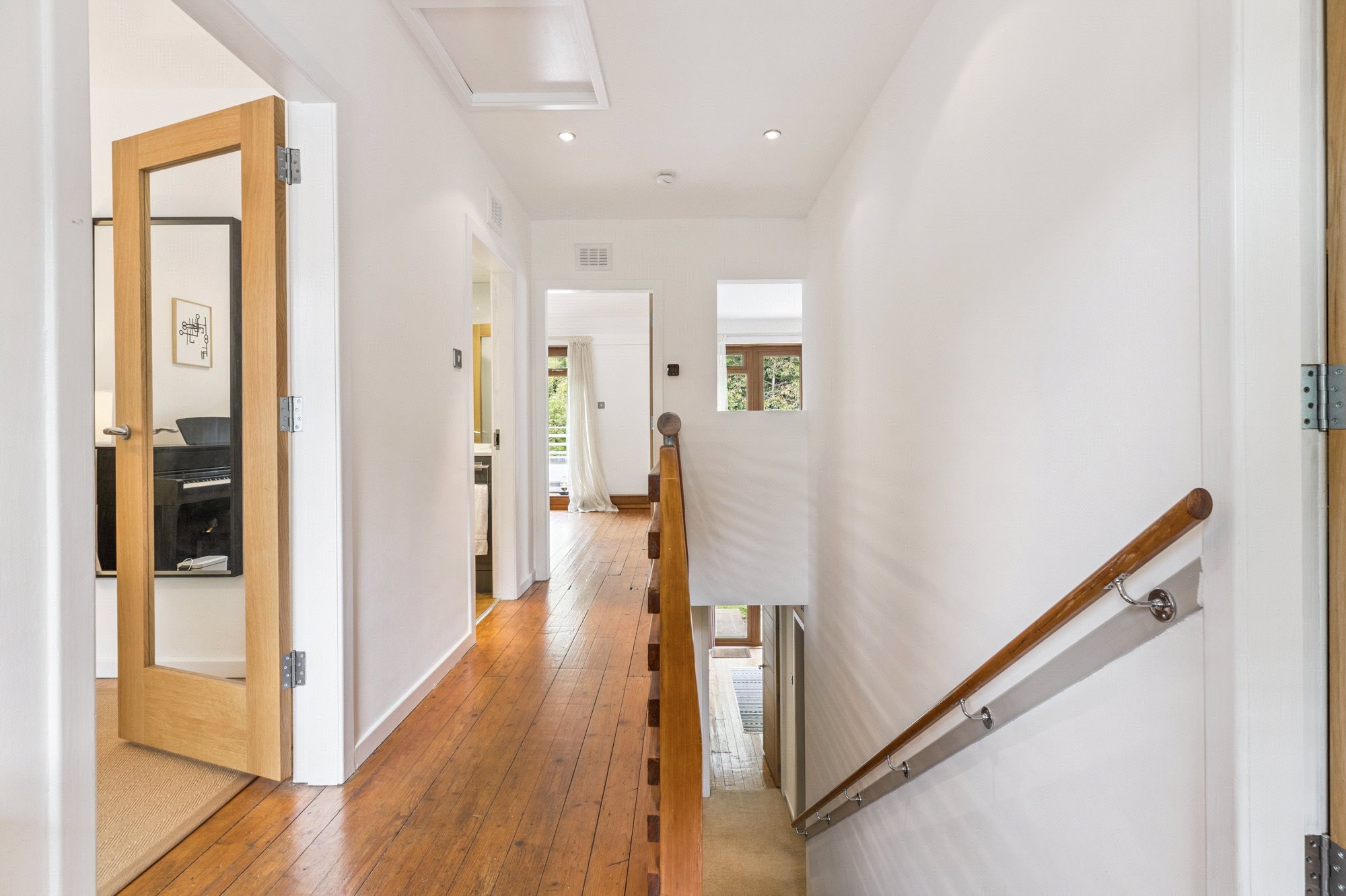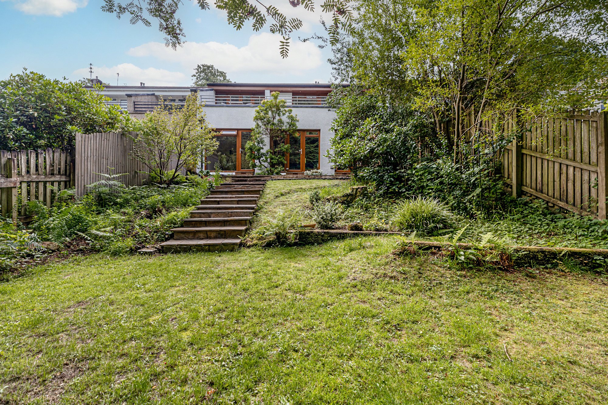 The seven ‘Deck Houses’, designed by the admired architect Murray Russell, were built in the 1970s as a ‘Concept for Living’ project that provides a very appealing alternative to mainstream architectural norms. They really are fantastic modern homes, still highly contemporary, and very cleverly designed. The key to the design is the discreet, even modest, single-storey front elevation that presents to the streetscape with the majority of the accommodation set to the rear where its two-storey elevation, with its super full-width sun deck, really conveys the size of the house and from which there is a very peaceful, and leafy, outlook over the gardens to trees.