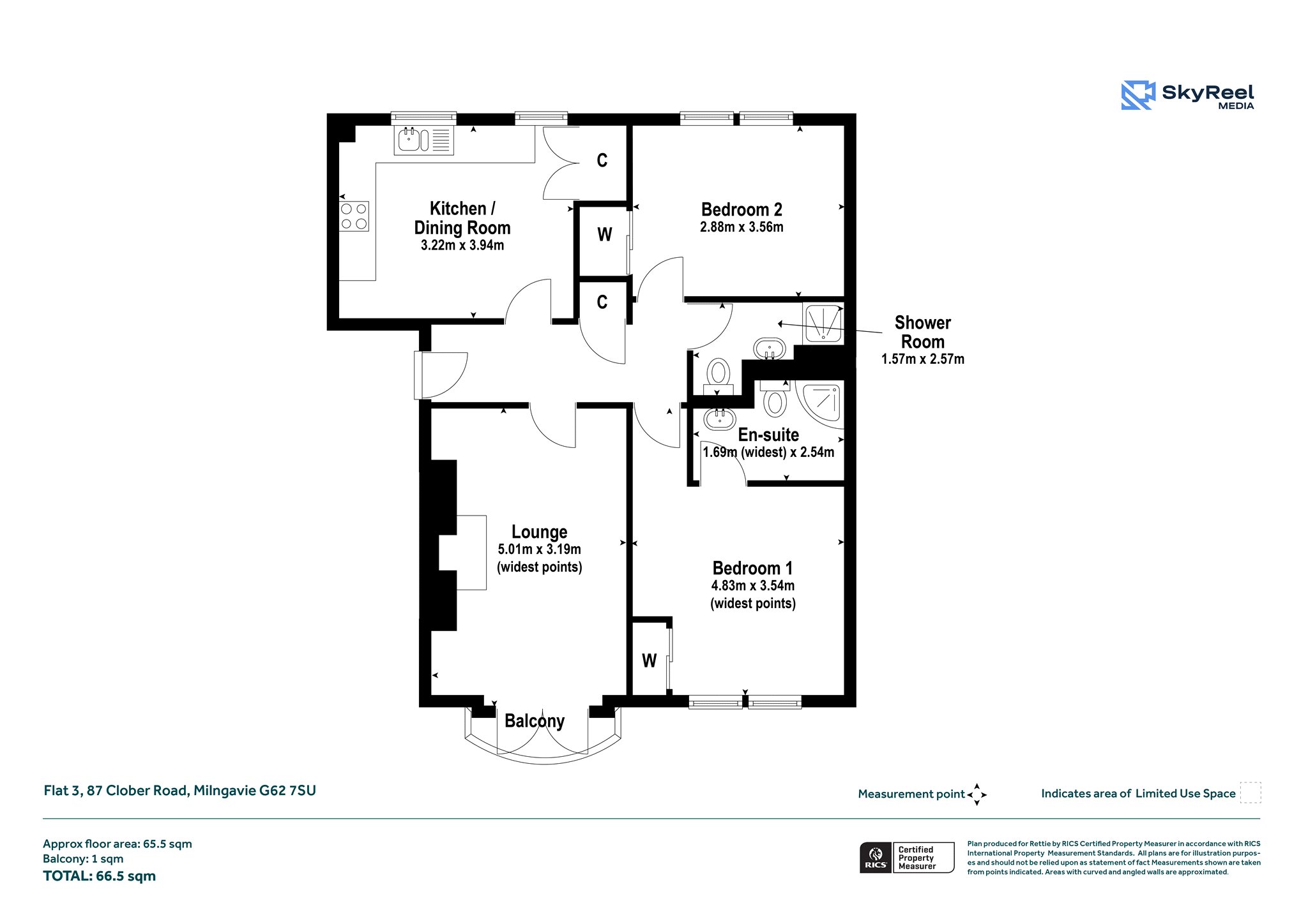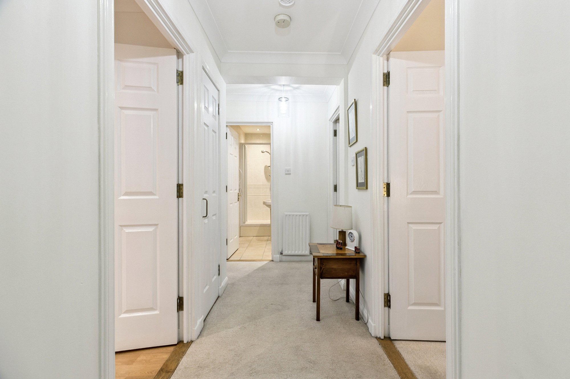 The apartment has been most attractively designed with the two bedrooms and the large kitchen having two windows (lots of light) and the lounge featuring French doors, and windows, to a “Paris” balcony. There are two shower rooms, one ensuite to the main bedroom. The size of the kitchen is quite a surprise - a fine rectangular shaped room with space for table and chairs and two windows facing westwards. Windows in the apartment, and the French doors, are double glazed and there is a mains gas central heating system with the lounge fireplace featuring a living flame coal effect gas fire (not tested).