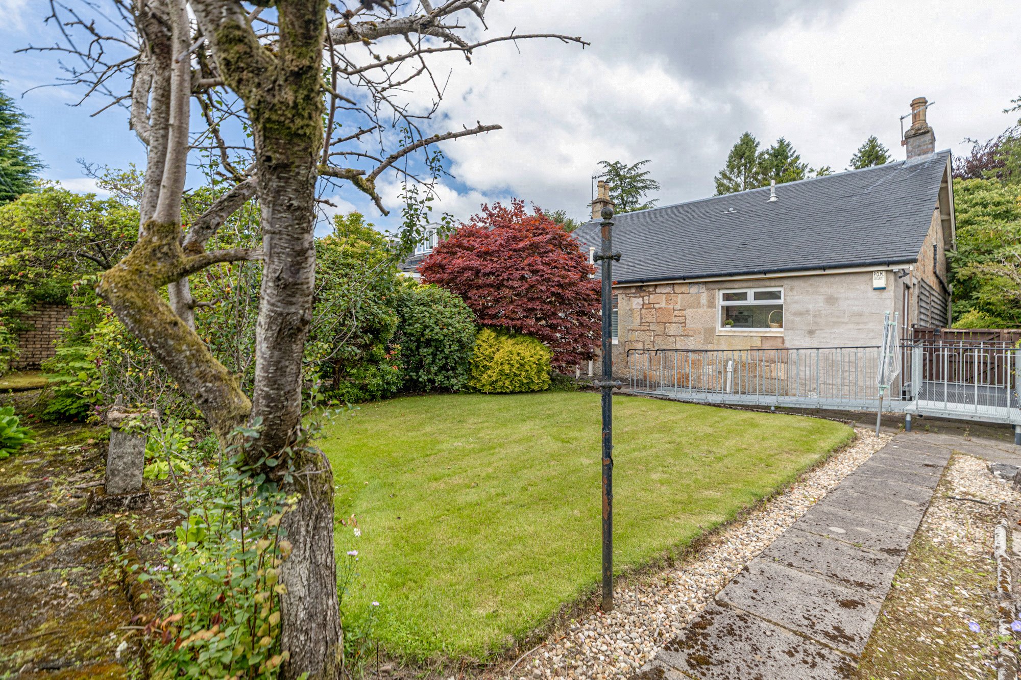The rear garden is not too large and is a lovely, south facing, space with two patios, lawn, established beds that includes a fine Acer, and with a small brick garden shed to the east side of the house where there is a gate and path. There is, currently, a disability ramp across the back of the house to the kitchen back door – provided by East Dunbartonshire Council this will be removed by them, for recyling, and the process for removing is in hand and should be removed in advance of entry date.