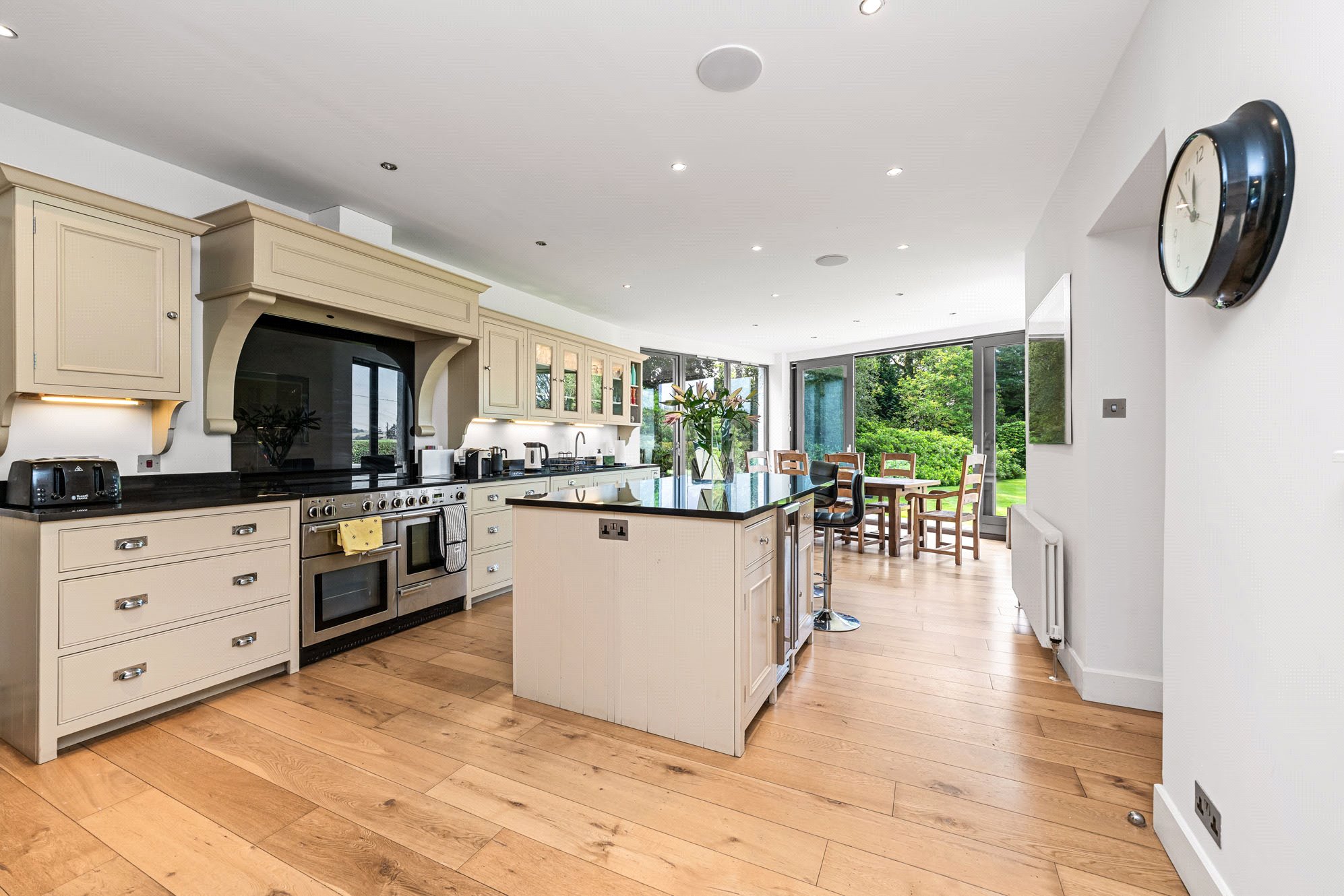 In the Arts and Crafts style, with white harled walls and slate roof, and dating from just after the turn of the 20th century, the accommodation is arranged over three floors and has been upgraded to an exacting standard by the current owners who took ownership in 2010. The ground floor flows beautifully, with two formal reception rooms, alongside a generous family kitchen with a spacious dining area, featuring a gorgeous Neptune kitchen (high-end bespoke company), painted in eggshell limestone and with granite tops, including a large centre island – very much the heart of the home. Large windows and glazed doors maximise natural light and create a strong connection with the surrounding gardens.