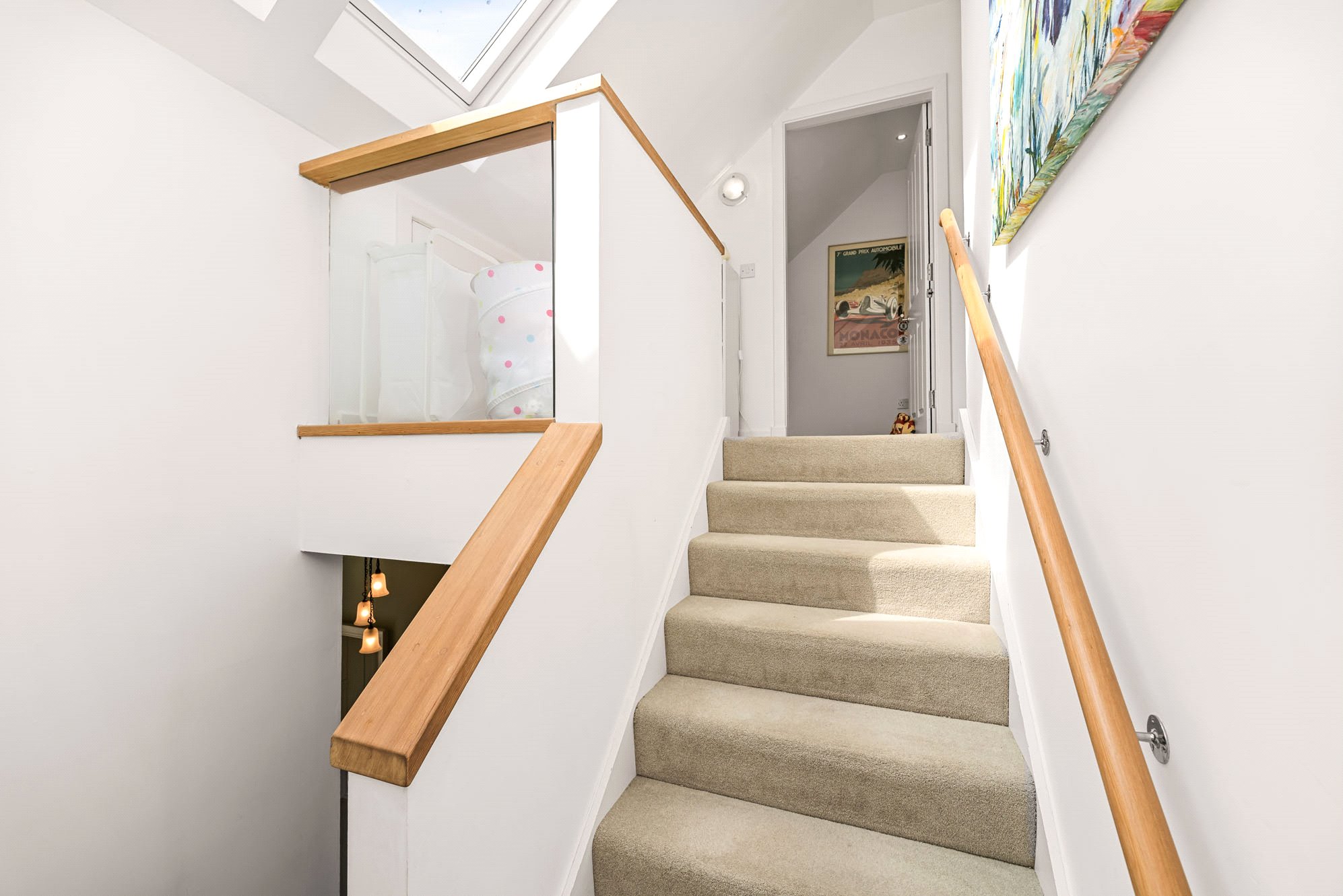 Accessed by a superbly designed curving staircase to a bright (two large Velux windows) upper landing with contemporary glass balustrade. Bedrooms 3 & 4 (Bed 3 rather cool and one a teenager would love). Bathroom.