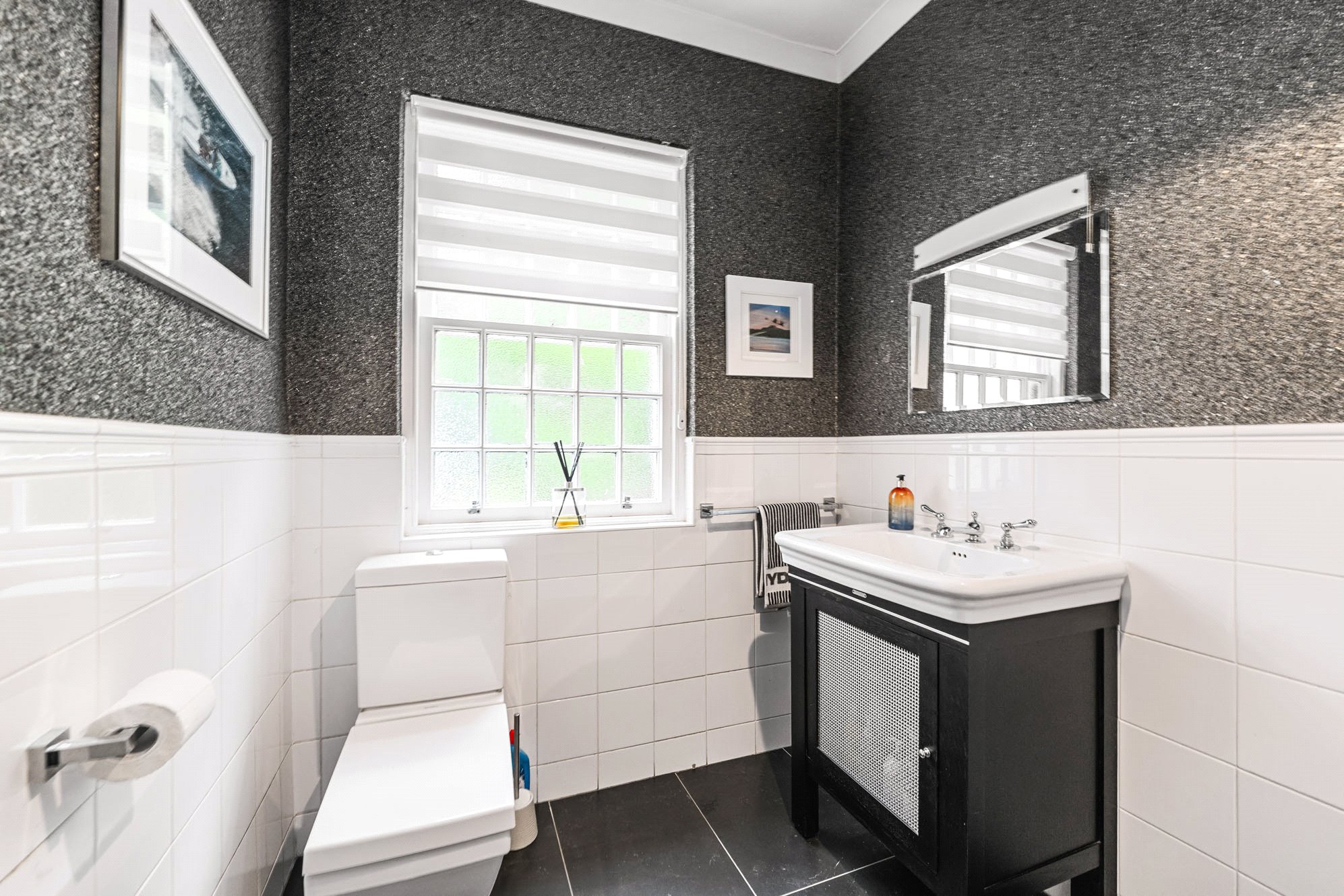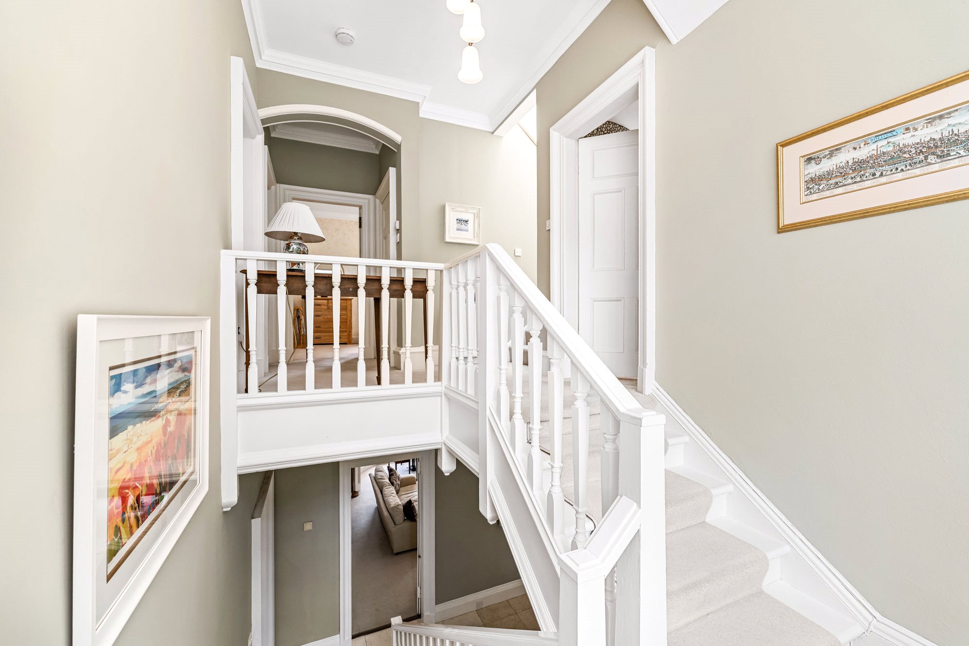 Hall with cupboard and linen store. Bedroom 1 with ensuite shower room. Bedroom 2. Bedroom 5 (used as a home office). Bathroom – feature curved wall, finished in pebble, and 4-piece suite.